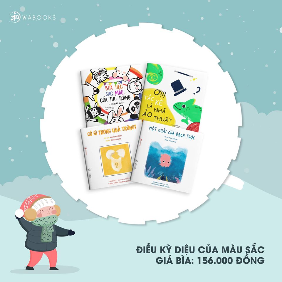 BỘ SÁCH :ĐIỀU KÌ DIỆU CỦA MÀU SẮC Số lượng: 4 cuốn Số lượng trang sách: 24 trang (không kể bìa) Khổ giấy: 20 x 20cm Nhà xuất bản: Lao động- Xã hội Độ tuổi: 0 – 6 tuổi Bộ “Điều kỳ diệu của màu sắc” do Wabooks xuất bản bao gồm 4 cuốn: Bữa tiệc màu sắc của thú trắng. Ơ! Tắc kè là nhà ảo thuật. Một ngày của bạch tuộc. Có gì trong quả trứng. Bộ sách giúp bé phát triển Thùy Chẩm ( phần não bộ có vai trò tiếp nhận thông tin bằng mắt như hình ảnh, biểu đồ, ảnh hưởng đến khả năng nghệ thuật của con. Việc phát triển thùy chẩm giúp bé lớn lên sẽ có khiếu thẩm mỹ rất tốt. Nội dung từng cuốn: Bữa tiệc màu sắc của thú trắng. Kích thích khả năng nhận diện màu sắc của bé thông qua sự biến đổi của mỗi bạn thú trắng sau khi ăn các trái cây và màu của các bạn cũng bị biến đổi theo màu của trái cây đó. Bữa tiệc các loại hoa quả, các loài vậy ăn quả nào biến thành màu quả đó (gấu trúc ăn dâu tây thành màuđỏ.Hổ trắng ăn táo xanh thành màu xanh, thỏ trắng anh ăn cà rốt thành cam. Để trở lại bình thường, họ làm gì? Uống sữa bò. Mọi người lại trở thành màu trắng. Ơ! Tắc kè là nhà ảo thuật. Không chỉ giúp bé nhận diện màu sắc, cuốn sách còn dạy cho bé nhận diện các trái cây xung quanh qua cuộc phiêu lưu của bạn tắc kè. Tắc kè đi đâu có màu nơi đó ( ăn cà chua cáo màu đỏ, đi với ngựa vằn có màu trắng đen, đi vườn hồng có màu hồng, ăn cam có màu cam, đi với cô hươu cao cổ nên có màu vàng nâu, đi với bươm bướm tạo nên có màu sặc sỡ giống bướm, đi ăn chuối nên có màu vàng, đi với cáo nên có đốm đen, đi chơi với cá heo có màu xanh biển, đi ngắm cầu vồng nên có màu cầu vồng, đi gặp bố mẹ nên có hình trái tim, tắc kè hạnh phúc, hạnh phúc). Có gì trong quả trứng. Mở rộng khái niệm về màu sắc cho bé với sự xuất hiện bất ngờ của các con vật, tương ứng với những quả trứng nhiều màu sắc. Quả trứng màu vàng nở ra chú vịt lông vàng, quả trứng màu đỏ nở ra chú bọ cánh cam màu đỏ… Một ngày của bạch tuộc. Cuốn sách kể về hành trình khám phá những đặc điểm của các bạn sinh vật của Bạch Tuộc tinh nghịch qua những trải nghiệm thú vị về thế giới màu sắc dưới lòng đại dương. Chú bạch tuộc gặp những bạn động vật nhỏ dưới nước và bắt chước màu sắc của từng loài, Gặp chú sao biển màu cam, bạch tuộc liền biến thành màu cam, gặp Sứa màu trong suốt liền biến thành màu trong suốt.