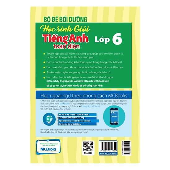 Bộ Đề Bồi Dưỡng Học Sinh Giỏi Tiếng Anh Toàn Diện Lớp 6 Trong chương trình học từ tiểu học đến trung học phổ thông, tiếng Anh luôn là một trong số những môn học chính và giữ vai trò quan trọng trong kết quả học tập của học sinh. Các em đang là học sinh lớp 6 và các em: Mong muốn tham gia các kỳ thi học sinh giỏi để có thể thử sức mình Muốn tăng cao trình độ và có thêm nhiều cơ hội cọ xát với các kỳ thi Thế nhưng các em lại đang thiếu đi những cuốn tài liệu để có thể ôn tập tốt và chuẩn bị sẵn sàng bước vào kỳ thi. Với mong muốn các em học sinh lớp 6 đều có thể trang bị tốt kiến thức, chúng tôi xin giới thiệu tới các em học sinh lớp 6 cuốn sách “Bộ đề bồi dưỡng học sinh giỏi tiếng Anh toàn diện – Lớp 6”. Cuốn sách được biên soạn với mục đích giúp các em học sinh nâng cao kiến thức ngôn ngữ và kỹ năng giao tiếp tiếng Anh, chuẩn bị cho các kỳ thi học sinh giỏi Tiếng Anh. Hãy cùng xem cuốn sách ““Bộ đề bồi dưỡng học sinh giỏi tiếng Anh toàn diện – Lớp 6” có gì đặc biệt đối với các em học sinh lớp 6. Cuốn sách bao gồm các đề thi được tuyển chọn, bám sát nội dung học tập trong chương trình Tiếng Anh lớp 6, và theo dạng đề thi của các kỳ thi học sinh giỏi của các trường trong cả nước. Bộ đề bồi dưỡng học sinh giỏi tiếng Anh toàn diện – Lớp 6 được chia thành 4 phần, cung cấp, tổng hợp các kiến thức cần chú ý trong bài thi. Điểm nổi trội của cuốn sách là ngoài việc cung cấp cho học sinh cơ hội thực hành các dạng bài thi, cuốn sách còn chú trọng vào 4 kỹ năng theo chủ điểm giúp học sinh có cơ hội luyện tập toàn diện kỹ năng ngôn ngữ. – PHẦN 1 – COLLECTION OF TESTS: gồm 20 đề thi cung cấp cho các em một hệ thống đề ôn luyện bao gồm các dạng bài tập nâng cao bao trùm các chủ điểm kiến thức và kỹ năng ngôn ngữ trong chương trình lớp 6. Mỗi đề thi bao gồm 6 phần, chia thành 40 câu và một bài viết, tập trung bồi dưỡng nâng cao ngữ âm, từ vựng; ngữ pháp, và 4 kỹ năng (nghe – nói – đọc – viết). Các dạng bài tập có sự phân loại theo mức độ khó dần để giúp các em dễ dàng nắm bắt, tiếp cận và ghi nhớ các phương pháp giải bài tập một cách khoa học, hiệu quả nhất. Bên cạnh đó, qua việc làm các đề tổng hợp, các em có thể tự đánh giá kết quả học tập của chính mình, trên cơ sở đó có thể tự bổ sung kiến thức còn thiếu, điều chỉnh lại phương pháp ôn tập cho phù hợp, để giúp các em tự tin hơn trong các kỳ thi của mình. – PHẦN 2 – KEY: Cung cấp đáp án của 20 bài test. Sau khi hoàn thành mỗi bài, các em học sinh có thể tự mở đáp án và ghi lại số câu trả lời đúng của mình. Qua đó các em học sinh hoàn toàn có thể tự đánh giá được trình độ tiếng Anh của bản thân. – PHẦN 3 – USEFUL LANGUAGE: Trình bày những điểm kiến thức chắt lọc nhất từ mỗi bài test mà các em cần nhớ. – PHẦN 4 – AUDIO SCRIPT: Cung cấp lời các bài nghe cho mỗi track. Học cùng ứng dụng thông minh của MCBooks: Khi sở hữu cuốn sách này các em học sinh lớp 6 sẽ có cơ hội được trải nghiệm hệ sinh thái học ngoại ngữ lần đầu tiên xuất hiện tại Việt Nam: MCplatform. Phần nghe với giọng phát âm chuẩn của người bản ngữ được tích hợp vào ứng dụng cực kỳ tiện lợi. Chỉ cần mở app và quét mã QR là các em đã có thể học cùng cuốn sách này thông qua ứng dụng. Cơ hội luyện đề thi trực tuyến: Thêm một lợi ích nữa mà các em sẽ nhận được từ cuốn sách này chính là các đề test trên website Bộ đề bồi dưỡng học sinh giỏi tiếng Anh toàn diện – Lớp 6 vừa giúp các em có cơ hội rèn luyện thêm nhiều bài tập nâng cao và tự tổng hợp lại các kiến thức trọng tâm qua từng bài. Thông qua cuốn sách này các em học sinh lớp 6 đều hoàn toàn tự tin tham gia các kỳ thi học sinh giỏi. Các bậc phụ huynh hãy nhanh tay đặt mua cuốn sách này cho con em mình nhé! Chúc các em sử dụng cuốn sách một cách hiệu quả để đạt kết quả cao nhất trong quá trình học tập và trong các kỳ thi học sinh giỏi cấp trường, thành phố, và quốc gia.