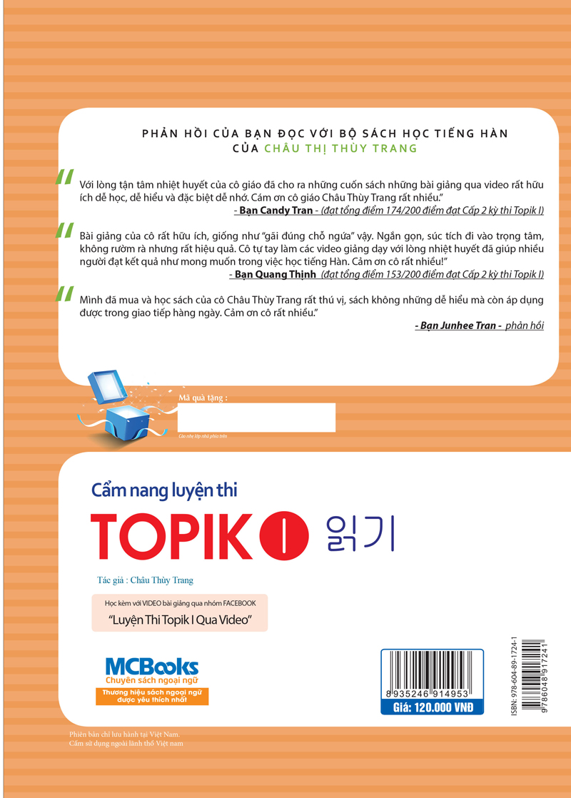 Bạn đang thiếu bằng Topik để xin việc tại các tập đoàn lớn của Hàn Quốc như Samsung, Huynhdai, Lotte, với mức lương hàng nghìn đô. Bạn đang cần một chứng chỉ Topik để xin học bổng du học tại các trường đại học, học viện tại xứ sở kim chi. Bạn là người yêu thích văn hóa Hàn Quốc, bạn yêu KPOP, yêu các bộ phim Hàn Quốc và muốn tham gia tổ chức những sự kiện giao lưu giữa hai nước Việt – Hàn nhưng chỉ vì không có bằng Topik nên bạn không thể làm được những việc mình mong muốn. Có chứng chỉ Topik các bạn sẽ tăng được nhiều lợi thế cạnh tranh của mình, bạn có thêm nhiều cơ hội đi du học, làm việc và du lịch tại đất nước xinh đẹp này. Topik I tương đương với trình độ topik cấp 2 trở xuống, là hai cấp cơ bản nhất trong topik. Giới thiệu về kì thi Topik Topik là kỳ thi dành cho tất cả những người sử dụng tiếng Hàn như ngôn ngữ thứ hai. Bài thi gồm 2 tiêu chuẩn là Topik I và Topik II với 6 cấp độ đánh giá từ cấp 1 đến cấp 6. Topik I tương đương với trình độ người học đang nằm ở cấp 1 hoặc cấp 2. Người học sẽ vượt qua các cấp bậc nếu: – Cấp 1: Thuần thục kĩ năng ngoại ngữ cơ bản cần thiết cho đời sống như giới thiệu bản thân, mua sắm, gọi món ăn,… Khả năng hiểu và diễn đạt những nội dung liên quan đến chủ đề hết sức gần gũi như thời tiết, gia đình, Có khả năng hình thành câu đơn giản dựa trên nền tảng sự hiểu biết về ngữ pháp cơ bản và khoảng 800 từ vựng cơ bản. Bên cạnh đó có khả năng hiểu và diễn đạt văn phong sinh hoạt ứng dụng đơn giản. – Cấp 2: Thuần thục kĩ năng cần thiết khi sử dụng thiết bị công cộng (ngân hàng, bưu điện) hay khi nhờ cậy, gọi điện. Hiểu và sử dụng vốn từ vựng 1500 – 2000 từ để cấu thành câu văn với đề tài gần gũi, cụ thể. Có khả năng phân biệt và sử dụng từ vựng trong hoàn cảnh trang trọng và không trang trọng. Vậy những lí do nào đang ngăn cản các bạn ngăn cách với tấm bằng Topik I? Thị trường thiếu những đầu sách chuyên sâu về luyện thi Topik I Thị trường sách Việt Nam hiện nay có rất nhiều đầu sách tham khảo đa dạng về nội dung và hình thức nhưng lại thiếu đi những cuốn sách chuyên sâu về luyện thi Topik I. Các bạn đang mong mỏi có được một tài liệu giúp ôn tập tốt cấp độ này và tổng hợp được toàn bộ kiến thức tương đương. Bạn cần ôn thi cấp tốc để vượt qua Topik I Bạn chỉ có 3 – 6 tháng để ôn thi và đạt được các chứng chỉ Topik cấp 1 hoặc cấp 2. Thời gian có hạn trong khi đó lượng kiến thức lại rất rộng lớn. Bạn mong muốn tìm ra được phương pháp giúp bạn bứt phá điểm thi trong thời gian ngắn nhất. Bạn không tìm được lộ trình luyện thi đúng đắn Việc ôn thi Topik là cả một quá trình và không thể nóng vội. Bạn cần có một lộ trình khoa học để ôn tập hết các kiến thức trọng tâm thường xuất hiện trong đề thi. Nhưng điều đó với bạn lại không hề dễ dàng. Đây là những vấn đề gây nhiều “nhức nhối” đối với các bạn đang học tiếng Hàn. Cuốn Cẩm nang luyện thi Topik I là một cuốn sách ngắn gọn, súc tích đi vào trọng tâm và hoàn toàn hiệu quả đối với người học. Cung cấp vốn từ vựng cần thiết khi đi thi Topik I Đây là phần từ vựng theo chủ đề thường gặp trong Topik I. Từ vựng được liệt kê tỉ mỉ, được phân chia theo từ loại và theo từng chủ đề nhằm giúp các bạn có thể học và nhớ từ vựng dễ dàng. Ngoài ra các bạn còn nhận được một quyển từ vựng nhỏ, tổng hợp hơn 600 từ vựng. Quyển từ vựng khá là nhỏ gọn các bạn có thể mang theo bên mình và học mọi lúc mọi nơi vô cùng thuận tiện. 52 mẫu câu ngữ pháp thường gặp trong Topik I Các bạn sẽ được làm quen với các mẫu ngữ pháp thường xuất hiện trong Topik I. Mỗi dạng ngữ pháp đều được giải thích chi tiết bằng tiếng Việt và có nhiều câu ví dụ kèm theo giúp các bạn nắm chắc được từng loại ngữ pháp. Luyện kỹ năng giải đề Topik I Đề thi được phân tích theo từng dạng câu hỏi giúp các bạn nắm vững kiến thức và tự tin khi trực tiếp dự thi. Các bạn sẽ được làm quen với các đề thi mẫu và luyện tập giải đề qua 16 dạng bài thường xuất hiện trong đề thi. Mỗi dạng câu hỏi đều được phân tích kĩ cùng bảng từ vựng kèm theo sẽ tiết kiệm được thời gian tra từ điển của bạn. Học cùng Video bài giảng qua Facebook Sở hữu cuốn sách các bạn còn nhận được các video bài giảng qua nhóm facebook “Luyện thi Topik I qua video”. Đây là cơ hội tuyệt vời để các bạn có thể trao đổi các vấn đề về kỳ thi Topik với các giáo viên và các bạn cũng đang luyện thi Topik. Với mong muốn có thể hỗ trợ các bạn học tập tốt cuốn sách này sẽ tặng thêm cho các bạn cuốn cẩm nang luyện thi Topik I. Cẩm Nang Luyện Thi Topik I Cẩm nang luyện thi Topik I là tài liệu hữu ích với các bạn đang luyện thi Topik I. Vừa được h