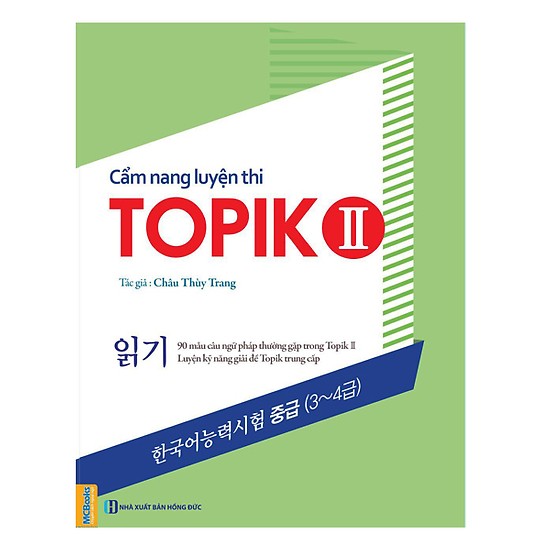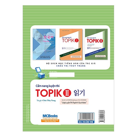 Cẩm Nang Luyện Thi Topik II Bạn đang thiếu chứng chỉ Topik cho việc học tập hoặc làm việc? Bạn cần một phương pháp độc đáo để học luyện thi Topik hiệu quả nhất? Bạn đang tìm kiếm những tài liệu ôn thi Topik cực chất để nâng cao trình độ tiếng Hàn một cách nhanh chóng? Bạn chỉ còn 3 – 6 tháng để thi đậu Topik II để ra trường, xin học bổng du học hoặc xin vào những công ty lớn của Hàn Quốc với mức lương nghìn đô như Sam Sung, Lotte,…. Topik tiếng Hàn là tấm vé để thực hiện ước mơ và mở ra tương lai đầy những cơ hội tuyệt vời cho bạn. Vậy những lí do nào đang ngăn cách bạn với Topik II Bạn chưa nắm được hình thức và cấu trúc đề thi Kì thi đang tới gần nhưng bạn chưa nắm được bắt được hình thức thi cũng như chưa biết gì về cách thức để làm các dạng đề thi. So với Topik I, Topik II từ cấp 3 trở lên đã có nhiều thay đổi về cấu trúc đề thi cũng như tiêu chuẩn để đạt được các chứng chỉ. Thị trường thiếu những đầu sách chuyên sâu về luyện thi Topik II Thị trường sách Việt Nam hiện nay có rất nhiều đầu sách tham khảo đa dạng về nội dung và hình thức nhưng lại thiếu đi những cuốn sách chuyên sâu về luyện thi Topik II. Các bạn đang mong mỏi có được một tài liệu giúp ôn tập tốt cấp độ này và tổng hợp được toàn bộ kiến thức tương đương. Bạn cần ôn thi cấp tốc để vượt qua Topik I Bạn chỉ có 3 – 6 tháng để ôn thi và đạt được các chứng chỉ Topik từ cấp 3 trở lên. Thời gian có hạn trong khi đó lượng kiến thức lại rất rộng lớn. Bạn mong muốn tìm ra được phương pháp giúp bạn bứt phá điểm thi trong thời gian ngắn nhất. Bạn không tìm được lộ trình luyện thi đúng đắn Việc ôn thi Topik là cả một quá trình và không thể nóng vội. Bạn cần có một lộ trình khoa học để ôn tập hết các kiến thức trọng tâm thường xuất hiện trong đề thi. Nhưng điều đó với bạn lại không hề dễ dàng. Bạn muốn đạt được các chứng chỉ Topik nhưng bạn vẫn chưa tìm được cách giải quyết các vấn đề trên. Những gì mà bạn cần là học cùng cuốn sách “Cẩm nang luyện thi Topik II”. Cuốn sách sẽ hỗ trợ cho các bạn nắm vững được những kiến thức liên quan đến kỳ thi năng lực tiếng Hàn. Cung cấp các kiến thức liên quan đến kì thi Đừng lo lắng nếu bạn còn chưa có nhiều hiểu biết về kì thi vì phần đầu cuốn sách đã cung cấp cho các bạn những thông tin quan trọng nhất về kì thi Topik II. Topik II tương đương với bạn sẽ có trình độ tiếng Hàn từ cấp 3 đến cấp 6, yêu cầu của người học với từng cấp độ cũng khác nhau, trong đó cấp 6 được xem là cấp cao nhất. Ngoài ra tác giả còn cung cấp các thông tin về cấu trúc đề thi theo tiêu chuẩn nhằm giúp các bạn có những hình dung về kì thi dễ dàng. Cung cấp 90 mẫu câu ngữ pháp thường gặp trong Topik II Các bạn sẽ được làm quen với các mẫu câu ngữ pháp thường xuất hiện trong Topik II. Mỗi dạng ngữ pháp đều được giải thích bằng tiếng Việt và có nhiều câu ví dụ kèm theo giúp các bạn nắm chắc được từng loại ngữ pháp. Thông qua đó các bạn sẽ biết cách sử dụng ngữ pháp và hiểu được ý nghĩa của từng ngữ pháp. Luyện kỹ năng giải đề Topik II Nhằm giúp các bạn nắm vững được hình thức cũng như cấu trúc đề, cuốn sách đã tạo cơ hội cho các bạn làm những đề thi Topik II mẫu. Đề thi được phân tích theo từng dạng câu hỏi giúp các bạn nắm vững được kiến thức và tự tin khi trực tiếp dự thi. Mỗi dạng câu hỏi đều được phân tích kĩ cùng bảng từ vựng kèm theo sẽ tiết kiệm thời gian tra từ điển cho các bạn. Bí quyết vượt qua kì thi Topik II một cách dễ dàng Quyển “Cẩm nang luyện thi Topik II” còn kem theo các bí quyết làm bài được giải thích ở mỗi dạng đề thi. Các bạn sẽ được luyện kỹ năng làm bài qua 9 dạng bài tập điển hình, các bài tập đều có đáp án giải bài chi tiết và bài bản nhằm giúp các bạn tiếp thu bài nhanh. Việc đạt chứng chỉ Topik chỉ từ 3 – 6 tháng không còn là vấn đề nữa. Quà tặng hỗ trợ quá trình học tập bổ ích Bên cạnh việc học thêm được nhiều kiến thức mới, sở hữu cuốn sách các bạn còn nhận được thêm rất nhiều lợi ích: – Tặng kèm sổ từ vựng 1000 từ thường gặp trong đề thi Nghe Topik II: Trong Topik II phần thi Nghe chiếm tới 1/3 số điểm trên tổng số điểm toàn bài thi. Cuốn từ vựng nhỏ gọn này đã liệt kê ra những từ vựng thường xuất hiện, trong quá trình ôn tập các bạn có thể sử dụng nó như một cuốn từ điển. Các bạn sẽ được học từ vựng thông qua những câu ví dụ cụ thể nhằm giúp các bạn ghi nhớ một cách nhanh nhất. – Tặng video bài giảng qua nhóm Facebook “Lớp luyện thi Topik II qua video”: Các bạn sẽ có cơ hội tương tác, trao đổi tài liệu cùng những bạn đang luyện thi Topik. – Mã quà tặng đặc biệt từ MCBooks Đây là một trong những cuốn sách hàng đầu tr