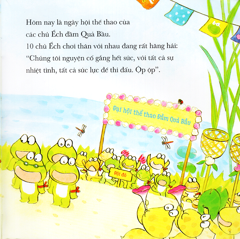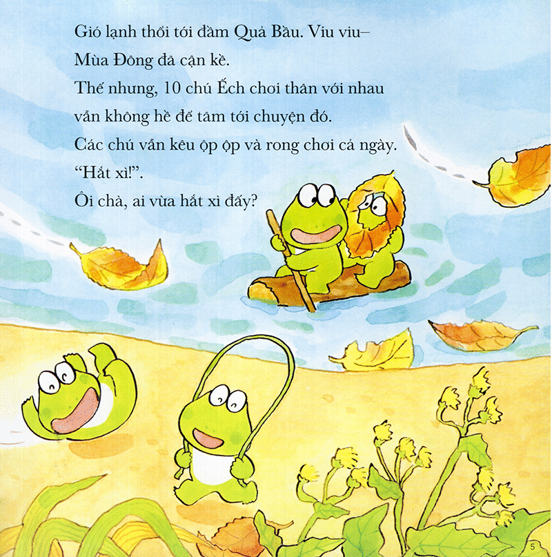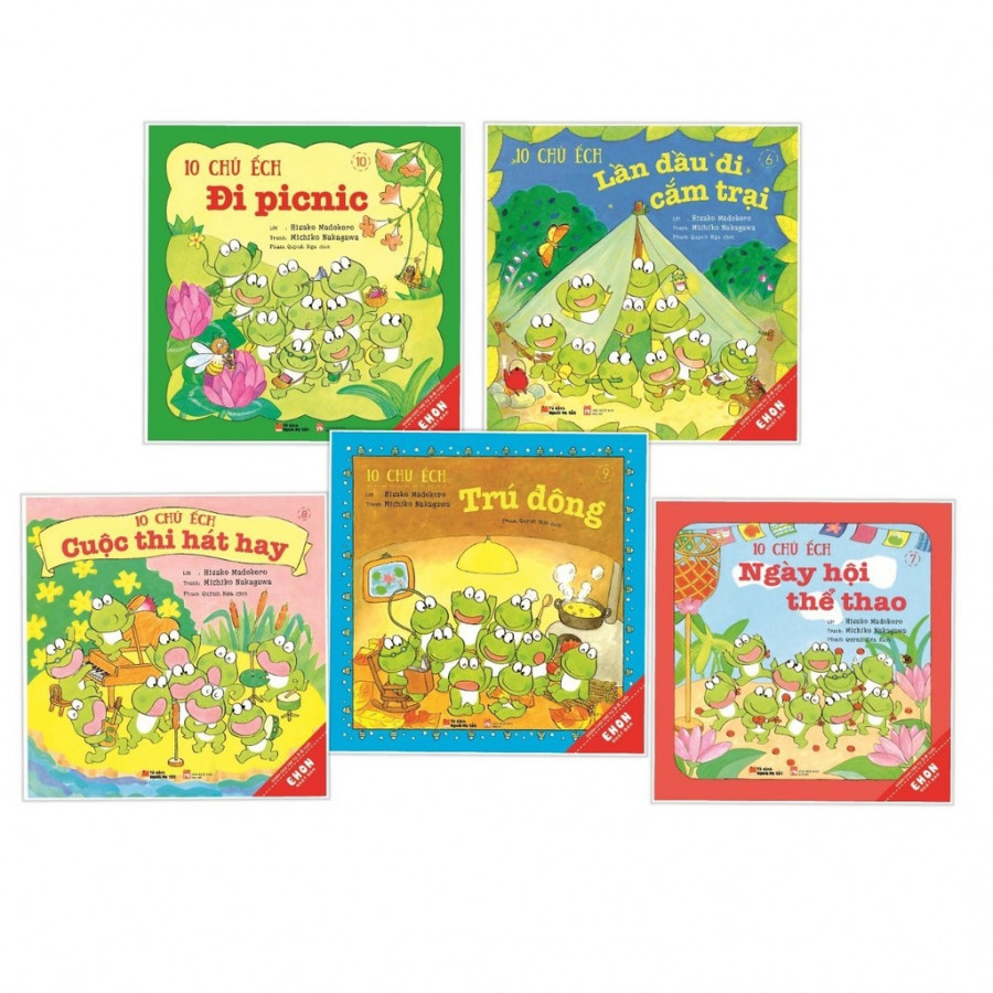 Truyện Ehon Nhật Bản – Lần Đầu Đi Cắm Trại Của 10 Chú Ếch (6) Một sáng mùa Hè ở đầm Quả Bầu. Chuồn Chuồn mang tin tới. Bãi cắm trại ở cao nguyên Gió Nhẹ năm nay sẽ mở cửa. 10 chú Ếch vô cùng háo hức cho lần cắm trại đầu tiên. Các chú tới thư viện Ếch tìm hiểu, rồi nhanh chóng bắt tay vào chuẩn bị. Đi cắm trại thì phải chuẩn bị những gì nhỉ? Lều lá sen này, lương thực này, nước uống này, củi đốt này… 10 chú Ếch đang quầy quần vui vẻ ăn cơm cari kiểu Ếch bên lều trại mới dựng thì bỗng nhiên, tiếng lao xao từ xa vọng lại. Chuyện gì xảy ra tiếp theo vậy? Đêm trại hè của 10 chú Ếch sẽ như thế nào? Truyện Ehon Nhật Bản – 10 Chú Ếch: Ngày Hội Thể Thao (7) Hôm nay là ngày hội thể thao của các chú Ếch đầm Quả Bầu. Mọi người đều rất háo hức, mong chờ. Ngay khi cuộc thi vừa bắt đầu thì một đám mây đen kịt kéo đế Có chuyện gì xảy ra vậy? Hóa ra là một cơn lốc xoáy đã cuốn tung mọi thứ lên, ông Ếch già và chiếc cúp bị gió thổi bay. Để tìm và giải cứu được ông Ếch già, 10 chú Ếch đã đoàn kết hợp sức với nhau và vượt qua quãng đường vô cùng khó khăn. Truyện Ehon Nhật Bản – 10 Chú Ếch Hát Hay (8) 10 chú Ếch thích hát nhận được thư mời tham dự “Hội thi hát các chú Ếch toàn quốc” được diễn ra tại ao Rộng Lớn. Con đường từ đầm Quả Bầu đến ao Rộng Lớn cần phải đi qua nơi ở của Tôm Càng và khu đầm Đáng Sợ. Thật không may, các chú bị đám Tôm Càng bắt được trên đường đi. Khó khăn nào sẽ đến với 10 chú Ếch đây? Các chú có thể tham dự được hội thi hay không? Các bé hãy theo dõi để xem 10 chú Ếch xử trí thế nào trong hoàn cảnh ngặt nghèo này! Truyện Ehon Nhật Bản – 10 Chú Ếch Trú Đông (9) Trải qua mùa Hè sôi động và vui vẻ, mùa Đông đầu tiên đang đến gần đầm Quả Bầu. Các chú vẫn mải miết rong chơi cả ngày mà không để ý chuẩn bị trú đông. Sau khi được ông Cá Chạch nhắc nhở, 10 chú Ếch liền nhanh chóng bắt tay vào chuẩn bị. Các chú hào hứng thiết kế nhà trú đông, chuẩn bị củi đốt, lương thực… Truyện Ehon Nhật Bản – 10 Chú Ếch Đi Picnic (10) Mùa Xuân đến trên khắp mọi nơi. 10 chú Ếch quyết định lên đường đi dã ngoại. Giữa bầu không khí vui vẻ ấm áp, bỗng các chú nghe văng vẳng có tiếng khóc của ai đó vọng lại. Ra là Chuột Con bị đi lạc, không những thế đuôi của Chuột Con lại còn bị thương nữa. 10 chú Ếch làm những gì để giúp Chuột Con đây? Đường đưa Chuột Con về nhà phải trải qua những khó khăn như thế nào?