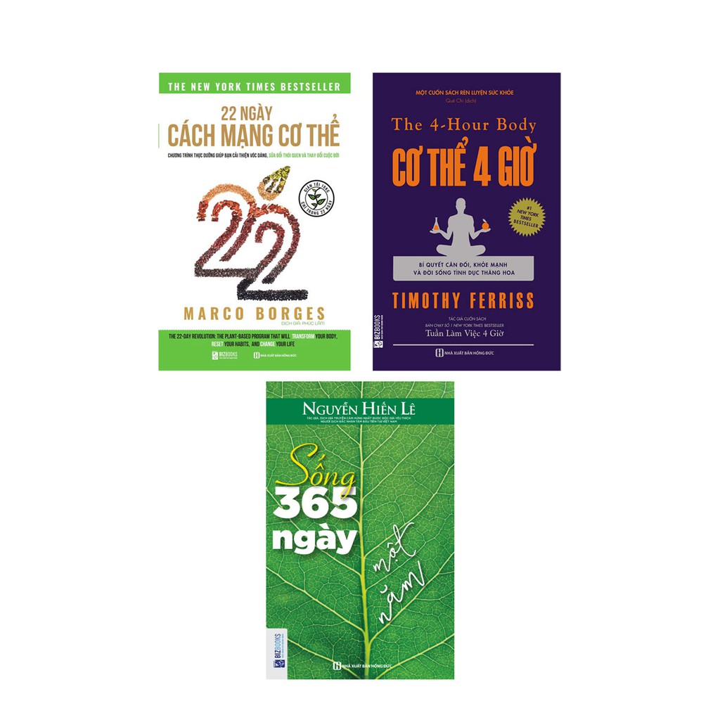 1. 22 Ngày Cách Mạng Cơ Thể Công ty phát hành: BIZBooks Tác giả: Marco Borges Nhà xuất bản: NXB Hồng Đức Năm xuất bản: 2019 Số trang: 344 Giới thiệu sách Cốt lõi của việc để có được một sức khỏe thể chất và một sức khỏe tinh thần tốt là thực hiện một chế độ ăn dựa trên thực vật. Ăn thực vật không chỉ giúp chúng ta giảm cân mà còn có thể ngăn ngừa hay đẩy lùi nhiều căn bệnh nguy hiểm. Chế độ ăn này sẽ giúp cho người theo đuổi nó sống cuộc sống mà họ muốn chứ không phải sống cuộc đời mà họ có. Cuốn sách 22 ngày cách mạng cơ thể sẽ giúp cho độc giả hiểu được những lợi ích của việc thực hiện chế độ ăn dựa trên thực vật, cung cấp những lời khuyên hữu ích cũng như chiến lược hữu hiệu để thành công với chương trình cách mạng 22 ngày. Bên cạnh đó cuốn sách còn cung cấp thực đơn chi tiết và nhiều bài tập cụ thể cho từng ngày một trong suốt cả chương trình 2. Cơ thể 4 giờ – Bí quyết cân đối khỏe mạnh và đời sống tình dục thăng hoa Công ty phát hành: BIZBooks Tác giả: Timothy Ferriss Nhà xuất bản: NXB Hồng Đức Năm xuất bản: 2019 Số trang: 580 Giới thiệu sách: Điều quan trọng nhất trong cuộc sống? Nếu người ta hỏi một người trong cơn đói, đó sẽ là thực phẩm. Với một kẻ nào đang lạnh, đó sẽ là hơi ấm. Và nếu một ai đang cam chịu cô đơn, chắc chắn đó sẽ là sự gần gũi với người khác. Với một người đang ốm đau thì đó sẽ là sức khỏe. Trong cuộc sống này, không có gì quan trọng cho bạn bằng chính con người bạn, một thân thể không bệnh tật, một tâm hồn không loạn đó là chân hạnh phúc của con người. Có câu nói: “Người có sức khỏe có một trăm ước muốn, người không có sức khỏe chỉ có 1 ước muốn duy nhất: đó là sức khỏe”. Không phải đương nhiên mà mỗi người chúng ta được sở hữu một thân thể khỏe mạnh. Đó phải là kết quả của quá trình gìn giữ và rèn luyện thường xuyên trong sinh hoạt hàng ngày. Để khởi đầu cho mục tiêu có một sức khỏe tốt, có một cuốn sách mà sẽ giúp bạn có một cơ thể khỏe mạnh bằng những phương pháp luyện tập khoa học, có căn cứ và đo lường được kết quả – Cơ thể 4 giờ – Bí quyết cân đối, khỏe mạnh và đời sống tình dục thăng hoa – The 4-hour body. 3. Sống 365 ngày một năm Công ty phát hành BIZBOOKS Tác giả Nguyễn Hiến Lê Nhà xuất bản Hồng Đức Năm xuất bản 2019 Số trang 197 Giới thiệu sách Cuốn sách đem đến một suy nghĩ mới hoàn toàn về cách giữ sức khỏe lành mạnh, đưa ra nguyên nhân chủ yếu để gây bệnh là do tinh thần, cảm xúc tiêu cực. Cuốn sách sẽ giúp bạn: Tìm hiểu nguyên nhân gây ra các bệnh bởi xúc động Những bệnh do xúc động gây nên Những suy nghĩ tích cực có ảnh hưởng phi thường đến sức khỏe như thế nào. Phép dưỡng sinh để tránh bệnh tật và lo lắng. Những cách trị bệnh mệt mỏi, mất ngủ, lo lắng.
