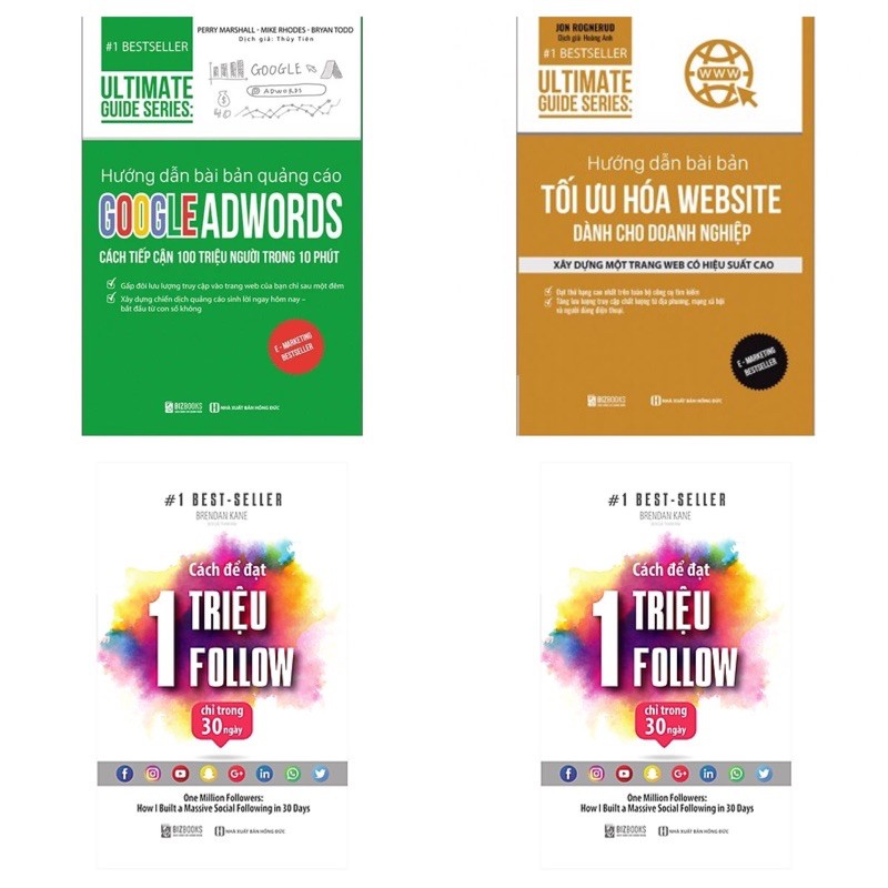 Combo 3 Cuốn Bán Hang Trực Tuyến ebook pdf review dowload tác giả Nhiều tác giả, Danh Mục Sách Kinh Tế Thương hiệu Nhiều tác giả Ngôn ngữ Tiếng Việt Nhập khẩu/ trong nước Trong nước Kho hàng 99 . 1. Hướng dẫn bài bản quảng cáo google adwords: Cách tiếp cận 100 triệu người trong 10 phút – Ultimate Guide Series Công ty phát hành: BIZBooks Tác giả: Perry Marshall Nhà xuất bản: NXB Hồng Đức Năm xuất bản: 2020 Số trang: 464 Giới thiệu sách: Gấp đôi lưu lượng truy cập vào trang web của bạn chỉ sau 1 đêm Xây dựng chiến dịch quảng cáo sinh lời ngay hôm nay – bắt đầu từ con số 0 Đấy là điều đặc biệt nếu bạn hiểu, biết và thông minh bằng quảng cáo Google trong tiếp thị bán hàng. 2.Hướng Dẫn Bài Bản Tối Ưu Hóa Website Cho Doanh Nghiệp Xây Dựng 1 Trang Web Có Hiệu Suất Cao Công ty phát hành: BIZBooks Tác giả: Jon Rognerud Nhà xuất bản: NXB Hồng Đức Năm xuất bản: 2020 Số trang: 480 Giới thiệu sách: Thế giới phẳng đã rút ngắn khoảng cách giữa bạn và khách hàng chỉ cách nhau chiếc màn hình. Vậy làm thế nào để hơn 7 tỷ người ngoài kia biết đến doanh nghiệp của bạn, hãy tối ưu hóa ngay Website của bạn. Ultimate Guide Series: Hướng dẫn bài bản tối ưu hóa Website dành cho doanh nghiệp là bảo bối cầm tay chỉ việc cho bạn – phòng marketing cũng như bộ phận SEO. Làm sao để tối ưu hóa website hoàn hảo là câu hỏi được nhiều doanh nghiệp kinh doanh trực tuyến đặt ra lúc này, thiết kế website ngày nay không chỉ dừng lại ở việc làm sao để trang web gây ấn tượng với khách hàng, mà nội dung trên web cũng phải phù hợp với các từ khóa dưới con mắt của các bộ máy tìm kiếm. Google đang kiểm soát tới 90% lưu lượng tìm kiếm, không có gì ngạc nhiên khi mục đích quan trọng nhất của chiến lược marketing trên website là trở nên tối ưu dưới sự đánh giá của Google. Trang web của bạn sẽ load nhanh như gió và có hàng nghìn lượt khách hàng ghé thăm mỗi ngày. Chỉ cần tỷ lệ chuyển đổi là 1% bạn sẽ sở hữu một lượng khách hàng đáng mong chờ với chi phí 0 đồng. Những nội dung chính sẽ có trong cuốn sách: Xây dựng một trang web có hiệu suất cao Đạt thứ hạng cao nhất trên toàn bộ công cụ tìm kiếm Tăng lưu lượng truy cập chất lượng từ khắp mọi nơi là khách hàng mục tiêu của bạn, mạng xã hội và người sử dụng điện thoại Các ứng dụng, tiện ích là công cụ hỗ trợ tuyệt vời cho việc tối ưu hóa Website của bạn 3.Cách Để Đạt 1 Triệu Follow Chỉ Trong 30 Ngày Công ty phát hành BizBooks Tác giả Brendan Kane Ngày xuất bản 08-2019 Kích thước 13 x 20.5 cm Nhà xuất bản Nhà Xuất Bản Hồng Đức Loại bìa Bìa mềm Số trang 409 Giới thiệu sách Bạn có muốn nắm trong tay quyền lực không?? Nếu có thì đây chính là cuốn sách cho bạn đấy. One Million Followers là cuốn sách hướng dẫn cách tận dụng những nền tảng truyền thông xã hội rất phổ biến hiện nay như Facebook, Instagram, youtube, …để tao ra ảnh hưởng, trở thành người của công chúng và nắm trong tay quyền lực. Những bí quyết mà tác giả Brendan Kane chia sẻ trong cuốn sách này tuy nhỏ mà có võ, đọc cái hiểu ngay nhưng nhiều khi ta không nhận ra. tuy là một cuốn sách rất thực dụng về Marleting số, nhưng One Million Followers vẫn không quên nhắc bạn những vấn đề triết lý. Đó là, suy cho cùng, có nhiều người theo dõi để làm gi?có quyền lực trong tay để làm gi? để cỉa biến thế giới, thay vì than thở, các bạn ạ! Hi vọng cuốn sách Cách Để Đạt 1 Triệu Follow Chỉ Trong 30 Ngày sẽ giúp bạn kiểm soát được một bức tranh toàn cảnh đang không ngừng thay đổi. Người biết tạo ra và nắm giữ quyền lực là người hiểu được sức mạnh của mạng xã hội và cuốn sách này sẽ giúp bạn làm được điều đó.