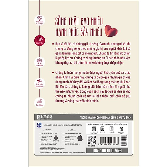 Sống Thật Bao Nhiêu , Hạnh Phúc Bấy Nhiêu Tagore từng nói: “Nếu bạn khóc vì đánh mất mặt trời, như vậy bạn sẽ bỏ lỡ cả những vì sao.” Bạn biết mà, một giọt nước trong đại dương mênh mông, một hạt cát trên bãi biển rất bé nhỏ. Bạn cũng vậy nhỏ bé trong thế giới hàng tỷ người, vậy cớ sao bạn lại phải để ý tới cách nhìn của người khác, nhìn vào những người khác làm tiêu chuẩn cho bản thân mình. Bạn từng theo đuổi nghề giáo viên vì người ta nói nó là một nghề cao quý nhất trong những nghề cao quý mà vẫn biết rằng mình phù hợp với nghề hướng dẫn viên hơn là nghề giáo viên. Bạn từng bỏ rất nhiều chuyến từ thiện, tình nguyện mà bản thân háo hức, từ bỏ nhiều công việc làm thêm mà chỉ tập trung cho kết quả học tập, để rồi giờ đây bạn chẳng có kỹ năng sống gì, va chạm đến khó khăn bạn lúc nào cũng sợ hãi. Bạn không đáng trách, chắc hẳn bạn đã trải qua nhiều khó khăn khi đấu tranh nội tâm để đạt được ngưỡng tiêu chuẩn của xã hội. Cuộc sống diễn ra ở đây, không phải nơi khác, chính trong cách bạn cảm nhận, chứ không phải trong ánh nhìn của người khác. Hạnh phúc là một hành trình chứ không phải là một điểm đến Ai cũng khao khát một cuộc sống hạnh phúc. Có người chọn cho mình cách vui vẻ đứng ngoài mọi chuyện, có người lựa cho mình cách dấn thân, còn có cả người sẵn sàng vì đam mê mà sẵn sàng chịu mạo hiểm… Mỗi người có một cuộc đời là của riêng mình, trong cuộc đời đó lại có vô vàn cách sống. Nhưng cuối cùng kết quả vẫn chỉ có một, sống cho bản thân mình mới là cách sống tốt nhất. Con người vốn dĩ chỉ sống một lần trên đời, bạn còn đợi đến bao giờ mới sẵn sàng làm những điều mình thích, sống vì mình chứ không phải vì người khác? Người sống tốt cuộc sống của mình là người biết cách hưởng thụ cuộc sống. Người không ngần ngại tìm kiếm những điều khiến bản thân thoải mái, càng không vì tiết kiệm mà đắn đo khi quyết định mua một món đồ mang lại niềm vui cho mình. Đấy mới là cuộc sống có thể khiến bạn vui vẻ, hạnh phúc để sau này bạn có thể mỉm cười nhớ về nó khi xế chiều. Và đi tìm hạnh phúc là một quá trình, là sự nỗ lực tìm kiếm, vun đắp lâu dài mà không phải ngày một ngày hai. Khi tin tưởng chính mình, bạn sẽ tìm thấy con đường hạnh phúc Thế giới này chỉ cần bạn bước ra khỏi nhà mọi thứ đã không còn dễ dàng nữa. Mỗi bước đi đều khiến chúng ta phải đắn đo vì không biết làm sao cho đúng, cho không lầm đường. Nhưng chỉ cần bạn tin tưởng, nhắm mắt lại tĩnh lặng một chút, suy nghĩ cẩn trọng bạn sẽ tìm được mục tiêu khiến mình muốn kiên định mà tiến lên. Đến khi ấy, thế giới sẽ nhường cho bạn một con đường, còn bạn sẽ tìm được con đường đúng đắn cho bản thân. Tất nhiên, không phải lúc nào tiến lên cũng có được kết quả tốt, không ai dám chắc rằng con đường phía trước bạn là con đường thẳng tắp không nhấp nhô, uốn lượn… chỉ cần bạn tin tưởng tất cả những khó khăn đó chỉ là để bạn rèn luyện bản lĩnh trước khi tìm được đúng đường. Bởi lẽ, có một số việc không nhất định phải nói cho người khác nghe. Có đau đớn nhưng đừng quá hy vọng người khác hiểu. Có nhiều chuyện theo thời gian rồi sẽ lãng quên. Những nỗi đau, vất vả bạn trải qua dần rồi sẽ được đền đáp một cách xứng đáng. Được sống là chính mình, cuộc đời chúng ta luôn hạnh phúc Cuộc sống của con người mỗi chúng ta đều cần suy nghĩ đơn giản một chút, chuyện gì đến sẽ đến không thể tránh được. Hãy sống là chính mình, vui vẻ, hạnh phúc thì mới không uổng sống trên đời. Con người, muốn nhận được sự tín nhiệm từ người khác hãy thành thật, muốn thành thật hãy chân thật, muốn chân thật nhất định phải là chính mình. Sống thật bao nhiêu hạnh phúc bấy nhiêu – cuốn sách đi tìm lại chính mình Đời giống như ly nước, nước trong hay đục, nước ấm hay lạnh, đều do chúng ta quyết định và cách chúng ta cảm nhận. Ly nước tuy có nóng đi nữa, đợi lát nguội hãy uống là được rồi, cần gì phải bực dọc, chỉ cần bạn thấy hạnh phúc, đó mới là cuộc sống. Cuộc sống chẳng qua chỉ là một quá trình dài mà bản thân tự tranh đấu với bên ngoài và chính nội tâm của mình. Cuộc sống người khác trông thật thú vị, thật rực rỡ, nhưng vậy thì sao? Có thể nó không phù hợp với bạn. Người có năng lực cao nhất, trước tiên nên đem lại hạnh phúc cho bản thân trước đã. Thế nên, đừng sống theo cách nhìn của người khác nữa, khiến bản thân hài lòng mới là điều quan trọng nhất. Cuốn sách “Sống thật bao nhiêu hạnh phúc bấy nhiêu” của David R Hamilton sẽ giúp bạn biết được tầm quan trọng của sống thành thật, dũng cảm bộc lộ cảm xúc của mình mà không cảm thấy hổ thẹn, điều mà rất nhiều