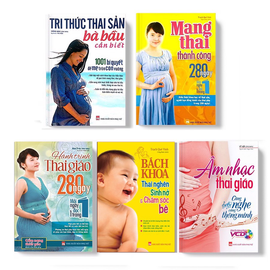 Cẩm Nang Thiết Yếu Dành Cho Bà Bầu Quá trình mang thai được ví như một “mùa xuân” đặc biệt trong cuộc đời, bạn sẽ thấy mọi thứ đều mới mẻ khi mang trong mình một mầm sống mới. Nhưng bạn cũng sẽ cảm thấy vô cùng lo lắng cho quá trình sắp tới: Cần sửa soạn những gì? Đi khám thai như thế nào, ăn uống gì cho con có dinh dưỡng? Vận động như thế nào là phù hợp hơn? Mẹ đừng quá lo lắng nhé, vì combo 4 cuốn sách thai giáo dưới đây sẽ cùng mẹ giải quyết những nỗi lo âu đó. COMBO SÁCH GỒM 5 CUỐN: 1.Sách: Hành Trình Thai Giáo, 280 Ngày, Mỗi Ngày Đọc Một Trang Mã sản phẩm: 8936067591279 Tác giả : Hán Trúc ( Chủ Biên) Dịch giả :Minh Loan Nhà Xuất bản: Phụ Nữ Kích thước : 17 x 23 cm Năm xuất bản : 2019 Số trang : 188 Khối lượng : 380 grams Bìa : Bìa Mềm Tay Gập Mang thai là giai đoạn vô cùng ý nghĩa, là hành trình quan trọng trong cuộc đời đối với người phụ nữ. Tiến hành thai giáo là một công trình vô cùng vĩ đại. Glenn Doman – Viện trưởng Viện Nghiên cứu Phát triển Tiềm năng con người Philadelphia (Mỹ) đã nói: Mỗi đứa trẻ bình thường khi chào đời đều mang trong mình tiềm năng thiên tài như Shakespeare, Mozart, Edison, Einstein… Mà tiềm năng thiên tài này đã có sẵn kể từ ngày người mẹ mang thai bé rồi. Cuốn sách “thai giáo theo chuyên gia, 280 ngày, mỗi ngày đọc một trang” đề cập đến các phương pháp tạo ra các kích thích phù hợp cho bé yêu ngay từ khi còn trong bụng mẹ. 2.Sách: Bách Khoa Thai Nghén – Sinh Nở Và Chăm Sóc Em Bé Mã sản phẩm: 8936046599777 Tác giả : Địch Quế Dung Dịch giả :Công Bình Nhà Xuất bản: Phụ Nữ Kích thước : 17 x 23 cm Năm xuất bản : 2018 Số trang : 416 Khối lượng : 550 grams Bìa : Mềm – tay gập Hành trình của một sinh mệnh bắt đầu từ khi trứng được thụ tinh, chui vào trong tử cung của người mẹ và trưởng thành. Do đó, chăm sóc người mẹ chu đáo chính là tiền đề để thai nhi phát triển! Cuốn sách mang đến nguồn kiến thức giá trị về mang thai cũng như làm thế nào để chăm sóc bà mẹ và thai nhi và phương pháp nuôi dạy con tốt nhất. 3.Sách: Âm Nhạc Thai Giáo – Càng Nghe Càng Thông Minh Mã sản phẩm: 8936067593068 Tác giả : Lý Lợi Dịch giả :Ngọc Hân Nhà Xuất bản: Phụ Nữ Kích thước : 17 x 23 cm Năm xuất bản : 2017 Số trang : 192 Khối lượng : 350 grams Bìa : Mềm – tay gập Ngoài tác dụng là một môn nghệ thuật để thưởng thức thì âm nhạc còn có những tác dụng vô cùng diệu kỳ đối với tâm lý và sinh lý. Âm nhạc có thể đi sâu vào thế giới tâm linh của con người, kích thích sự tưởng tượng vô bờ bến của họ có thể hóa giải được những cảm xúc bị gò bó, bị kìm nén của con người từ đó giúp cho tâm hồn được thanh tịnh, cảm xúc được ổn định. 4.Sách: Mang Thai Thành Công – 280 Ngày, Mỗi Ngày Đọc Một Trang Mã sản phẩm: 8936067591248 Tác giả : Trạch Quế Vinh Dịch giả :Ngọc Diệp Nhà Xuất bản: Phụ Nữ Kích thước : 17x23cm Năm xuất bản : 2018 Số trang : 260 Khối lượng : 480 grams Bìa : Bìa Mềm Tay Gập Khi biết mình mang thai cũng chính là lúc mẹ phải đối diện với vô số những câu hỏi về quá trình mới mẻ và diệu kì này. Dùng những gì mới không tổn hại đến thai nhi? Vận động như thế nào là phù hợp? Đi khám thai thế nào?…Để tìm lời giải cho hàng ngàn câu hỏi như vậy, mẹ tuyệt đối đừng bỏ qua cuốn sách Mang thai thành công 280 ngày, mỗi ngày đọc 1 trang. 5.Tri Thức Thai Sản Bà Bầu Cần Biết – 1001 Bí Quyết Để Mẹ Tròn Con Vuông Mã sản phẩm: 8936067595857 Tác giả : Vương Nguy (Chủ biên) Dịch giả :Thu Trần Nhà Xuất bản: Phụ Nữ Kích thước : 17 x 23 cm Số trang : 388 Khối lượng : 550 grams Bìa : Bìa Mềm Tay Gập Từ khi xác nhận tin vui làm mẹ, chắc hẳn mẹ sẽ rất hạnh phúc nhưng cũng từ lúc đó, mẹ bắt đầu hành trình tìm hiểu cho mình những kiến thức thai sản để cho mẹ và bé đều khỏe mạnh. Cuốn sách “Tri thức thai sản bà bầu cần biết” sẽ là cẩm nang tri thức mang thai cần thiết cho các mẹ.