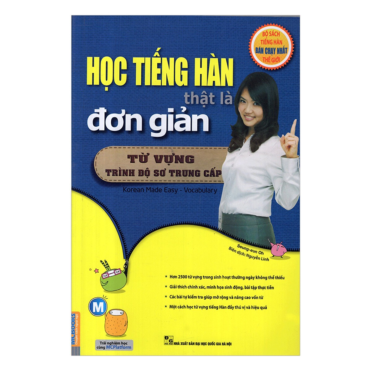 Combo Bộ 6 Cuốn Học Tiếng Hàn Đơn Giản Cho Người Mới Bắt Đầu (Học Kèm App MCBooks) (Tặng Audio books) Bạn tải app MCBooks về, sau đó quét mã QR hoặc barcode trên sách để nghe được file audio books Tập viết tiếng Hàn cho người mới bắt đầu: Là bước khởi đầu cho các bạn yêu thích đất nước Hàn Quốc, mong muốn học tiếng Hàn để kết nối, giao tiếp với người Hàn Quốc, và mong muốn tìm hiểu nền văn hóa đặc biệt của họ. Học tiếng Hàn thật là đơn giản – Từ vựng trình độ sơ trung cấp: cung cấp gần 2,500 từ vựng trình độ bậc sơ-trung cấp theo mức độ tăng tiến của 100 bài học. Cuốn sách được chia thành phần 1, 2 và 3; mỗi phần có cấu trúc khác nhau để giúp người học hiểu ngữ cảnh sử dụng của các từ vựng một cách dễ dàng hơn. Học tiếng Hàn thật là đơn giản – Từ vựng trình độ sơ cấp: Cung cấp nhiều từ vựng theo trình độ sơ cấp theo từng đơn vị bài học. Các bạn học sinh có thể học từ vựng một cách hệ thống và sử dụng chúng tự nhiên, thuần thục thông qua các hình vẽ minh họa, bài nghe, các bài luyện tập đa dạng và các thẻ hội thoại đưa ra ngữ cảnh sử dụng cụ thể của các từ được học. Học tiếng Hàn thật là đơn giản – Dành cho người mới bắt đầu: hướng tới đối tượng là những người chưa từng học tiếng Hàn và chưa biết đến bảng chữ cái tiếng Hàn. Thông qua nhiều bài luyện tập, hoạt động và trò chơi đa dạng, cuốn sách này sẽ giúp các bạn học nghe, nói, đọc và viết tiếng Hàn Quốc một cách thú vị. Học tiếng Hàn thật là đơn giản – Trong giao tiếp hàng ngày: tập trung hơn vào giúp học sinh mới học tiếng Hàn (sau khoảng 150 đến 400 giờ học) có thể giao tiếp tiếng Hàn một cách tự nhiên trong các tình huống đời thường. Học tiếng Hàn thật là đơn giản: Cung cấp nhiều từ vựng, câu nói theo trình độ sơ cấp theo từng đơn vị bài học.