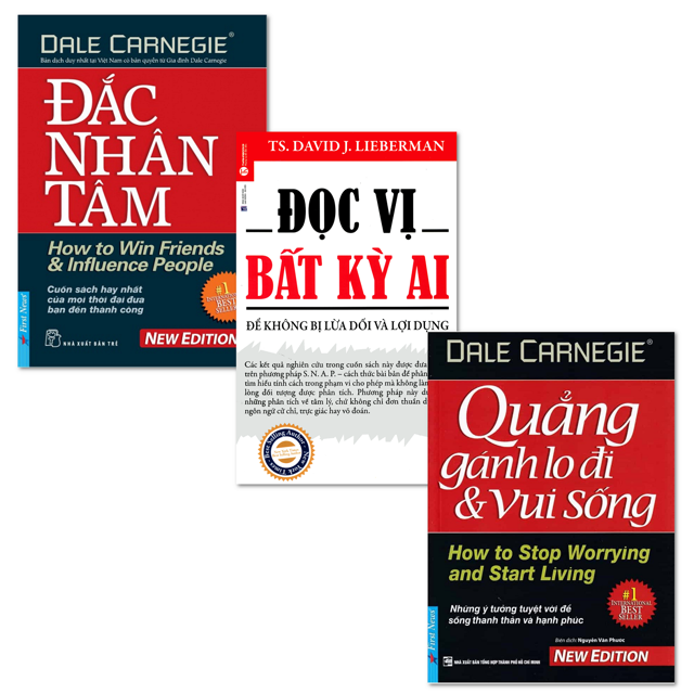 Bấm vào hashtag xem sách chonloc: #happybooks#sachkynangsongchonloc #sachtaichinhkinhtechonloc #sachnuoidayconchonloc #sachnuoidayconchonloc#sachngoainguchonloc ==========LỜI GIỚI THIỆU=========== Combo gồm 3 cuốn sách: Đắc Nhân Tâm – Đọc Vị Bất Kỳ Ai – Quẳng Gánh Lo Đi mà Vui Sống Bộ gồm các cuốn kỹ năng sống đang được rất nhiều bạn đọc yêu thích. Đây là bộ sách hay và chọn lọc, những cuốn sách đã giúp đỡ hàng triệu người trên thế giới thay đổi bản thân và trở nên thành công và hạnh phúc hơn trong cả công việc cũng như trong cuộc sống 1. Đắc nhân tâm Đắc Nhân Tâm không chỉ là là nghệ thuật thu phục lòng người, Đắc Nhân Tâm còn đem lại cho độc giả góc nhìn, suy nghĩ sâu sắc về việc giao tiếp ứng xử. Triết lý của Đắc Nhân Tâm là hiểu mình, thành thật với chính mình, từ đó hiểu biết và quan tâm đến những người xung quanh để nhìn ra và khơi gợi những tiềm năng ẩn khuất nơi họ, giúp họ phát triển lên một tầm cao mới. Đây chính là nghệ thuật cao nhất về con người và chính là ý nghĩa sâu sắc nhất đúc kết từ những nguyên tắc vàng của Dale Carnegie. Đây là phiên bản Đắc Nhân Tâm đặc biệt, bìa cứng dày 320 trang, do First News thực hiện và Nhà xuất bản Tổng hợp TP.HCM ấn hành. Một cuốn sách mà luôn đi cùng thời đại Nhà xuất bản Tổng Hợp TPHCM Tác giả Nhiều Tác Giả Số trang 300 / 250 / 300 Loại bìa Bìa mềm 2. Đọc vị bất kỳ ai Đọc Vị Bất Kỳ Ai – Để Không Bị Lừa Dối Và Lợi Dụng Bạn băn khoăn không biết người ngồi đối diện đang nghĩ gì? Họ có đang nói dối bạn không? Đối tác đang ngồi đối diện với bạn trên bàn đàm phán đang nghĩ gì và nói gì tiếp theo? ĐỌC người khác là một trong những công cụ quan trọng, có giá trị nhất, giúp ích cho bạn trong mọi khía cạnh của cuộc sống. ĐỌC VỊ người khác để: Hãy chiếm thế thượng phong trong việc chủ động nhận biết điều cần tìm kiếm – ở bất kỳ ai bằng cách “thâm nhập vào suy nghĩ” của người khác. ĐỌC VỊ BẤT KỲ AI là cẩm nang dạy bạn cách thâm nhập vào tâm trí của người khác để biết điều người ta đang nghĩ. Cuốn sách này sẽ không giúp bạn rút ra các kết luận chung về một ai đó dựa vào cảm tính hay sự võ đoán. Những nguyên tắc được chia sẻ trong cuốn sách này không đơn thuần là những lý thuyết hay mẹo vặt chỉ đúng trong một số trường hợp hoặc với những đối tượng nhất định. Các kết quả nghiên cứu trong cuốn sách này được đưa ra dựa trên phương pháp S.N.A.P – cách thức phân tích và tìm hiểu tính cách một cách bài bản trong phạm vi cho phép mà không làm mếch lòng đối tượng được phân tích. Phương pháp này dựa trên những phân tích về tâm lý, chứ không chỉ đơn thuần dựa trên ngôn ngữ cử chỉ, trực giác hay võ đoán. Cuốn sách được chia làm hai phần và 15 chương: Phần 1: Bảy câu hỏi cơ bản: Học cách phát hiện ra điều người khác nghĩ hay cảm nhận một cách dễ dàng và nhanh chóng trong bất kỳ hoàn cảnh nào. Phần 2: Những kế hoạch chi tiết cho hoạt động trí óc – hiểu được quá trình ra quyết định. Vượt ra ngoài việc đọc các suy nghĩ và cảm giác đơn thuần: Hãy học cách người khác suy nghĩ để có thể nắm bắt bất kỳ ai, phán đoán hành xử và hiểu được họ còn hơn chính bản thân họ. Nhà xuất bản lao độn và xã hội Tác giả Nhiều Tác Giả Số trang 300 / 250 / 300 Loại bìa Bìa mềm Ngày xuất bản 01-2015., 3. Quẳng gánh lo đi mà vui sống Quẳng Gánh Lo Đi Và Vui Sống là cuốn sách mà cái tên đã nói lên tất cả nội dung chuyển tải trên những trang giấy. Bất kỳ ai đang sống đều sẽ có những lo lắng thường trực về học hành, công việc, những hoá đơn, chuyện nhà cửa,… Cuộc sống không dễ dàng giải thoát bạn khỏi căng thẳng, ngược lại, nếu quá lo lắng, bạn có thể mắc bệnh trầm cảm. Quẳng Gánh Lo Đi Và Vui Sống khuyên bạn hãy khóa chặt dĩ vãng và tương lai lại để sống trong cái phòng kín mít của ngày hôm nay. Mọi vấn đề đều có thể được giải quyết, chỉ cần bạn bình tĩnh và xác định đúng hành động cần làm vào đúng thời điểm. Nhà xuất bản Tổng Hợp TPHCM Tác giả Nhiều Tác Giả Số trang 300 / 250 / 300 Loại bìa Bìa mềm Ngày xuất bản 01-2015.,