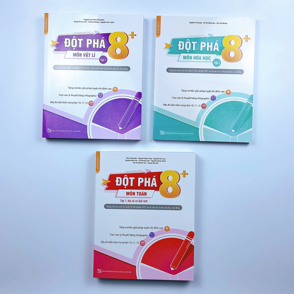 Combo gồm 3 cuốn: – Đột phá 8+ Toán tập 1 – Đột phá 8+ Lý tập 1 – Đột phá 8+ Hóa tập 1 ————————– Ưu điểm của sách mà không thể bỏ qua: – Lí thuyết được trình bày dưới dạng Infographic rất chi tiết, kết hợp chữ và hình minh họa giúp các em hiểu sâu sắc bản chất kiến thức. Đồng thời infographic giúp các em tăng cường khả năng ghi nhớ kiến thức lên gấp nhiều lần.. – Có “cây mục tiêu” trước mỗi bài học để các em chủ động xác định trọng tâm bài học, yêu cầu cần đạt sau khi học xong bài cũng như có căn cứ để đánh giá lại mức độ tiếp thu bài của bản thân – Bộ sách tổng hợp kiến thức hoàn chỉnh của cả 3 năm lớp 10, 11 và 12 giúp em có thêm 120% thời gian ôn luyện – Hệ thống hình ảnh minh họa giúp mọi kiến thức “khó nhằn” đều trở nên ngon xơi như 1+1=2 – Mọi thứ được trình bày kỹ càng, lý thuyết được phân tích theo lối tư duy ngược giúp rèn luyện khả năng tư duy logic của các em – Các em có được phương pháp và lộ trình học hiệu quả nhất, lấy điểm 8 ngon lành ————————– Công ty phát hành: CCBook Nhà xuất bản: Đại học Quốc gia Hà Nội Kích thước: 22* 27.5 Tác giả: Nhiều tác giả Số trang: 324 – 433 – 324 Năm xuất bản: 2020