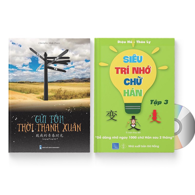 Sách – Combo: Gửi Tôi Thời Thanh Xuân + Siêu trí nhớ chữ Hán tập 03 + DVD quà tặng Gửi Tôi Thời Thanh Xuân (Trung – Pinyin – Việt, Có Audio nghe sách) Chủ biên: Nhật Phạm Năm xuất bản: 2021 Nhà xuất bản: Thanh Niên Số trang: 403 Giá bìa: 320,000 VNĐ Nội dung sách: Gồm hơn 500 câu song ngữ (Trung – Việt – Pinyin) về những kỷ niệm, bâng khuâng, hoài nhớ về thanh xuân của mỗi người Giữa những năm tháng thanh xuân của cuộc đời, có người đắm chìm trong hạnh phúc, có người trượt dài trong vô vọng, ấy thế nhưng đôi khi gặp phải một người bạn tốt nắm tay ta bước những ngã tư của cuộc đời khốc liệt, tự thấy rằng, đời thật may mắn. Và mong rằng, cuốn sách dành cho tâm hồn tuổi thanh xuân này, sẽ trở thành bằng hữu chân tình của các bạn, những người đang hoài nghi về thanh xuân! Siêu trí nhớ chữ Hán tập 03 (In màu, có Audio nghe) Tác giả: Diệu Hồ, Thảo Ly Số trang: 267 Năm xuất bản: 2019 Nhà xuất bản: NXB Đà Nẵng Giá bìa: 300.000 VNĐ Nội dung sách: Giúp bạn dễ dàng nhớ ngay một số lượng từ Hán siêu lớn chỉ trong một khoảng thời gian ngắn. Từ đó, dễ dàng vận dụng vào mọi trường hợp.