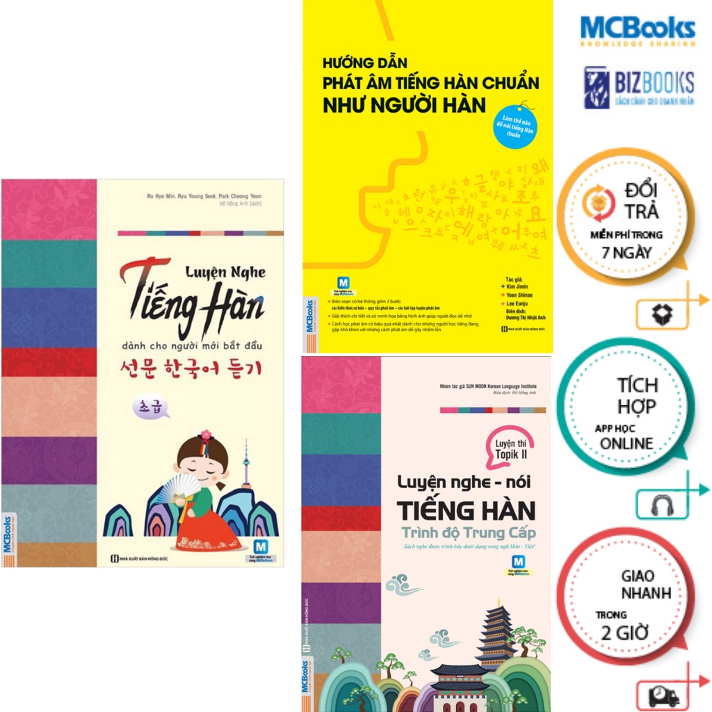 1/ Sách – Luyện nghe tiếng Hàn cho người mới bắt đầu Bố cục nổi bật của sách • Phần mở đầu: Với trình độ dành cho người mới bắt đầu học tiếng Hàn, những kiến thức cơ bản cần được chú trọng, do đó, trong phần mở đầu, mỗi bài sẽ cung cấp những mẫu câu cơ bản và cách biểu hiện câu để người học dễ dàng nắm bắt nội dung bài học. • Bố cục: Mỗi bài bao gồm 12 câu hỏi. Phần mở đầu là các dạng câu hỏi ở mức độ dễ như nghe và liên kết các bức tranh phù hợp, nghe nội dung chọn đáp án và chọn câu sau. Những tình huống cơ bản và mức độ cơ bản giúp người đọc làm quen với cách phát âm tiếng Hàn và từ đó luyện phát âm cho riêng mình. Ngoài ra, trong giáo trình còn nhiều bài luyện nghe khác để người học có thể học tập củng cố thêm như nghe và chọn tranh, nghe và chọn đáp án đúng,… • Ngôn ngữ phong phú: Phần cuối mỗi bài đều có bảng từ vựng được dịch sang tiếng Anh, tiếng Nhật, tiếng Trung, giúp người đọc có thể tiếp cận các ngôn ngữ khác cùng lúc, đồng thời củng cố ngôn ngữ mà người học đã từng sử dụng. • Mỗi câu hỏi đều được đánh số tự động tránh nhầm lẫn và giúp người học nghe đi nghe lại trong quá trình học. • Lời giải và đáp án Thông tin bìa sách Mã sản phẩm: 8935246921456 Kích thước: 17 x 24 cm Nhà xuất bản: NXB Hồng Đức Năm xuất bản: 2019 Số Trang: 142 Tác giả: Rah Hye Min, Ryu Young Seok, Park Choung Yeon 2/ Luyện nghe- nói tiếng Hàn trung cấp • Bố cục Mỗi bài học gồm những phần sau: -Mở đầu: Lý giải những lý do tại sao bạn cần phải học chủ đề này – Từ mới và biểu hiện: Gợi ý cho người học những từ vựng cần thiết để nói thành câu hoàn chỉnh – Bài tập nghe – nói: Bao gồm các đoạn hội thoại và các bài tập ngắn giúp người học luyện tập khả năng nghe – nói của mình – Hoạt động bổ trợ: Giúp người học ôn lại những gì đã học trong bài – Từ mới: Liệt kê một số từ mới xuất hiện trong bài nghe. Ngoài ra, phần sau của cuốn sách còn bao gồm nhiều bài luyện nghe nói và phần đáp án của phần bài tập trong 10 chủ đề trên giúp người học tự kiểm tra lại kiến thức. • Thông tin bìa sách KÍCH THƯỚC 17 x 24 cm NĂM XUẤT BẢN 2019 NHÀ XUẤT BẢN NXB Hồng Đức TÁC GIẢ SUN MOON SỐ TRANG 280 MÃ SẢN PHẨM 8935246921463 3/ Hướng dẫn phát âm chuẩn như người Hàn Bố cục cuốn sách Cuốn sách ngày gồm 3 phần: – Kiến thức cơ bản về phát âm tiếng Hàn – Các quy tắc phát âm – Bài tập luyện đọc Trong đó, – Phần “Kiến thức cơ bản về phát âm tiếng Hàn” giới thiệu về nguyên âm, phụ âm, phụ âm cuối patchim, cách đọc nối âm để người học có thể nắm được bảng chữ cái tiếng Hàn và cách phát âm các chữ cái. – Phần “Các quy tắc phát âm” giải thích một cách dễ hiểu các quy tắc phát âm khi từ tiếng Hàn không phát âm giống với cách viết. Thông qua phần hội thoại và bài tập, người học có thể học được cách phát âm tiếng Hàn chính xác. – Phần chuẩn bị bài đọc, nội dung đầu tiên của phần “Bài tập luyện đọc”, sẽ giới thiệu đến người học về sự thay đổi âm điệu khi đọc một câu tiếng Hàn. Phần “Bài tập luyện đọc” gồm 10 bài được biên soạn theo phong cách hội thoại giao tiếp thường ngày và 10 bài được biên soạn theo phong cách văn viết với các chủ đề đa dạng về văn hóa và cuộc sống thường nhật giúp người học tìm được sự hứng thú về văn hóa Hàn Quốc hơn. Cũng trong phần này, người học sẽ được hướng dẫn để ôn tập lại các quy tắc phát âm đã được giới thiệu ở phần đầu sách, đồng thời được hướng dẫn luyện đọc to để cải thiện kỹ năng phát âm và nói tiếng Hàn của mình. • Thông tin bìa sách KÍCH THƯỚC 19×27 cm NĂM XUẤT BẢN 2019 NHÀ XUẤT BẢN NXB Hồng Đức TÁC GIẢ Kim Jimin, Lee Eunju, Yoon Shinae SỐ TRANG 284 MÃ SẢN PHẨM 8935246920893