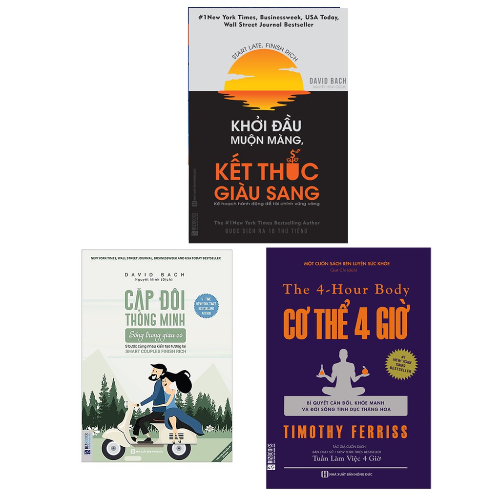 1. Khởi đầu muộn màng, kết thúc giàu sang Công ty phát hành BIZBOOKS Tác giả David Bach Nhà xuất bản Hồng Đức Năm xuất bản 2019 Số trang 558 Giới thiệu sách Cuốn sách này được chia thành 5 phần chính, mỗi phần bao gồm một lĩnh vực tài chính của bạn mà bạn cần phải giải quyết để có thể khởi đầu muộn nhưng kết thúc giàu. Cho dù bạn đọc cuốn sách này từ đầu đến cuối hay chỉ đơn giản là tập trung vào các lĩnh vực có vẻ thực sự quan trọng với bạn ngay bây giờ, nếu bạn thực hiện theo những gì bạn học, cuộc sống của bạn sẽ thay đổi. Sách không thay đổi cuộc sống của mọi người. Mà mọi người thay đổi cuộc sống của chính họ. Thực tế là bạn đang đọc cuốn sách này ngay bây giờ không phải là một sự trùng hợp ngẫu nhiên. Có hàng triệu cuốn sách hiện có ngay bây giờ mà bạn có thể đọc. Những cuốn sách này đã nằm trong tay bạn bởi một lý do. Lý do đó là bạn đã sẵn sàng thực hiện một số thay đổi. Bạn sẽ biết làm thế nào để biến giấc mơ của bạn thành hiện thực và thực hiện mong muốn tự do tài chính của bạn – nói cách khác, mọi thứ cần thiết để bù đắp cho sự khởi đầu muộn của bạn. 2. Cặp Đôi Thông Minh Sống Trong Giàu Có Công ty phát hành BIZBOOKS Tác giả David Bach Nhà xuất bản Hồng Đức Năm xuất bản 2019 Số trang 492 Giới thiệu sách Cuốn sách sẽ cải thiện cách mà các cặp vợ chồng vừa thảo luận về tiền bạc vừa sử dụng tiền bạc của các bạn một cách thông minh. Cho dù bạn chỉ mới chớm hay đang ở giữa độ tuổi trung niên, cho dù đây là cuộc hôn nhân đầu tiên hay thứ tư của bạn, cuốn sách này sẽ chỉ cho bạn cách để đạt được mục tiêu tài chính và đồng thời tạo ra giá trị cá nhân của bạn để người bạn đời – và cả hai bạn có thể làm việc cùng nhau để biến giấc mơ thành hiện thực! Hơn nữa, nếu hai ban đang gặp phải các vấn đề về tài chính thì đây sẽ là kim chỉ nam giúp các bạn giải quyết và cùng nhau vượt qua chúng. Trong cuốn sách “Cặp đôi thông minh sống trong giàu có”, tác giả cung cấp một bản đồ hành động theo định hướng sẽ cho phép hai bạn kiểm soát tài chính của mình với tư cách là một cặp vợ chồng. Trong các chương tiếp theo, các bạn sẽ học được tất cả mọi thứ cần làm khi là một cặp vợ chồng để sống và giàu có khi về già. 3. Cơ thể 4 giờ Công ty phát hành: BIZBooks Tác giả: Timothy Ferriss Nhà xuất bản: NXB Hồng Đức Năm xuất bản: 2019 Số trang: 580 Giới thiệu sách: Điều quan trọng nhất trong cuộc sống? Nếu người ta hỏi một người trong cơn đói, đó sẽ là thực phẩm. Với một kẻ nào đang lạnh, đó sẽ là hơi ấm. Và nếu một ai đang cam chịu cô đơn, chắc chắn đó sẽ là sự gần gũi với người khác. Với một người đang ốm đau thì đó sẽ là sức khỏe. Trong cuộc sống này, không có gì quan trọng cho bạn bằng chính con người bạn, một thân thể không bệnh tật, một tâm hồn không loạn đó là chân hạnh phúc của con người. Có câu nói: “Người có sức khỏe có một trăm ước muốn, người không có sức khỏe chỉ có 1 ước muốn duy nhất: đó là sức khỏe”. Không phải đương nhiên mà mỗi người chúng ta được sở hữu một thân thể khỏe mạnh. Đó phải là kết quả của quá trình gìn giữ và rèn luyện thường xuyên trong sinh hoạt hàng ngày. Để khởi đầu cho mục tiêu có một sức khỏe tốt, có một cuốn sách mà sẽ giúp bạn có một cơ thể khỏe mạnh bằng những phương pháp luyện tập khoa học, có căn cứ và đo lường được kết quả – Cơ thể 4 giờ – Bí quyết cân đối, khỏe mạnh và đời sống tình dục thăng hoa – The 4-hour body.