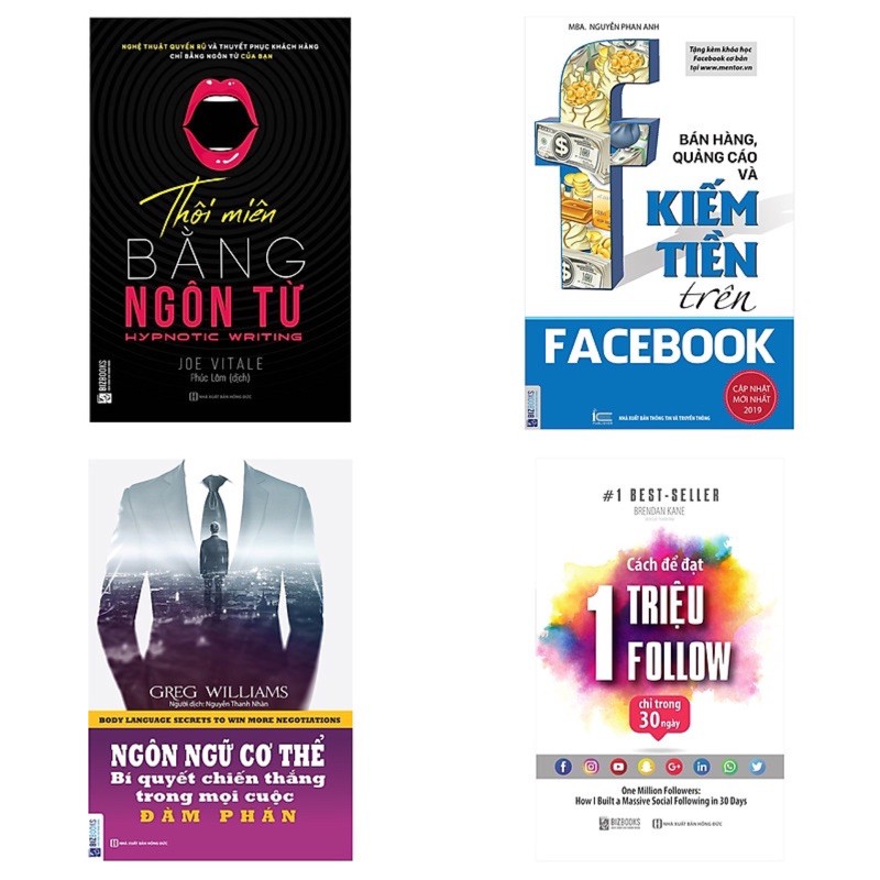 Combo Kiếm Tiền Trên Các Nền Tảng Xã Hội ebook pdf review dowload tác giả Nhiều tác giả, Danh Mục Sách Kinh Tế Thương hiệu Nhiều tác giả Ngôn ngữ Tiếng Việt Nhập khẩu/ trong nước Trong nước Kho hàng 99 . 1.2. Cách Để Đạt 1 Triệu Follow Chỉ Trong 30 Ngày Công ty phát hành BIZBOOKS Tác giả Brendan Kane Ngày xuất bản 08-2019 Kích thước 13 x 20.5 cm Nhà xuất bản Nhà Xuất Bản Hồng Đức Loại bìa Bìa mềm Số trang 409 Thoạt nghe có vẻ không tưởng, nhưng xây dựng một cộng đồng theo dõi khổng lồ trên mạng xã hội trong chưa đầy 30 ngày là việc hoàn toàn khả thi. Có thể nói, đây là cuốn sách đầu tiên tại Việt Nam hướng dẫn người đọc các cách bài bản để xây dựng và gia tăng số lượng người follow trên mạng xã hội Facebook, Instagram, Youtube…để tạo ra ảnh hưởng, trở thành người của công chúng và nắm trong tay quyền lực. Những bí quyết mà tác giả Brendan Kane chia sẻ trong cuốn sách này tuy nhỏ mà có võ, đọc cái hiểu ngay nhưng nhiều khi ta không nhận ra. Nếu có một triệu follow thì việc kiếm một triệu đô la cũng chỉ là chuyện giản đơn. Làm sao để bạn có thể chinh phục khán giả thời kỳ công nghệ số 4.0 này, đơn giản là bạn cần biết nắm bắt xu hướng, nắm bắt cơ hội và tận dụng sức mạnh của công nghệ. Nếu bạn đang tìm kiếm những cách thức, chiến lực giúp bạn tạo nên tầm ảnh hưởng xã hội, lợi ích xã hội hay lợi nhuận kinh tế, marketing, giới thiệu sản phẩm mới, quảng bá thương hiệu…từ việc sử dụng mạng xã hội thì cuốn sách sẽ chỉ dẫn bạn cặn kẽ qua từng trang, giúp bạn đạt được các mục tiêu của riêng mình. 2. Bán Hàng, Quảng Cáo Và Kiếm Tiền Trên Facebook Công ty phát hành BIZBOOKS Tác giả Nguyễn Phan Anh Nhà xuất bản NXB Thông Tin và Truyền Thông Năm xuất bản 2019 Số trang 432 Nếu bạn đang kinh doanh, nếu bạn đang bán hàng, nếu bạn đang muốn kinh doanh online, nếu bạn muốn kiếm thêm các đơn hàng, tăng trưởng doanh số hơn nữa thì bạn phải có cuốn sách này trong tay để tham khảo, tôi hứa là như vậy, tuy nhiên tôi không đảm bảo việc đó. 3. Ngôn ngữ cơ thể – bí quyết chiến thắng trong mọi cuộc đàm phán Công ty phát hành BIZBOOKS Tác giả Greg Williams Nhà xuất bản NXB Hồng Đức Năm xuất bản 2019 Số trang 350 Nếu bạn hiểu về ngôn ngữ cơ thể, bạn sẽ giao tiếp tốt hơn. Khi ngồi trước ống kính bạn cũng phải sử dụng “body language” thật tốt để chinh phục khán giả của mình. Ngôn ngữ của cơ thể đóng một vai trò rất quan trọng trong giao tiếp, thậm chí là yếu tố quyết định thành công hơn cả lời nói. Hiểu ngôn ngữ này giúp chúng ta đoán được thái độ và tâm tư tình cảm của đối phương, những điều mà những ngôn từ trong lời nói khó có thể diễn đạt trọn vẹn. Và để thành thạo ngôn ngữ đặc biệt này, đừng bỏ qua cuốn “Ngôn ngữ cơ thể – bí quyết chiến thắng trong mọi cuộc đàm phán“ Cuốn sách tiết lộ những suy nghĩ bất ngờ được ẩn giấu bên trong ngôn ngữ cơ thể, biểu cảm và cảm xúc nhỏ nhất trong mỗi cuộc đàm phán. Những trang sách này không chỉ giúp bạn học cách dịch những thông điệp không lời mà còn khám phá ra những công cụ hữu ích để chuyển những tín hiệu yên lặng đó thành lợi thế trên bàn đàm phán. Bạn mong chờ sẽ đạt được điều gì trong quyển sách này? “Bí mật về ngôn ngữ này là bí quyết chiến thắng trong mọi cuộc đàm phán” sẽ giúp bạn khám phá xem các nhà đàm phán khác đang tiết lộ điều gì. 4. Thôi miên bằng ngôn từ ông ty phát hành BIZBOOKS Tác giả Joe Vitale Kích thước 15.5 x24 cm Nhà xuất bản Nhà Xuất Bản Hồng Đức Loại bìa Bìa mềm Số trang 385 Nghệ thuật Thôi Miên bằng Ngôn Từ là một công cụ cực mạnh. Những ai biết tận dụng nó sẽ nâng cao được khả năng giao tiếp và thuyết phục của bản thân, giúp tăng doanh số bán hàng. Các youtuber, các nhà văn, những người viết truyện, viết email, những người làm website và cả dân viết blog đều có thể ứng dụng những Ngôn Từ Thôi Miên để thu hút và giữ chân độc giả. Các bí kíp trong quyển sách này sẽ giúp bạn làm nên những bài viết nổi bật giữa đám đông. Trong thời đại thông tin ngập tràn như hiện nay, bạn cần một lưỡi kiếm thật sắc bén. Đó chính là nghệ thuật Thôi Miên bằng Ngôn Từ. Bản thân cuốn sách này cũng là một tác phẩm Thôi Miên bằng Ngôn Từ. Xuyên suốt quyển sách bạn sẽ thấy như mình vừa trải qua trạng thái bị thôi miên. Nói đúng hơn, bạn sẽ thấy mình đang bị thôi miên cho đến khi bạn thức tỉnh. Hay nói cách khác, bạn sẽ nhận thấy rằng mình chẳng nhận thấy gì cả. “Hành trình vạn dặm bắt đầu từ một bước chân.” Hãy bắt đầu cuộc hành trình khám phá các mạng xã hội để tạo thương hiệu cá nhân, để kiếm tiền trên mạng xã hội. Bizbooks sẽ giúp bạn đi nhanh hơn với bộ sách: Bộ sách Kiếm Tiền Trên Các Nền Tảng Mạng Xã Hội