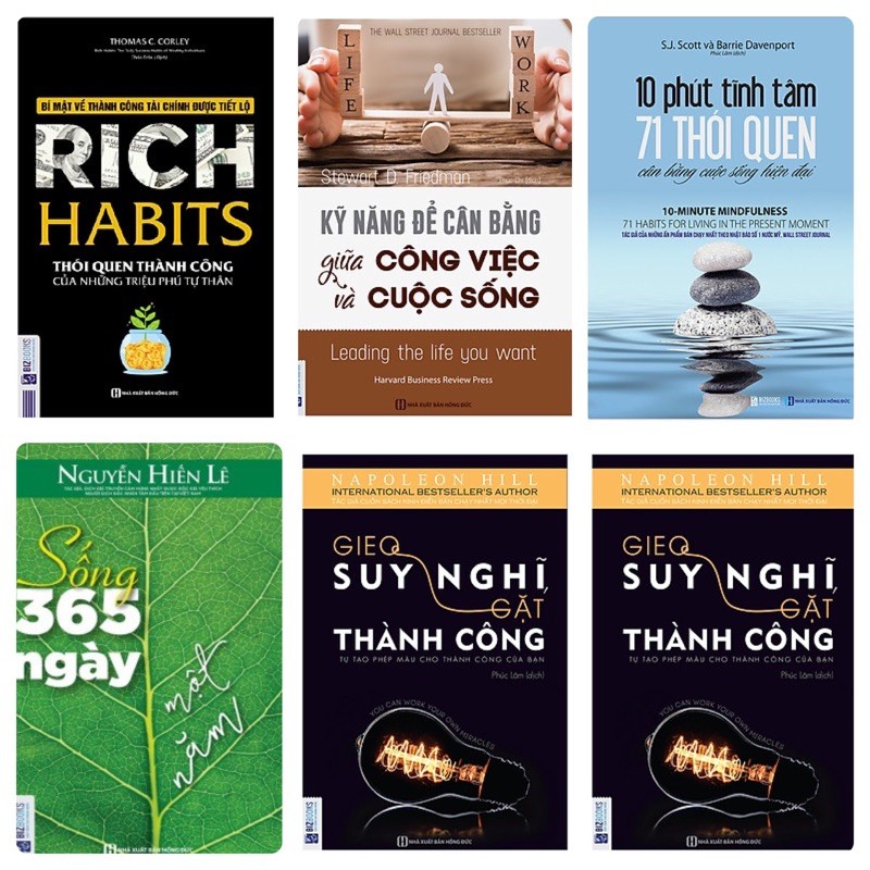 Combo Làm Chủ Thói Quen ,Làm Chủ Thành Công ebook pdf review dowload tác giả Nhiều tác giả, Danh Mục Sách Hướng Nghiệp Thương hiệu Nhiều tác giả Ngôn ngữ Tiếng Việt Nhập khẩu/ trong nước Trong nước Kho hàng 99 . 1. 10 phút tĩnh tâm ông ty phát hành: BIZBooks Tác giả: Nhiều tác giả Nhà xuất bản: NXB Hồng Đức Năm xuất bản: 2019 Số trang: 364 Giới thiệu sách Chúng ta đã biết nên tĩnh tâm hưởng thụ cuộc sống, tuy nhiên làm thế nào để có thể tĩnh tâm? Hãy để cuốn sách này dẫn dắt bạn, để sự “tĩnh” thẩm thấu dần vào từng chi tiết của cuộc sống, giúp bạn nhìn thấu tất cả vinh nhục, được mất, thị phi, trắng đen, và dùng sự tỉnh táo và lí trí để nhìn nhận cuộc đời. 10 phút tĩnh tâm – 71 thói quen cân bằng cuộc sống hiện đại để tránh cái bẫy của lối sống vô thức Những tình huống trên xuất phát từ vòng luẩn quẩn của các phản ứng, sự sao lãng và căng thẳng, thứ có thể được gọi là “lối sống vô thức”. Việc không ý thức về cách lựa chọn lối sống, thói quen và suy nghĩ gây ra cho hầu hết chúng ta sự bất hạnh và lo lắng. Chúng ta không biết về giá trị thực sự, các ưu tiên của cuộc sống và khao khát để có được một lối sống cân bằng hơn. Chúng ta cũng không ý thức được về sự yên bình và hài lòng ngay hiện tại, bởi vì chúng ta cứ mãi bận tâm tới những hối tiếc và lo lắng trong quá khứ cũng như trong tương lai. 2.Rich Habits: Thói quen thành công của những triệu phú tự thân Công ty phát hành BIZBOOKS Tác giả Thomas C.Corley Nhà xuất bản Hồng Đức Năm xuất bản 2019 Số trang 291 Giới thiệu sách Rich Habits – Cuốn sách giúp cuộc đời bạn đi đến thành công Mọi điều bạn làm hàng ngày đều quan trọng. Thói quen hàng ngày sẽ giúp bạn thành công hay không thành công trong cuộc đời. Nhận định trên được Thomas C. Corley, người đã dành ra 5 năm nghiên cứu thói quen hàng ngày của 177 triệu phú tự thân, đưa ra. Ông cũng là tác giả cuốn sách bán chạy “Rich Habits: The Daily Success Habits of Wealthy Individuals” (Tạm dịch: Thói quen Giàu có: Những thói quen hằng ngày làm nên thành công của người giàu). Cuốn sách là điều thú vị khi tác giả đã dày công nghiên cứu trong 5 năm về những thói quen hàng ngày của 233 triệu phú và 177 triệu phú tự thân để bật mí bí mật triệu phú của họ. 3. Kỹ Năng Để Cân Bằng Giữa Công Việc Và Cuộc Sống Công ty phát hành: BIZBooks Tác giả: Stewart D. Friedman Nhà xuất bản: NXB Hồng Đức Năm xuất bản: 2019 Số trang: 416 Giới thiệu sách: Công việc và cuộc sống là hai bản thể tồn tại song song với nhau hàng ngày của bạn phải không? Khi mà chúng ta ngày càng bận rộn hơn với công việc thì cũng kèm theo đó là chuỗi ngày căng thẳng mà đến dây thần kinh cũng muốn đứt. Nếu như thời điểm trước đây, chúng ta làm việc 8h/ngày và trở về nhà nghỉ ngơi thì giờ đây mọi người thường xuyên mang việc về nhà. Họ liên tục kiểm tra email công việc thông qua điện thoại di động ở nhà (ngay cả khi đó là thời gian cho bữa tối) và đọc báo cáo công việc vào tối muộn. Làm việc với lịch và cường độ như vậy sẽ gây tổn hại đến sức khỏe của mọi người. Đã đến lúc mọi người cần quan tâm đến bản thân mình nhiều hơn và tìm cách cân bằng giữa công việc và cuộc sống gia đình. Bạn đã bao giờ nghĩ đến một cách nào đó để mình có thể cân bằng mọi thứ, ít nhất là công việc và cuộc sống để mình có dư giả chút thời gian bên con lâu hơn, bên gia đình lâu hơn hay thời gian cho chính bản thân mình thêm chút nữa. 4.Gieo Suy Nghĩ Gặt Thành Công – Tự Tạo Phép Màu Cho Thành Công Của Bạn Công ty phát hành: BIZBooks Tác giả: Napoleon Hill Nhà xuất bản: NXB Hồng Đức Năm xuất bản: 2019 Số trang: 220 Giới thiệu sách: Trong cuốn sachs này tôi sẽ gửi tới bạn thông qua sự diễn giải về các phép màu, một nửa của mật mã đó, một nửa còn lại phụ thuộc vào bạn và bạn phải khớp chúng lại với nhau. Khi đọc các chương trong cuốn sách này, bạn sẽ tựu hiểu ra một nửa mật mã còn thiếu. Khi bạn nhận ra điều đó, hiểu chúng nó và áp dụng nó vào cuộc sống của chính mình, bạn sẽ hiểu được rằng cuộc sống này mang đến cho bạn điều gì đó còn lớn lao hơn cả cách thoát khỏi sự sợ hãi về nỗi đau thể xác khi phải khám chữa hay phẫu thuật nha khoa. Và bằng cách chinh phục được những điều đơn giản nhỏ bé, rồi bạn sẽ chinh phục được nhiều điều vĩ đại hơn trong cuộc đời bạn . 5.Sống 365 ngày một năm Công ty phát hành BIZBOOKS Tác giả Nguyễn Hiến Lê Nhà xuất bản Hồng Đức Năm xuất bản 2019 Số trang 197 Giới thiệu sách Cuốn sách đem đến một suy nghĩ mới hoàn toàn về cách giữ sức khỏe lành mạnh, đưa ra nguyên nhân chủ yếu để gây bệnh là do tinh thần, cảm xúc tiêu cực. Cuốn sách sẽ giúp bạn: Tìm hiểu nguyên nhân gây ra các bệnh bởi xúc động Những bệnh do xúc động gây nên Những suy nghĩ tích cực có ảnh hưởng phi thư