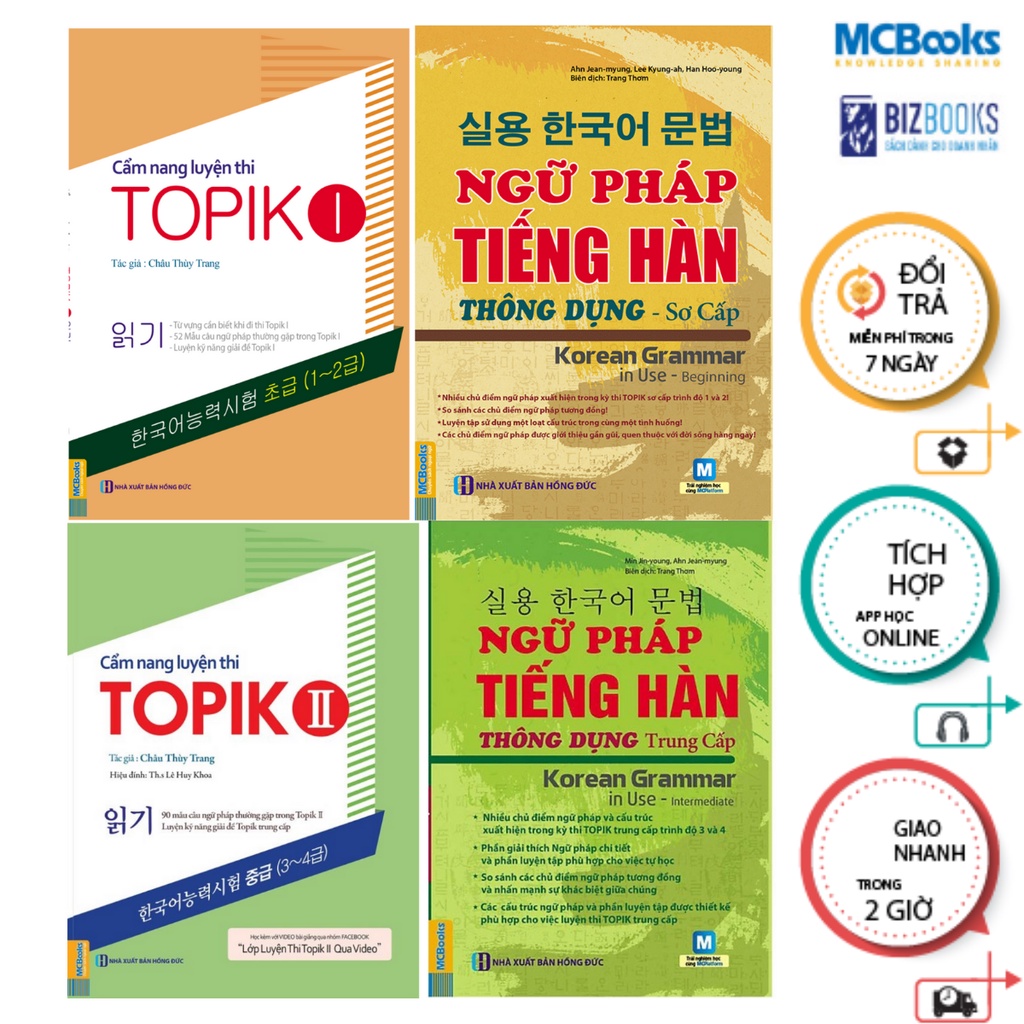 1. Ngữ pháp tiếng Hàn thông dụng sơ cấp Công ty phát hành MCBOOKS Tác giả Nhiều tác giả Nhà xuất bản Hồng Đức Năm xuất bản 2020 Số trang 325 Giới thiệu sách Để bắt đầu học môn ngôn ngữ chúng ta đều đi từ trình độ sơ cấp đi lên. Học ngữ pháp tiếng Hàn cũng vậy, bạn phải học từ những cấu trúc đơn giản nhất. Nhưng để học và sử dụng thành thạo những cấu trúc ngữ pháp tiếng Hàn thông dụng của sơ cấp lại không đơn giản bởi vì: Bạn là người mới bắt đầu học tiếng Hàn nhưng không biết nên học như thế nào cho hiệu quả Bạn là người mới bắt đầu học tiếng Hàn, bạn nhận thấy tầm quan trọng của việc học ngữ pháp trong cả học thuật lẫn giao tiếp. Bạn muốn học ngữ pháp bài bản nhưng lại không biết nên học từ đâu, học như thế nào để mang lại hiệu quả cao cũng như việc học phần nào trước, phần nào sau. Kiến thức nào là kiến thức cơ sở để học lên những kiến thức ngữ pháp khác. Tổng hợp hệ thống cấu trúc ngữ pháp trình độ sơ cấp phù hợp với những người mới bắt đầu học tiếng Hàn Cuốn sách này được thiết kế hoàn toàn phù hợp với những người mới bắt đầu học tiếng Hàn. Sách gồm có 3 phần chính tổng hợp các kiến thức chính về ngữ pháp tiếng Hàn sơ cấp và thêm nhiều phần kiến thức liên quan: – Phần 1: Giới thiệu tiếng Hàn Quốc (Phần này sẽ giúp các bạn bước đầu có những hình dung về tiếng Hàn, là tiền đề để bạn học tốt môn ngoại ngữ này) – Phần 2: 24 bài học hệ thống các cấu trúc ngữ pháp phù hợp với trình độ của các bạn – Phần 3: Phụ lục (Cung cấp thêm nhiều kiến thức bổ trợ và đáp án cho các bài luyện tập ở phía trước) 2. Ngữ pháp tiếng Hàn thông dụng – Trung Cấp Công ty phát hành MCBOOKS Tác giả Nhiều tác giả Nhà xuất bản Hồng Đức Năm xuất bản 2020 Số trang 325 Giới thiệu sách “Cuốn sách này là nguồn tài liệu tham khảo tuyệt vời cho người học ở trình độ trung cấp hoặc cao cấp. Các mục ngữ pháp được trình bày có hệ thống thông qua các ví dụ dễ hiểu kèm theo phần giải thích rõ ràng. Phần luyện tập hội thoại và các bài tập ở cuối chương cũng thực sự rất hữu ích. Tôi thực sự đánh giá rất cao cuốn sách này!” – Kylie McCallum, Giáo viên ESL và sinh viên KSL, New Zealand Những lợi ích mà cuốn sách này sẽ mang lại cho bạn là gì? + Phần giải thích ngữ pháp chi tiết và phần luyện tập phù hợp cho việc tự học Cuốn sách giúp các bạn hệ thống nhiều chủ điểm ngữ pháp và cấu trúc ở trình độ trung cấp thông qua 26 bài học. Mỗi bài học đi từ: Dẫn nhập -> Tìm hiểu ngữ pháp -> Tìm hiểu thêm -> Phân biệt -> Tạo hội thoại -> Luyện tập -> kiểm tra. Các bạn đang tự học hoàn toàn có thể tiếp thu bài học với các trình bày khoa học này. + So sánh các chủ điểm ngữ pháp tương đồng và nhấn mạnh sự khác biệt giữa chúng. Nhiều bạn hiểu ngữ pháp nhưng chưa nắm rõ các hạn định và quy tắc nên vẫn đặt sai câu, vì vậy, nhóm tác giả bổ sung thêm “tìm hiểu thêm” để các bạn tham khảo. Những câu trúc tương đồng dễ gây nhầm lẫn với các bạn được liệt kê, so sánh sự khác biệt một cách song song. Từ đó giúp các bạn có được cái nhìn tổng quan và chi tiết về những cấu trúc này. + Các cấu trúc ngữ pháp và phần luyện tập được thiết kế phù hợp cho việc luyện thi Topik trung cấp Bên cạnh hệ thống các cấu trúc thường có trong kỳ thi Topik 3, Topik 4 sách còn cung cấp các bài luyện tập dưới nhiều hình thức khác nhau để các bạn có thể vận dụng trong nhiều tình huống đa dạng. Sau mỗi chương sẽ có phần kiểm tra lại những ngữ pháp để các bạn ôn tập lại. Các câu hỏi của phần này được đưa ra theo hình thức đề thi Topik nhằm giúp người học làm quen với đề thi này. 3. Cẩm Nang Luyện Thi Topik I Công ty phát hành MCBOOKS Tác giả Châu Thùy Trang Nhà xuất bản Hồng Đức Năm xuất bản 2020 Số trang 190 Giới thiệu sách Sở hữu cuốn sách các bạn còn nhận được các video bài giảng qua nhóm facebook “Luyện thi Topik I qua video”. Đây là cơ hội tuyệt vời để các bạn có thể trao đổi các vấn đề về kỳ thi Topik với các giáo viên và các bạn cũng đang luyện thi Topik. Với mong muốn có thể hỗ trợ các bạn học tập tốt cuốn sách này sẽ tặng thêm cho các bạn cuốn cẩm nang luyện thi Topik I. Cẩm nang luyện thi Topik I là tài liệu hữu ích với các bạn đang luyện thi Topik I. Vừa được học thêm nhiều kiến thức các bạn lại còn có thêm nhiều cơ hội tương tác với những bạn đang ôn thi khác. Hi vọng các bạn sẽ vượt qua kì thi thành công cùng cuốn sách này. 4. Cẩm Nang Luyện Thi Topik II Công ty phát hành MCBOOKS Tác giả Châu Thùy Trang Nhà xuất bản Hồng Đức Năm xuất bản 2020 Số trang 250 Giới thiệu sách Cẩm nang luyện thi Topik II Cuốn sách giúp bạn không ngừng nâng cao khả năng tiếng Hàn Bạn đang thiếu chứng chỉ Topik cho việc học tập hoặc làm việc? Bạn cần m