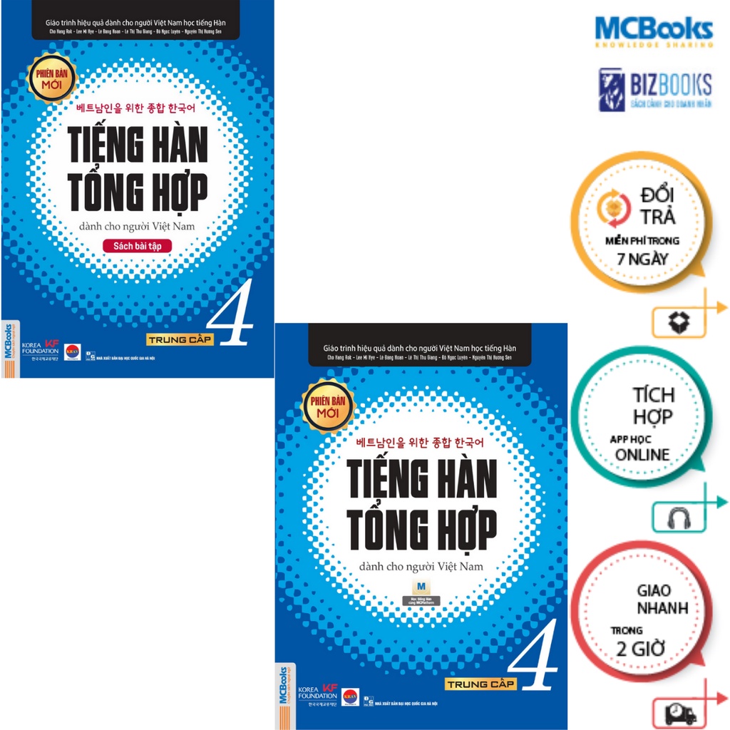 1. Giáo trình tiếng Hàn tổng hợp trung cấp 4 – đen trắng (phiên bản mới) Công ty phát hành MCBOOKS Tác giả Nhiều tác giả Nhà xuất bản Đại Học Quốc Gia Hà Nội Năm xuất bản 2020 Số trang 400 Giới thiệu sách Dưới sự đầu tư biên soạn với cấu trúc bài giảng hợp lý, bộ giáo trình tiếng Hàn tổng hợp dành cho người Việt Nam đang ngày càng phổ biến trong cộng đồng người học tiếng Hàn. Giáo trình tiếng Hàn tổng hợp trung cấp 4 là cuốn sách được biên soạn dành cho người Việt học tiếng Hàn đã hoàn thành trình độ Sơ cấp và trung cấp 3. Cấu trúc giáo trình cơ bản như cuốn 3 nhưng kiến thức chuyên sâu hơn giúp người học tiệm cận với tiếng Hàn ở một cấp độ cao hơn nhưng nội dung vẫn đảm bảo phù hợp và thuận tiện nhất cho người học. Tương đương trình độ TOPIK 4 Tặng kèm App học online tiện ích. Bởi vậy, cuốn sách là cẩm nang không thể thiếu đối với người học tiếng Hàn hiện nay 2. Tiếng Hàn Tổng Hợp Dành Cho Người Việt Nam – Trung Cấp 4 sách bài tập Công ty phát hành MCBOOKS Tác giả Nhiều tác giả Nhà xuất bản Đại Học Quốc Gia Hà Nội Năm xuất bản 2020 Số trang 156 Giới thiệu sách Tiếng Hàn tổng hợp dành cho người Việt Nam trung cấp 4 là bộ giáo trình dành cho người học ở trình độ tiếng Hàn trung cấp sau khi đã học hết sơ cấp 1, 2 và trung cấp 3. Bộ Tiếng Hàn tổng hợp trung cấp 4 gồm 2 cuốn là 1 sách giáo trình và 1 sách bài tập được thiết kế khoa học với đầy đủ 4 kỹ năng nghe – nói – đọc – viết. Trong đó, ở sách bài tập, các nội dung được biên soạn gắn liền với kiến thức từ giáo trình, nhằm hỗ trợ người học ôn tập, luyện tập kiến thức đã học từ giáo trình, rèn luyện thêm các kỹ năng, nâng cao khả năng ứng dụng thực tế. Sách bài tập Tiếng Hàn tổng hợp trung cấp 4 được biên soạn gồm 15 bài, chủ đề của mỗi bài sẽ tương ứng với sách giáo trình, mỗi bài lại gồm 3 phần chính. Ở cuối sách là phần đáp án chi tiết giúp người học có thể tự so sánh đáp án và kiểm tra lại bài làm của mình. Nội dung từng bài sẽ gồm những phần chính sau: Phần 1: Luyện tập từ vựng, giúp người học ôn tập và luyện tập từ vựng, ứng dụng vào các câu, tình huống cụ thể. Các từ vựng được đưa ra trên cơ sở phù hợp với nội dung và chủ đề được học trong giáo trình Tiếng Hàn tổng hợp trung cấp 4. Phần 2: Luyện tập ngữ pháp, giúp người học luyện tập các ngữ pháp tương ứng với ngữ pháp trong giáo trình. Bài tập được phân từ cơ bản đến nâng cao giúp người học có thêm kiến thức chuyên sâu vận dụng trong thực tế. Phần 3: Ôn luyện tổng hợp các kỹ năng giao tiếp như: nghe – nói – đọc – viết. Đặc biệt trong phần này còn có những bài luyện đa dạng nhằm nâng cao năng lực hoạt động thực tế cho người học.