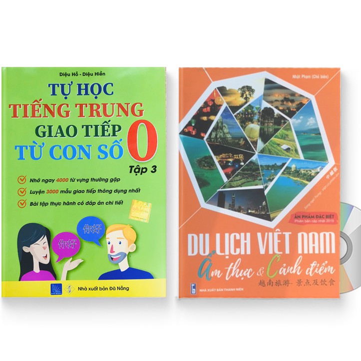 1. Combo: Tự Học Tiếng Trung Giao Tiếp Từ Con Số 0 Tập 3 + Du lịch Việt Nam – Ẩm thực và cảnh điểm + DVD quà ebook
