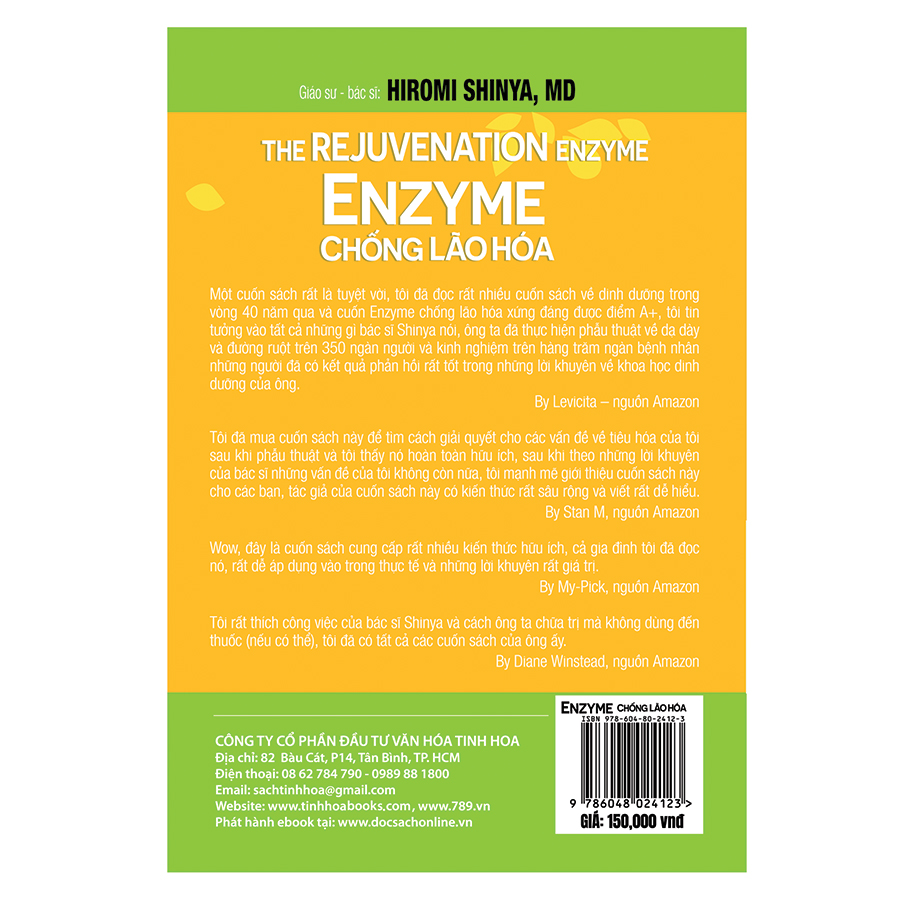 Enzyme Chống Lão Hóa (Tái Bản) Theo thống kê mới nhất của Bộ Y tế, hiện nay mỗi năm Việt Nam có 70.000 người chết vì ung thư và hơn 200.000 ca mắc bệnh mới. Ngoài ra những bệnh khác như: tiểu đường, tim mạch, huyết áp, đột quỵ, béo phì, Alzheimer ngày một gia tăng và trở thành gánh nặng cho cả gia đình, xã hội. Điều đặc biệt là nguyên nhân dẫn đến hầu hết các căn bệnh này bắt nguồn từ phong cách sống, thói quen ăn uống hàng ngày của từng bệnh nhân. Trong cuốn sách Điều trị ung thư của bác học Golzen người Đức có đoạn nói rằng: “Ung thư là sự trả thù của tự nhiên, bởi con người sử dụng thức ăn sai lầm. Trong 10.000 trường hợp ung thư thì 9.999 trường hợp là do sự đầu độc từ phân của chính mình. Chỉ có 1 trường hợp là do sự biến đổi thoái hóa mà thôi”. Kế thừa sự thành công vang dội của cuốn sách Nhân tố vi sinh, bác sĩ Hiromi Shinya tiếp tục cho ra đời tác phẩm ENZYME CHỐNG LÃO HÓA, đúc kết kinh nghiệm 40 năm làm việc của ông trong lĩnh vực đường ruột. Nó là món quà vô cùng quý giá giúp tôi và các bạn biết được cách ăn uống, cách đào thải độc tố, cách nghỉ ngơi như thế nào cho hợp lý để có một cơ thể khỏe mạnh, một nét mặt tươi trẻ, hạn chế tối đa việc dùng thuốc, đi gặp bác sĩ và sống đúng với tuổi thọ của mình. Những giá trị bạn sẽ nhận được từ tác phẩm Enzyme chống lão hóa: Làm thế nào để khôi phục tuổi thanh xuân bằng phương pháp tự nhiên? Hiểu được hệ thống tái chế tự động của Enzyme trong cơ thể của bạn. Enzyme trẻ hóa được lấy từ đâu? Làm thế nào để lấy năng lượng từ thực vật? Những khoáng chất nào cần thiết để tái tạo Enzyme? Sự nguy hiểm của những sản phẩm làm từ sữa. Collagen quý giá được lấy từ đâu? Phương pháp thụt rửa ruột bằng cafe Enema để tái tạo Enzyme và làm sạch ruột già. Tại sao nên uống “nước tốt – nước Kangen” mỗi ngày. Sự nguy hiểm khi tế bào zombie tấn công.