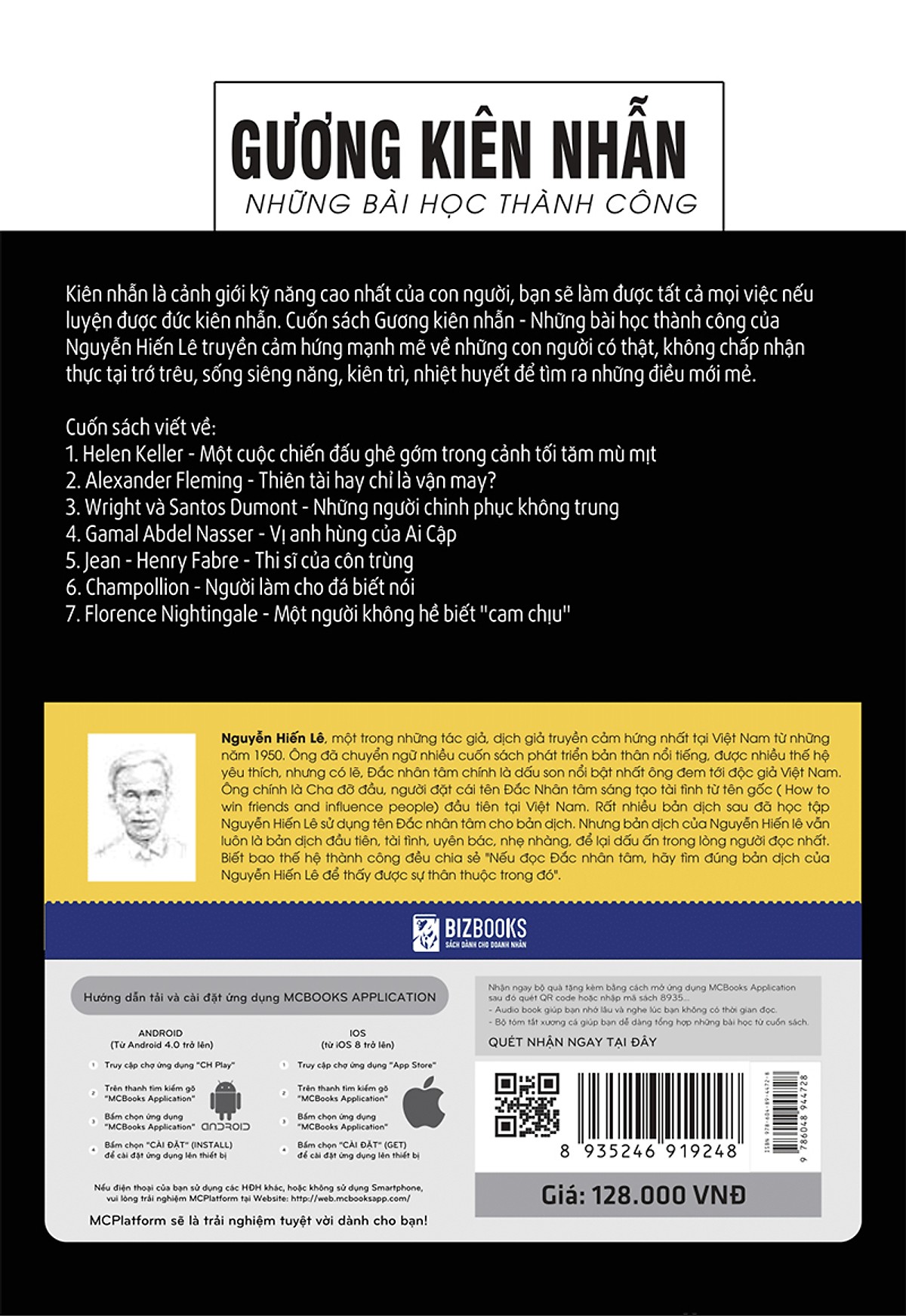 Kiên nhẫn là cảnh giới kỹ năng cao nhất của con người, bạn sẽ làm được tất cả mọi việc nếu luyện được đức kiên nhẫn. Không phải ai sinh ra cũng có đức tính này mà nó là cả một quá trình học tập, rèn luyện và tu dưỡng suốt cả đời. (Quà Tặng Audio book tại App MCBooks Applicayion bằng cách quét nhận dạng phía sau cuốn sách) Tại sao nhiều người luôn bình tĩnh và kiên trì với mọi việc còn bạn thì không? Cuộc sống luôn có những khó khăn, thử thách bắt buộc bạn phải đối đầu, không có tính kiên nhẫn bạn khó có thể vượt qua. Muốn thành công, bạn không thể không rèn luyện tính kiên nhẫn. Bạn muốn rèn luyện cho mình tính kiên nhẫn thế nhưng: Bạn là người dễ tức giận và nổi nóng bởi những thứ dù là nhỏ nhặt nhất. Bạn không kiểm soát được hành động của mình và đã rất nhiều lần vì việc này mà bạn phạm phải những sai lầm không đáng có. Bạn luôn nôn nóng muốn làm mọi việc nhanh nhất có thể nhưng đôi khi vì quá nóng vội lại dễ xôi hỏng bỏng không. Bạn dễ dàng cảm thấy chán nản và sẵn sàng từ bỏ những việc đang làm bởi những khó khăn nhất thời. Có rất nhiều cách để bạn rèn luyện tính kiên nhẫn, một trong số đó là hãy soi vào tấm gương của những người đi trước và rút ra những bài học kinh nghiệm cho bản thân để dần xây dựng đức tính kiên nhẫn. Nhưng ai là tấm gương tốt đáng để bạn noi theo? Bạn sẽ tìm hiểu được những câu chuyện của họ bằng cách nào? Với mong muốn các độc giả có thể tự mình rèn luyện và tu dưỡng tính kiên nhẫn thông qua các câu chuyện của những con người thành công, Bizbooks xin giới thiệu tới bạn đọc cuốn sách “Gương kiên nhẫn – Những bài học thành công”. Hy vọng rằng cuốn sách này sẽ là chất xúc tác giúp các bạn nhanh chóng hoàn thiện bản thân. Cuốn sách viết về: Helen Keller – Một cuộc chiến đấu ghê gớm trong cảnh tối tăm mù mịt Alexander Fleming – Tiên tài hay chỉ là vận may? Wright và Santos Dumont – Những người chinh phục không trung Gamal Abdel Nasser – Vị anh hùng của Ai Cập Jean – Henry Fabre – Ti sĩ của côn trùng Champollion – Người làm cho đá biết nói Florence Nightingale – Một người không hề biết “cam chịu” Thông qua cuốn sách Gương kiên nhẫn – Những bài học thành công, Nguyễn Hiến Lê truyền cảm hứng mạnh mẽ về những con người có thật, không chấp nhận thực tại trớ trêu, sống siêng năng, kiên trì, nhiệt huyết để tìm ra những điều mới mẻ. Cuộc sống của họ gặp không ít khó khăn nhưng nhờ có tính kiên nhẫn mà họ đã vượt qua tất cả để đi đến thành công. Các bạn độc giả sẽ nhanh chóng: Biết cách rèn luyện tính kiên nhẫn thông qua những câu chuyện của 7 danh nhân Nắm bắt được cách bình tĩnh để giải quyết các vấn đề, tránh nóng vội và giận dữ Học cách vượt qua các khó khăn thử thách, không nản lòng trước chông gai Cách kiểm soát hành động của bản thân trước những tình huống cấp bách Mong rằng sau những câu chuyện về những tấm gương này, độc giả sẽ tự rút cho mình những bài học kinh nghiệm quý báu về tính kiên nhẫn. Muốn thành công bạn phải trang bị cho mình tính kiên nhẫn, muốn kiên nhẫn các bạn hãy nhanh tay mua ngay cuốn sách “Gương kiên nhẫn – Những bài học thành công” của Nguyễn Hiến Lê.