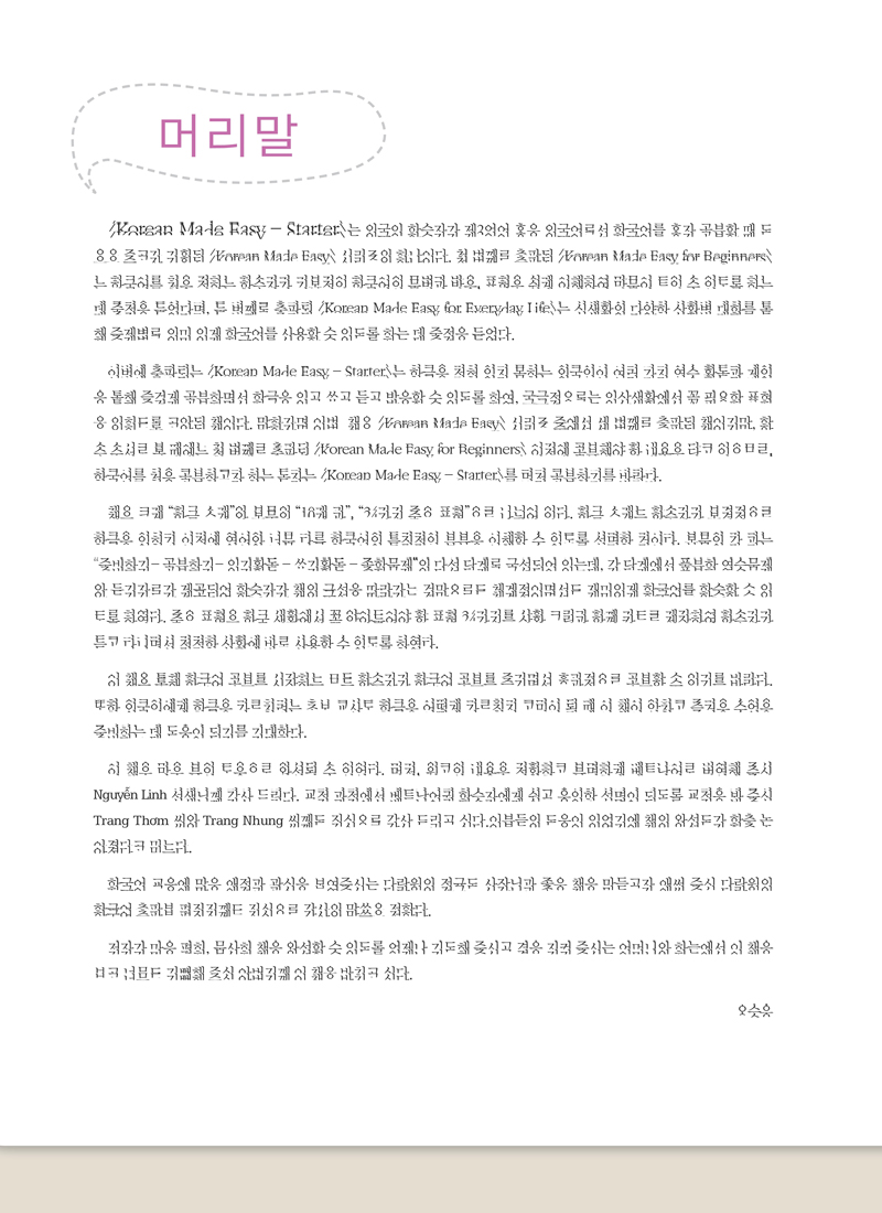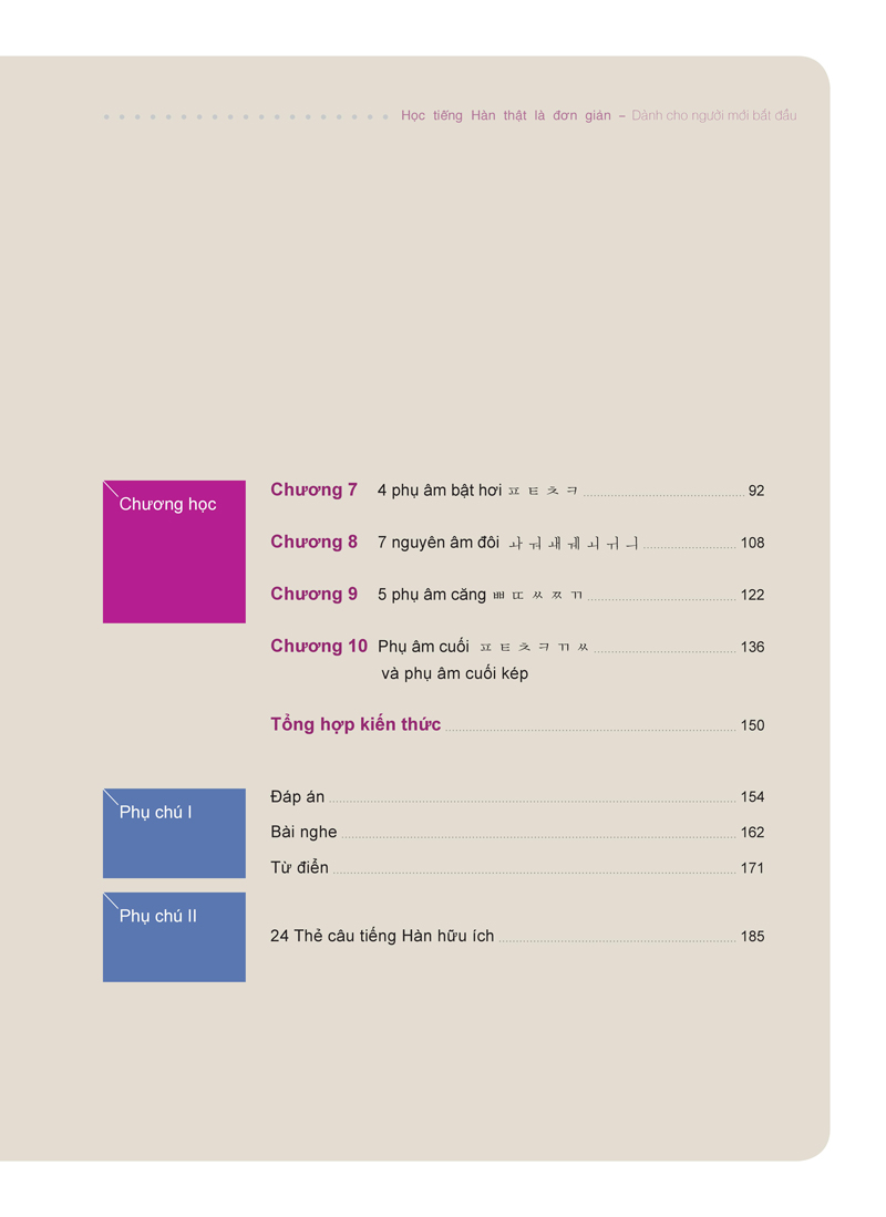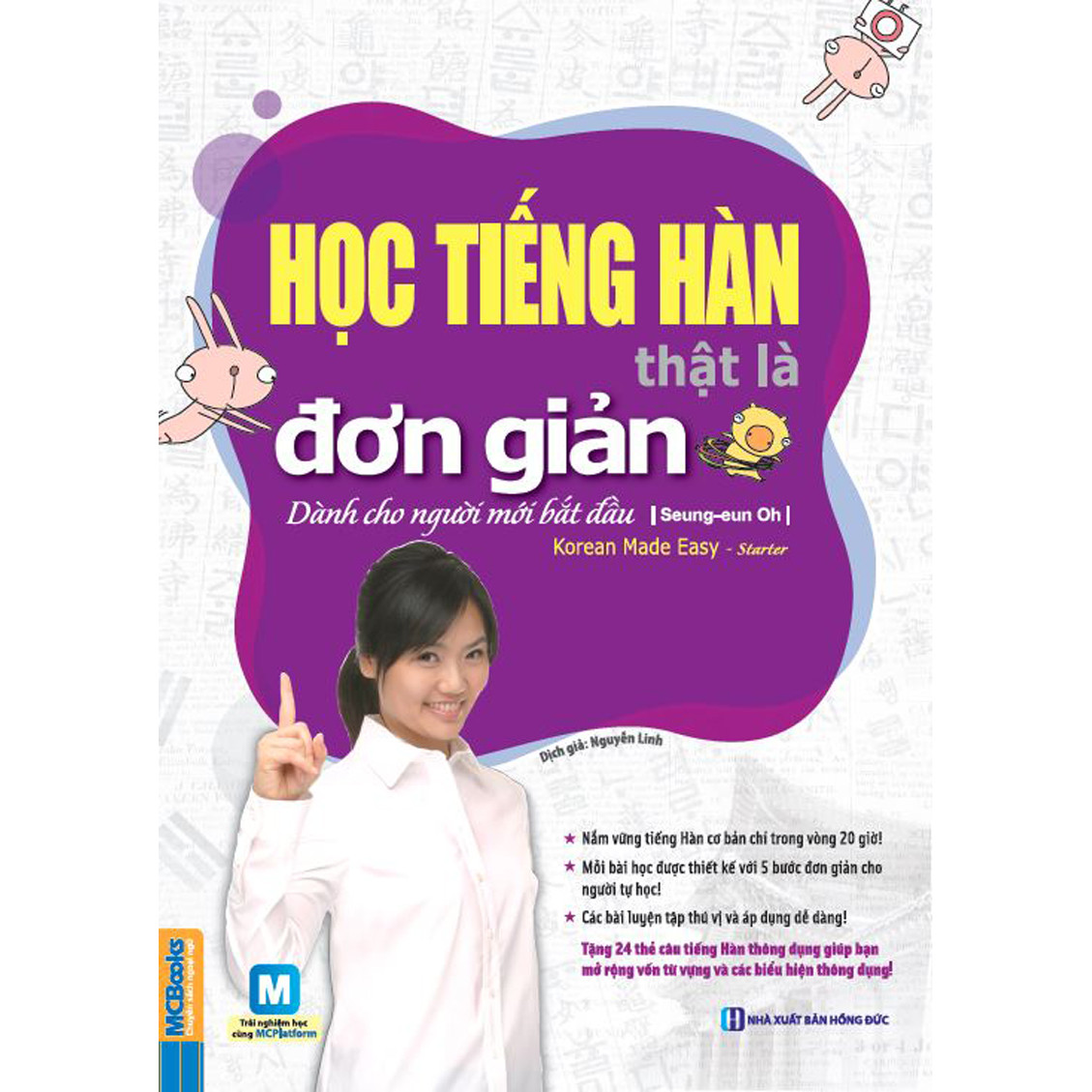Học tiếng hàn thật là đơn giản dành cho người mới bắt đầu Bạn muốn bắt đầu học tiếng Hàn một cách nghiêm túc và học bài bản ngay từ đầu nhưng những vấn đề dưới đây lại đang cản trở các bạn chinh phục môn ngoại ngữ này. Bạn là người mới bắt đầu học tiếng Hàn, nhưng lại dễ dàng có tâm lí muốn từ bỏ và không muốn tiếp tục học môn ngoại ngữ này Bạn đã quen với việc học các chữ cái la-tinh trong tiếng Việt và tiếng Anh nên khi gặp các chữ cái tượng hình trong tiếng Hàn, bạn thường cảm thấy choáng ngợp và không biết ghi nhớ ra sao. Nhiều bạn mới chỉ bắt đầu nhưng đã dễ dàng từ bỏ khi thấy khó khăn. Việc học những thứ căn bản trong tiếng Hàn như nguồn gốc của ngôn ngữ, các từ mượn,… có cần thiết trong quá trình học không? Nếu cần thiết thì nên học những thứ đó ở đâu? Bạn không tìm được phương pháp giúp thành thạo tiếng Hàn cơ bản trong một thời gian ngắn So với các ngôn ngữ cũng có bảng chữ tượng hình như tiếng Trung, tiếng Nhật thì tiếng Hàn được xem là thứ tiếng dễ dàng hơn. Nói như thế không phải là ai học tiếng Hàn cũng dễ dàng thành thạo được. Nhiều trường hợp học tiếng Hàn từ 3 – 4 tháng nhưng vẫn không có đủ tự tin khi sử dụng tiếng Hàn cơ bản. Học Tiếng Hàn Thật Là Đơn Giản – Dành Cho Người Mới Bắt Đầu Mỗi bài học được thiết kế với 5 bước đơn giản cho người tự học Cuốn sách gồm có 10 chương đề cập đến toàn bộ hệ thống nguyên âm và phụ âm tiếng Hàn. Mỗi chương được chia thành 5 bước nhỏ. Bước 1: Khởi động Thông qua các bài nghe được ghi âm sẵn, người học có thể tập trung học cách phát âm những vật và khái niệm thường gặp trong đời sống thường ngày ở Hàn Quốc. Các bạn còn được làm các bài luyện tập, người học có thể tự tập nói bằng tranh và không bị quá lệ thuộc vào việc đọc chữ. Bạn còn có thể làm quen với những biểu hiện tiếng Hàn bằng cách nghe đĩa và trả lời câu hỏi. Nội dung bài nghe được in đầy đủ ở phần phụ chú. Bước 2: Học lý thuyết Trong bước 2 các bạn sẽ được học nghe và ký hiệu phát âm. Nhằm giúp các bạn phát âm các từ đã được học ở bước 1 tốt hơn, bước 2 tập trung vào những nguyên âm và phụ âm cấu thành nên những từ đó. Bước 2 còn giúp các bạn hiểu thêm các lí thuyết và cách phát âm của các nguyên âm và phụ âm chủ điểm với hình minh họa sống động. Giải thích chi tiết nguyên âm và phụ âm gây khó khăn cho người học. Ngoài ra sách còn cung cấp các bí quyết phát âm hỗ trợ bạn tập phát âm chuẩn những nguyên âm và phụ âm khó. Bước 3: Tập đọc Ở bước này người học được rèn luyện cách đọc âm tiết, đọc âm tiết và từ cùng các quy tắc phát âm đặc biệt. Bước 4: Tập viết Nếu chữ tượng hình còn làm bạn lo lắng thì bước 4 sẽ giúp các bạn giải quyết khó khăn đó. Bước 4 đưa ra cách viết những nguyên âm và phụ âm chủ điểm theo thứ tự chính xác, cũng như các bí quyết làm thế nào để tránh những lỗi mà người học tiếng Hàn thường gặp phải. Kèm theo đó là những bài tập viết giúp các bạn ghi nhớ và củng cố lại kiến thức. Bước 5: Tự kiểm tra Phần này cung cấp các trò chơi vui nhộn với những từ được cấu tạo nên từ những nguyên âm và phụ âm đã học với những nguyên âm và phụ âm chủ điểm đang học. Các bạn có thể liên hệ dễ dàng giữa cách phát âm và nghĩa của từ thông qua những hình ảnh minh họa sinh động và những bài tập phong phú