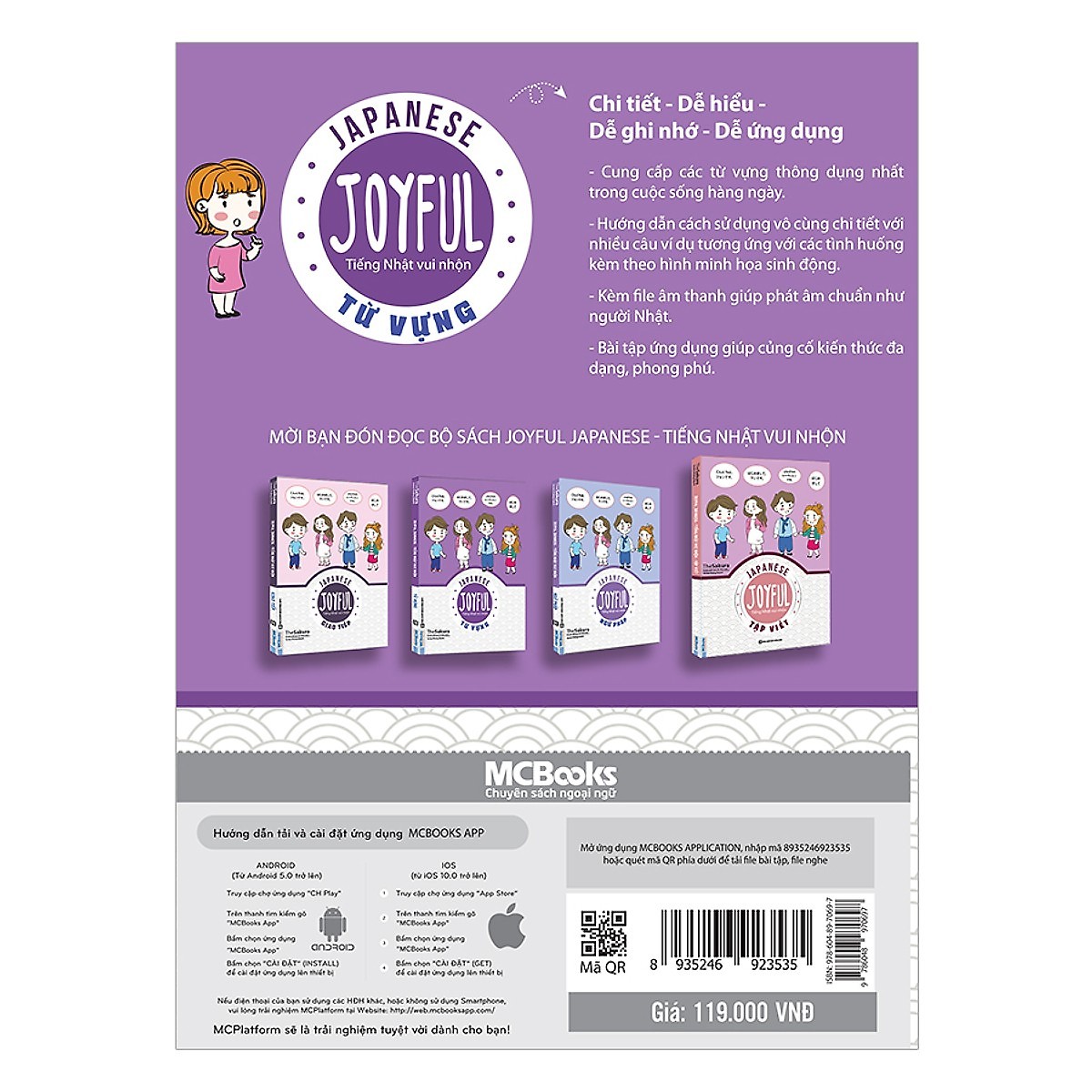 JOYFUL JAPANESE – Tiếng nhật vui nhộn – Từ vựng Bạn yêu thích văn hóa Nhật Bản, yêu thích các bộ truyện Manga, Anime hay đơn giản là muốn đi du lịch tới xứ sở hoa anh đào xinh đẹp? Sẽ thật tuyệt vời hơn nếu như chúng ta có thể hiểu về ngôn ngữ của đất nước này. Tiếng Nhật hiện tại được đào tạo khá phổ biến ở Việt Nam bởi sự hấp dẫn từ những cơ hội làm việc, hợp tác cùng các đối tác Nhật Bản giúp cho chúng ta có được mức lương cao, chế độ đãi ngộ tốt và môi trường làm việc chuyên nghiệp. Tuy nhiên, là một trong số những ngôn ngữ khó nhất thế giới, tiếng Nhật vẫn còn là một trở ngại lớn với người Việt. Những người bắt đầu học tiếng Nhật sẽ mất một khoảng thời gian khá dài để có thể làm quen với mặt chữ và cách phát âm trong tiếng Nhật, nhiều người không đủ kiên trì sẽ bỏ cuộc ngay từ khi học chữ, cũng có những người kiên trì học tiếp nhưng học với một tâm thế mệt mỏi và nhàm chán khiến cho thời gian học tiếng Nhật kéo dài và không hiệu quả. Trở ngại lớn nhất khi học tiếng Nhật của người Việt là từ vựng, từ vựng trong tiếng Nhật mang tính chất tượng hình khác hoàn toàn so với tiếng Việt. Vì vậy, những người bắt đầu học tiếng Nhật sẽ cảm thấy vô cùng khó nhớ và khó viết. Vậy làm thế nào để học tiếng Nhật nhanh chóng và hiệu quả? Kiên trì và nghiêm túc là điều kiện cần để bạn có thể học tiếng Nhật thành công, bên cạnh đó bạn cần thêm một điều kiện đủ nữa là chọn đúng tài liệu để học. Và nếu bạn đã có hai điều này thì thật tuyệt vời, bạn đã vượt qua thành công ⅓ con đường chinh phục tiếng Nhật rồi đó. Hiểu được điều đó, ban biên soạn The Sakura đã dày Công nghiên cứu và biên soạn bộ sách tự học “JOYFUL JAPANESE – TIẾNG NHẬT VUI NHỘN” dành cho những người tự học tiếng Nhật tại nhà hoặc làm tài liệu tham khảo cho các bạn đang theo học các lớp tiếng Nhật. Bộ sách gồm có 4 cuốn: Hội thoại – Ngữ pháp – Từ vựng – Tập viết. Mỗi cuốn bao gồm 18 bài học cung cấp cho các bạn lượng kiến thức giao tiếp trong rất nhiều những tình huống quen thuộc của đời sống hàng ngày. Với 18 bài học là từng chủ đề giao tiếp thông dụng nhất trong cuộc sống, cuốn “JOYFUL JAPANESE – Tiếng nhật vui nhộn – Từ vựng” trước hết giúp bạn nắm được những từ vựng cơ bản nhất trong giao tiếp tiếng Nhật từ loại từ, ngữ nghĩa đến cách đọc theo file âm thanh (dùng kết hợp với app trên điện thoại) , tiếp theo là giúp bạn hiểu, luyện tập và nâng cao khả năng sử dụng tiếng Nhật một cách hứng thú và hiệu quả qua các bài tập bổ trợ. Cuốn sách được thiết kế sinh động, dễ hiểu, dễ ghi nhớ và ứng dụng giúp bạn: Nắm chắc các từ vựng tiếng Nhật thông dụng nhất trong cuộc sống hàng ngày Hướng dẫn cách sử dụng từ vựng tiếng Nhật vô cùng chi tiết với nhiều câu ví dụ tương ứng với các tình huống kèm theo hình ảnh minh họa sinh động Sách có hỗ trợ app trên điện thoại giúp bạn nghe và phát âm chuẩn như người Nhật Bài tập ứng dụng giúp củng cố kiến thức đa dạng, phong phú. * Giá sản phẩm trên Tiki đã bao gồm thuế theo luật hiện hành. Tuy nhiên tuỳ vào từng loại sản phẩm hoặc phương thức, địa chỉ giao hàng mà có thể phát sinh thêm chi phí khác như phí vận chuyển, phụ phí hàng cồng kềnh,