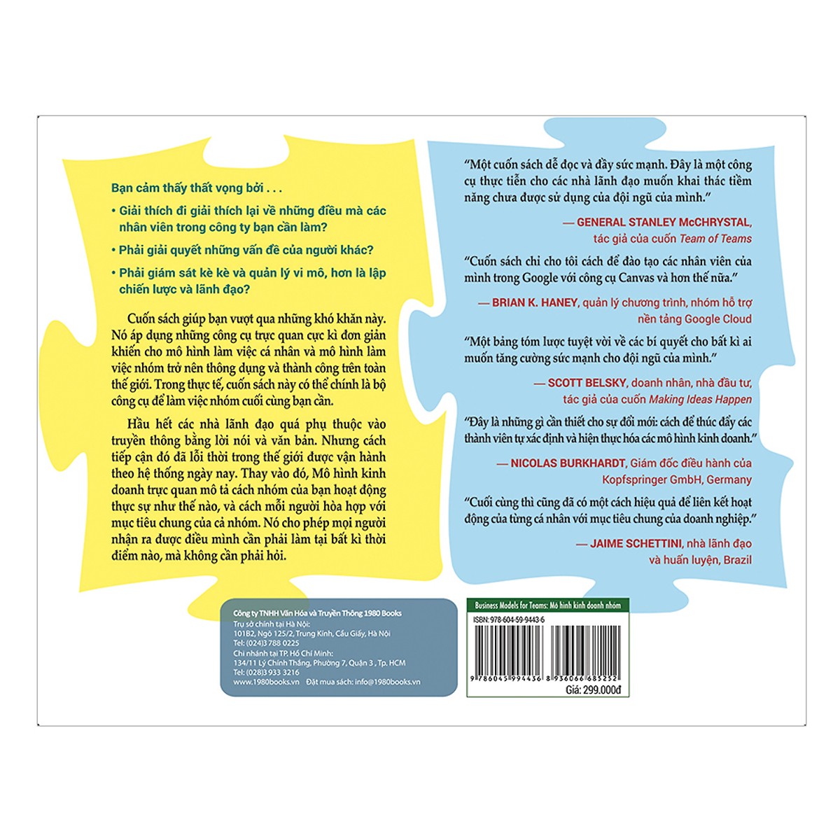 Mô Hình Kinh Doanh Nhóm Những người làm quản lý hẳn đã không còn xa lạ với series sách Business Models, những tác phẩm phân tích mô hình kinh doanh có khổ sách ngang rất đặc trưng. Cuốn sách mới nhất thuộc series này, cuốn “Mô hình kinh doanh nhóm” (Business Models for Teams) đã chính thức được xuất bản tại Việt Nam. Hiện tại, tận dụng tốt nguồn nhân lực là một trong những vấn đề lớn nhất của doanh nghiệp, vì bất kỳ nhà quản lý nào cũng muốn đội ngũ của mình thật tinh gọn. Nhưng phát triển khả năng làm việc nhóm, liên kết hành động giữa các cá nhân thành một qui trình thống nhất, trơn tru chưa bao giờ là nhiệm vụ dễ dàng. Chính vì vậy, Tim Clark và Bruce Hazen – những chuyên gia tư vấn doanh nghiệp đã cùng nhau viết “Mô hình kinh doanh nhóm”, với mục đích trợ giúp các cá nhân đang “tuyệt vọng”. Cuốn sách này dành cho những ai đang cảm thấy cực kỳ tệ hại: Họ phải giải thích tới lui về những điều cần làm cho mỗi cá nhân trong công ty Phải gồng gánh và giải quyết những vấn đề của người khác, kể cả khi đó không phải nhiệm vụ của họ Họ không có thời gian tập trung lập chiến lược và lãnh đạo, vì luôn phải kè kè giám sát và xử lý những đầu việc nhỏ nhặt “Mô hình kinh doanh nhóm”của Tim Clark và Bruce Hazen giúp bạn giải quyết 99% các khó khăn liên quan tới làm việc nhóm. Bằng việc cung cấp các công cụ trực quan đơn giản xuyên suốt tác phẩm, bộ đôi tác giả đã trợ giúp đắc lực cho những doanh nghiệp, những phòng ban, những đội nhóm phát huy đến 200% hiệu suất của mình. Đây là điều hoàn toàn khả thi, khi các đồng nghiệp biết cách phối hợp trí tuệ và nâng lực của mình, sau đó nâng chúng lên một tầm cao mới.
