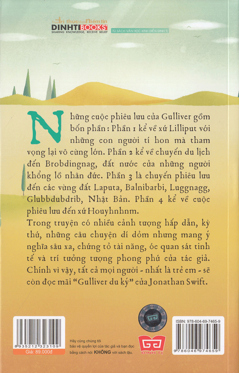 Gulliver Du Ký (Tái Bản) – Đinh Tị Books Chắc rằng chưa ai có những cuộc phiêu lưu kỳ thú như chàng bác sĩ – thuỷ thủ Guliver. Gặp bão, giạt vào xứ sở tí hon, rơi vào đất nước khổng lồ, lang thang trên đảo bác học, chia sẻ cuộc sống với những người – ngự mỗi trang viết đều đầy ắp sự kiện và yếu tố bất ngờ. Gulliver du ký đã được dịch ra hàng trăm thứ tiếng, được giới thiệu bằng sách, phim, bằng phim, bằng các đồ chơi lưu niệ Và qua mấy trăm năm nay, vẫn được hàng triệu triệu bạn đọc đón chà