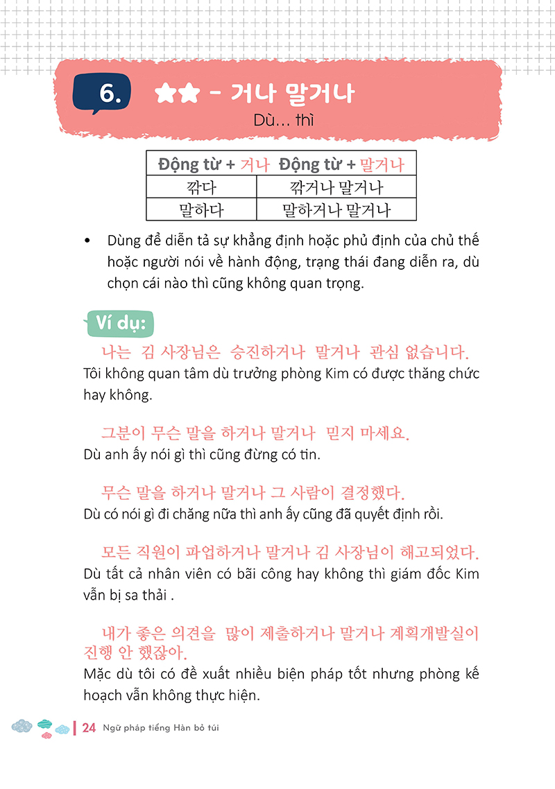Đâu là lý do “dẫn dắt” bạn đến với tiếng Hàn và đất nước Hàn Quốc xinh đẹp? Tôi nghĩ: Bạn đang có ý định học tiếng Hàn để đi du học, Bạn chuẩn bị đi xuất khẩu lao động Hàn Quốc, Cũng có thể, bạn là fan muốn đi gặp các oppa Hàn Quốc. Để làm được những điều đó, bạn phải biết Tiếng Hàn phải không nào? Nhưng với bạn NGỮ PHÁP là món “khó nhằn nhất” khi bắt đầu học Tiếng Hàn. Đừng bỏ qua email này nếu như bạn thực sự muốn làm được những điều mình muốn như trên, bởi chúng tôi không chỉ giúp bạn lựa chọn những cuốn sách được xem như bí kíp cải thiện kỹ năng trong học ngoại ngữ, mà còn giúp bạn biến những ước mơ thành sự thật ở xứ sở kim chi. Làm sao để giúp bạn học tốt phần NGỮ PHÁP TIẾNG HÀN: Bạn phải có mục tiêu đối với lộ trình học Tiếng Hàn của mình Bạn phải có một người thầy dẫn dắt, ít nhất là khi mới bắt đầu Bạn cũng nên có một người bạn đồng hành cùng mình Bạn phải tìm ra được những tài liệu phù hợp trong quá trình học Bạn phải có tinh thần tự giác, chăm chỉ luyện tập mỗi ngày Nhưng, khi bạn bất chợt bắt gặp một ngữ pháp tiếng Hàn trong sách, trong cuộc sống hằng ngày, nhưng lại không biết ý nghĩa của nó, vì vậy bạn không thể nắm bắt chính xác nội dung của ngữ cảnh và tình huống? Bạn gặp khó khăn với các cấu trúc câu vô cùng khó nhớ? Bạn muốn áp dụng một ngữ pháp đã học, nhưng lại không dám sử dụng vì không tài nào nhớ nổi các trợ từ đi kèm? Bạn muốn mình có thể hiểu và vận dụng thành thạo được các ngữ pháp tiếng Hàn theo nhiều cách khác nhau, nhưng lại không muốn mang theo cuốn sách giáo trình bên mình? Hiểu được những khó khăn mà một người theo học ngoại ngữ thường gặp phải, cuốn sách “Ngữ pháp tiếng Hàn Bỏ Túi” dưới dạng một cuốn cẩm nang bỏ túi, tổng hợp phần lớn những ngữ pháp quan trọng và phổ biến trong tiếng Hàn mà một người học tiếng có thể bắt gặp trong quá trình nghiên cứu và học tập. Bạn không biết nên tự học tiếng Hàn từ tài liệu nào? Công việc và việc học tập quá bận rộn, bạn không đủ thời gian cho các khóa học ở trung tâm. Nhiều bạn học sinh, sinh viên không trang trải nổi chi phí 3 – 5 triệu đồng cho các khóa tiếng Hàn cơ bản tại trung tâm nên quyết định tự học bằng cách nghiên cứu tài liệu. Các bạn tự học hầu như đều không biết nên học từ đâu, học như thế nào để ngay từ khi bắt đầu bạn không thấy chán. Trên thị trường có rất nhiều tài liệu tiếng Hàn, nhưng càng nhiều lại càng dễ làm bạn “loạn”. Trong bể tài liệu kia đâu mới là cuốn sách đúng chuẩn, phù hợp với những người mới bắt đầu như bạn. Không có phương pháp học giao tiếp hiệu quả Bạn đã thử học giao tiếp tiếng Hàn bằng nhiều phương pháp ở nhiều trung tâm, qua nhiều thầy cô giáo nhưng trình độ của bạn vẫn không được cải thiện. Tư duy ngôn ngữ của bạn vẫn chưa được thay đổi, bạn có thể nghe hiểu nhưng không thể nói. Bạn phản xạ chậm làm người những người đối thoại phải mất nhiều thời gian để chờ đợi, đôi khi điều đó làm bạn giống như bị cô lập vì không hiểu những người xung quanh đang nói về chủ đề gì. Mỗi ngày trôi qua bạn đều tự học tiếng Hàn nhưng học mãi mà trình độ vẫn “lẹt đẹt” chỉ vì những rào cản trên. Bạn có tin mỗi ngày bạn chỉ cần bỏ ra 15 phút, chỉ trong 3 tháng liên tục và đều đặn thực hiện là bạn có thể giao tiếp tiếng Hàn cơ bản? Cuốn sách “Ngữ pháp tiếng Hàn Bỏ Túi”sẽ giúp bạn làm điều đó. “Ngữ pháp tiếng Hàn Bỏ Túi” là cuốn sách tuyệt vời cho người học tiếng Hàn Các ngữ pháp trong cẩm nang “Ngữ pháp tiếng Hàn Bỏ Túi” được sắp xếp theo thứ tự bảng chữ cái tiếng Hàn để tiện cho người sử dụng trong việc tra cứu. Mỗi ngữ pháp xuất hiện trong cuốn cẩm nang đều được liên kết với một ngữ pháp trong tiếng Việt, giúp người đọc có thể hình dung được ý nghĩa khái quát của ngữ pháp. Bên cạnh việc hướng dẫn sử dụng ngữ pháp và giải thích ý nghĩa, mục đích sử dụng cũng như chỉ rõ các tiếng huống mà ta có thể sử dụng ngữ pháp đó, chúng tôi cũng đưa ra các ví dụ cụ thể trong các ngữ cảnh phong phú, kèm theo dịch nghĩa tiếng Việt cho mỗi ngữ pháp. Nhờ cách biên soạn đầy đủ nhưng ngắn gọn này, người sử dụng cẩm nang sẽ chỉ mất vài giây để tìm kiếm một ngữ pháp, hiểu được ý nghĩa cũng như cách sử dụng của ngữ pháp; và ngay lập tức có thể áp dụng ngữ pháp này trong giao tiếp hay học tập và làm việc. Ngoài mục đích tra cứu, “Ngữ pháp tiếng Hàn Bỏ Túi” cũng hoàn toàn phù hợp để sử dụng như một cuốn giáo trình ngữ pháp bỏ túi: bạn có thể chọn lấy cho mình mỗi ngày một ngữ pháp bất kỳ trong cẩm nang để rèn luyện và trau dồi khả năng sử dụng tiếng Hàn linh hoạt của mình. Những người biê