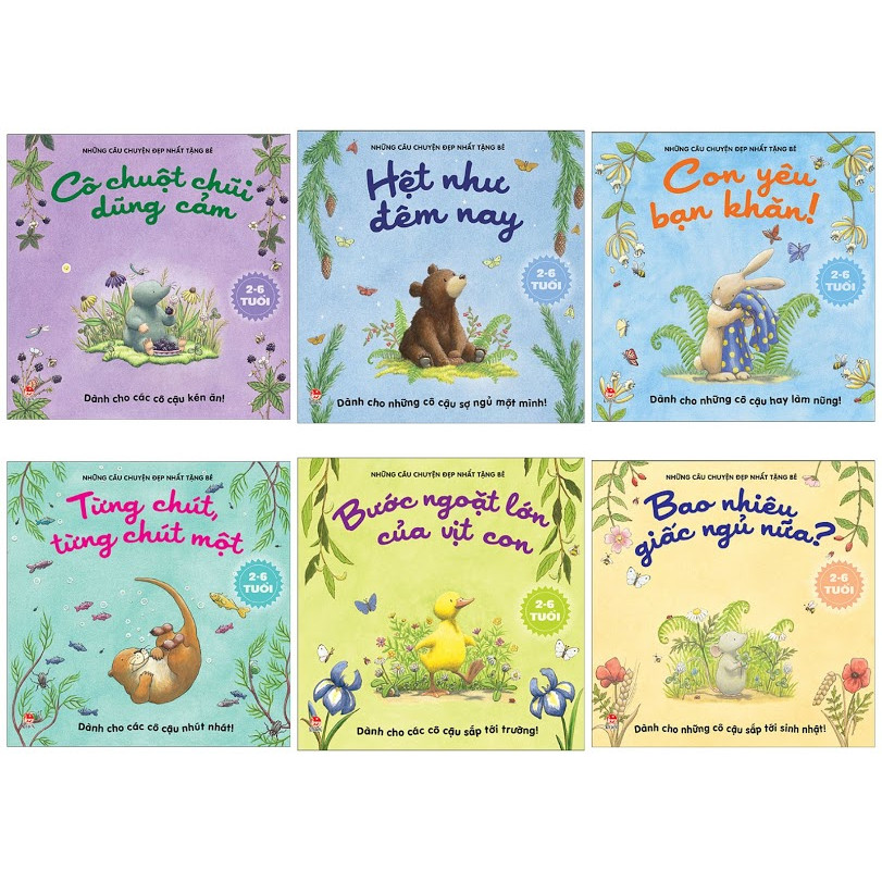 Bộ “Những câu chuyện đẹp nhất tặng bé” tập hợp những mẩu truyện nhỏ ấm áp như cổ tích xa xưa dành cho các bạn nhỏ. Nhân vật trong mỗi câu chuyện có có thể là cô thỏ bé Bean rất “yêu bạn khăn” và nghĩ rằng mình sẽ không bao giờ có thể rời xa chiếc khăn yêu quý, chú chuột Toast cùng bố đếm từng giấc ngủ đến ngày sinh nhật, hay chú vịt con Puddle bé bỏng với ngày đầu tiên đi học – một “bước ngoặt” lớn lao trong cuộc đời! Bộ truyện ngọt ngào và dịu dàng như một chiếc kẹo sẽ gửi đến các bạn nhỏ thông điệp giản dị mà sâu sắc về tình yêu, lòng dũng cảm và ước mơ lớn khôn, trưởng thành! Combo 6 cuốn : Cô chuột chũi dũng cảm – dành cho các cô cậu kén ăn! Hệt như đêm nay – dành cho những cô cậu sợ ngủ một mình! Con yêu bạn thân – danh cho những cô cậu hay làm nũng! Từng chút từng chút một – dành cho các cô cậu nhút nhát! Bước ngoặt của vịt con – dành cho các cô cậu sắp tới trường! Bao nhiêu giấc ngủ nữa? – dành cho những cô caauh sắp tới sinh nhật