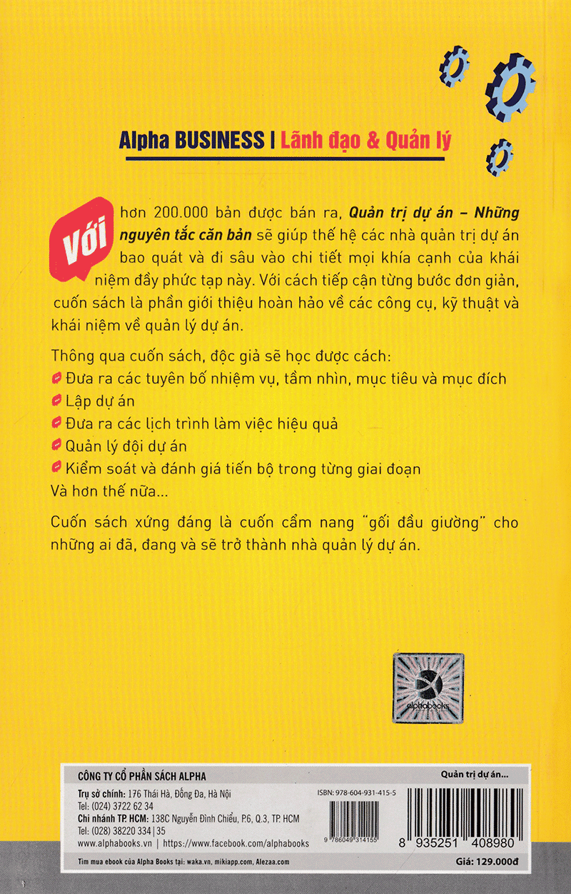 Quản Trị Dự Án – Những Nguyên Tắc Căn Bản (Tái Bản) Quản trị dự án là việc áp dụng các kiến thức, các kỹ năng, các công cụ và kỹ thuật để lên kế hoạch hành động nhằm đạt được các yêu cầu của dự án. Với cách tiếp cận từng bước đơn giản, cuốn sách là lời chỉ dẫn hoàn hảo về các công cụ, kỹ thuật và khái niệm quản trị dự án. Người đọc sẽ học cách xây dựng báo cáo chiến lược, tầm nhìn, mục tiêu, đối tượng, lập kế hoạch dự án, lập thời khóa biểu công việc, nắm được cách phân tích doanh thu, quản lý đội dự án, điều khiển và đánh giá tiến độ ở từng giai đoạn. – Một dự án là một nỗ lực có thời hạn nhằm tạo ra một sản phẩm, một dịch vụ hoặc một kết quả duy nhất. – Một dự án cũng là một “rắc rối” được lập trình để giải quyết. – Quản trị dự án là việc áp dụng các kiến thức, các kỹ năng, các công cụ và kỹ thuật để lên kế hoạch hành động nhằm đạt được các yêu cầu của dự án. Công tác quản trị dự án được hoàn thành thông qua việc áp dụng và phối hợp áp dụng 42 biện pháp quản trị dự án được phân thành 5 nhóm phương pháp: Khởi xướng, Lập kế hoạch, Triển khai thực hiện, Giám sát và kiểm soát, Kết thúc. – Mọi dự án đều chịu áp lực từ các yêu cầu về Chất lượng thực hiện, Thời gian, Chi phí và Quy mô. Nhà tài trợ dự án chỉ có thể xác định và yêu cầu trước giá trị của 3 trong số 4 biến số này. Giá trị biến số còn lại phải do đội dự án quyết định. – Các dự án có xu hướng thất bại bởi đội dự án không dành thời gian để nghiên cứu và đảm bảo chắc chắn rằng họ đã phát triển một định nghĩa phù hợp về “rắc rối” mà dự án cần giải quyết. – Các giai đoạn chính của một dự án bao gồm hình thành khái niệm, định nghĩa nhiệm vụ, lập kế hoạch, thực thi và kiểm soát, và kết thúc. Với cách tiếp cận từng bước đơn giản, cuốn sách là lời chỉ dẫn hoàn hảo về các công cụ, kỹ thuật và khái niệm quản trị dự án. Người đọc sẽ học cách xây dựng báo cáo chiến lược, tầm nhìn, mục tiêu, đối tượng, lập kế hoạch dự án, lập thời khóa biểu công việc, nắm được cách phân tích doanh thu, quản lý đội dự án, điều khiển và đánh giá tiến độ ở từng giai đoạn.