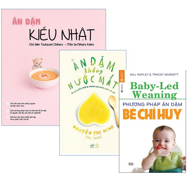1. Phương pháp ăn dặm bé chỉ huy Công ty phát hành Thái Hà Nhà xuất bản Nhà Xuất Bản Lao Động Tác giả Gill Rapley & Tracey Murket Loại bìa Bìa mềm Kích thước 15.5 x 24 cm Ngày xuất bản 02-2014 Nếu bạn đã quen với hình ảnh các bé được mẹ dùng muỗng đút thức ăn nghiền nhuyễn vào miệng, bé nhè ra và mẹ lại vét vào cho đến khi nào bé nuốt thì thôi, thì BLW sẽ là một hình ảnh hoàn toàn khác. Với phương pháp này, sẽ không có chuyện đút muỗng hay nghiền nhuyễn, mà ba mẹ sẽ cung cấp cho bé những thức ăn có hình dạng và kích cỡ phù hợp để bé có thể cầm lấy và tự đút cho mình bằng các ngón tay, tự chọn thức ăn, tự quyết định ăn bao nhiêu và ăn với tốc độ như thế nào. Rất có thể nhiều mẹ sẽ lo lắng bé ăn như thế nhỡ bị hóc thì sao. Thực ra, bé cũng như người lớn, dễ bị hóc hay nghẹn hơn khi có người đút cho, bởi về cơ bản đó là kiểu ăn thụ động – bé không kiểm soát được lượng thức ăn đưa vào. Khi bé tự cho thức ăn vào miệng thì bé cũng nhận thức là mình đang ăn và sẽ điều khiển lưỡi, hàm, môi, họng một cách phù hợp. Nếu thức ăn to quá thì bé sẽ nhè ra. Tất nhiên, việc bé bị ọe vào thời gian đầu là hoàn toàn có thể. Nhưng ọe chỉ là một phản ứng của bé khi không chấp nhận đồ ăn. Sau vài lần ọe thì bé cũng hình thành ý thức và kỹ năng để biết ăn bao nhiêu, ăn như thế nào cho khỏi ọe. Thất bại là mẹ thành công mà. Đã áp dụng phương pháp BLW thì mẹ phải tin tưởng bé. Tất cả những em bé khỏe mạnh đều có thể làm điều đó từ 6 tháng tuổi, khi bé đã có thể ngồi khá vững và hệ tiêu hóa cũng như miễn dịch đã đủ trưởng thành giúp bé hấp thụ các thức ăn khác ngoài sữa. Bé không cần được đút muỗng, bé chỉ cần được tạo cơ hội để tự ăn mà thôi. BLW sẽ giúp bé ăn uống một cách thoải mái, tự lập và rèn luyện kỹ năng ăn cho bé, cụ thể là:- Cho phép bé khám phá mùi vị và cảm giác về độ thô mịn;- Khuyến khích sự độc lập và tự tin;- Giúp bé phát triển các kỹ năng nhai và phối hợp giữa mắt và tay- Làm cho bữa ăn của bé bớt áp lực. 3. Ăn dặm kiểu Nhật Công ty phát hành Thái Hà Nhà xuất bản Nhà Xuất Bản Lao Động Xã Hội Tác giả Tsutsumi Chiharu Loại bìa Bìa mềm Kích thước 21 x 23.5 cm Số trang 176 Ngày xuất bản 10-2018 Bộ sách ăn dặm thần thánh của các mẹ Bạn đã làm cha mẹ. Và bạn có lúng túng với bước đầu cho bé yêu ăn dặm? Giai đoạn ăn dặm có vai trò là giai đoạn chuẩn bị để trẻ chuyển từ bú mẹ, uống sữa ngoài sang “nhai nát và nuốt”. Điều quan trọng của giai đoạn này không chỉ là cho trẻ ăn và theo dõi đảm bảo sự phát triển của trẻ mà còn phải theo dõi chức năng ăn và lôi kéo hợp lý sự ham thích ăn của trẻ, làm cho trẻ tự lập. Để làm được những việc đó, thống nhất quan điểm là rất quan trọng, phải thống nhất về việc lựa chọn thực phẩm, lượng ăn, cách ăn, những người lớn xung quanh giúp đỡ như thế nào. Tuy nhiên việc ăn dặm là việc hàng ngày. Bạn có đang băn khoăn trăn trở nên cho trẻ ăn gì, ăn bao nhiêu, ăn như thế nào không. Trong giai đoạn lần đầu tiên bé tiếp xúc với thức ăn, nếu mọi người xung quanh bé quá nhạy cảm, lo lắng về bữa ăn dặm của trẻ, lo lắng đó sẽ truyền sang bé và thường làm mất đi không khí của bữa ăn vốn dĩ là vui vẻ. Chính vì thế, đúng như tiêu đề của cuốn sách, tôi giới thiệu những công thức nấu ăn đơn giản mà ai cũng có thể làm được trong thời gian ngắn bởi nó “đơn giản”, “dễ làm” và những công thức nấu ăn phong phú sáng tạo ví dụ như chia từ thức ăn của người lớn, thực đơn sử dụng baby food … Ngoài ra còn nói rất cẩn thận về những thực phẩm cần phải cân nhắc khi trẻ bị ốm, dị ứng thực phẩm. Hơn nữa, cuốn sách cũng có cả những công thức nấu ăn khi bị dị ứng để bữa ăn dặm không trở nên nhàm chán. Ngoài ra, chắc hẳn theo từng lứa tuổi, các bạn cũng nhiều điều nghi hoặc như “con tôi tỏ ra thích không thích nhiều thứ, liệu có vấn đề gì không”, “nên cân bằng sữa mẹ và ăn dặm như thế nào”??? Cuốn sách này cũng đã chuẩn bị những câu trả lời dễ hiểu cho những câu hỏi như vậy ở phần Q&A. Nếu đọc phần đó bạn sẽ dễ dàng hiểu được từ bây giờ nên làm cái gì, như thế nào và bạn có thể đối diện với trẻ bằng sự rộng lượng bao dung của mình. Hãy tiếp xúc với trẻ bằng tấm lòng bao dung, rộng mở và chia sẻ cùng trẻ bữa ăn dặm vui vẻ. Mong rằng cuốn sách này sẽ trở thành cẩm nang giúp bạn chia sẻ thời gian ăn dặm vui vẻ cùng với trẻ. 3 Ăn dặm không nước mắt Công ty phát hành Nhã Nam Nhà xuất bản Nhà Xuất Bản Thế Giới Tác giả Nguyễn Thị Ninh Loại bìa Bìa mềm Kích thước 15.5 x 21 cm Số trang 176 Ngày xuất bản 05-2014