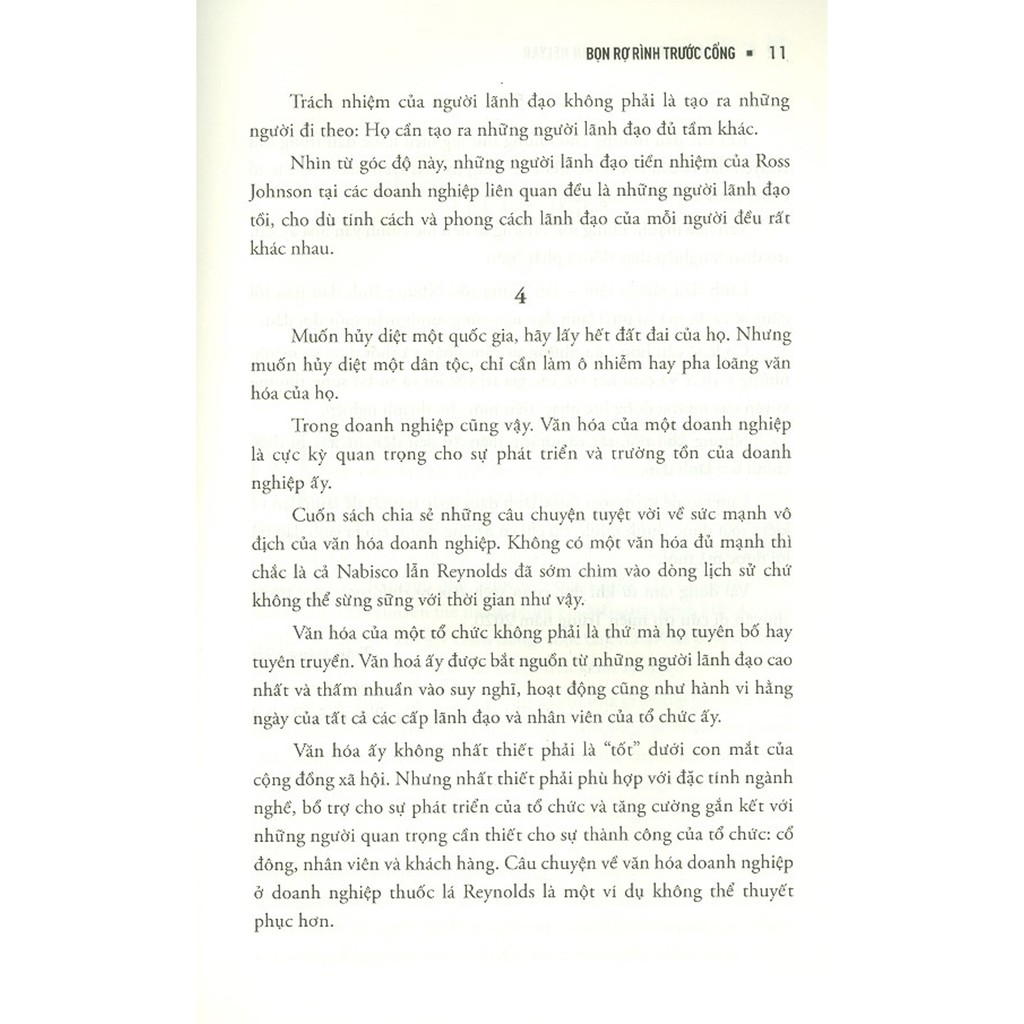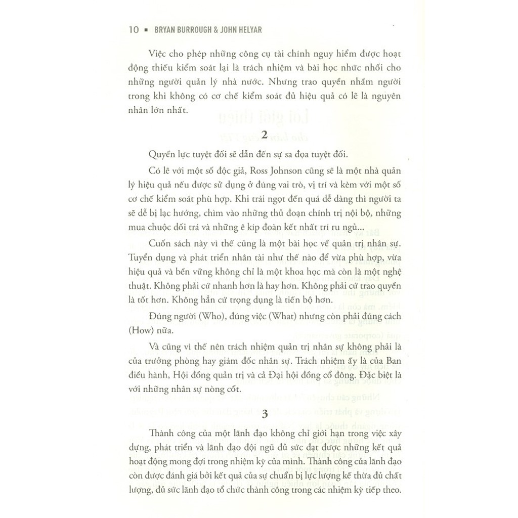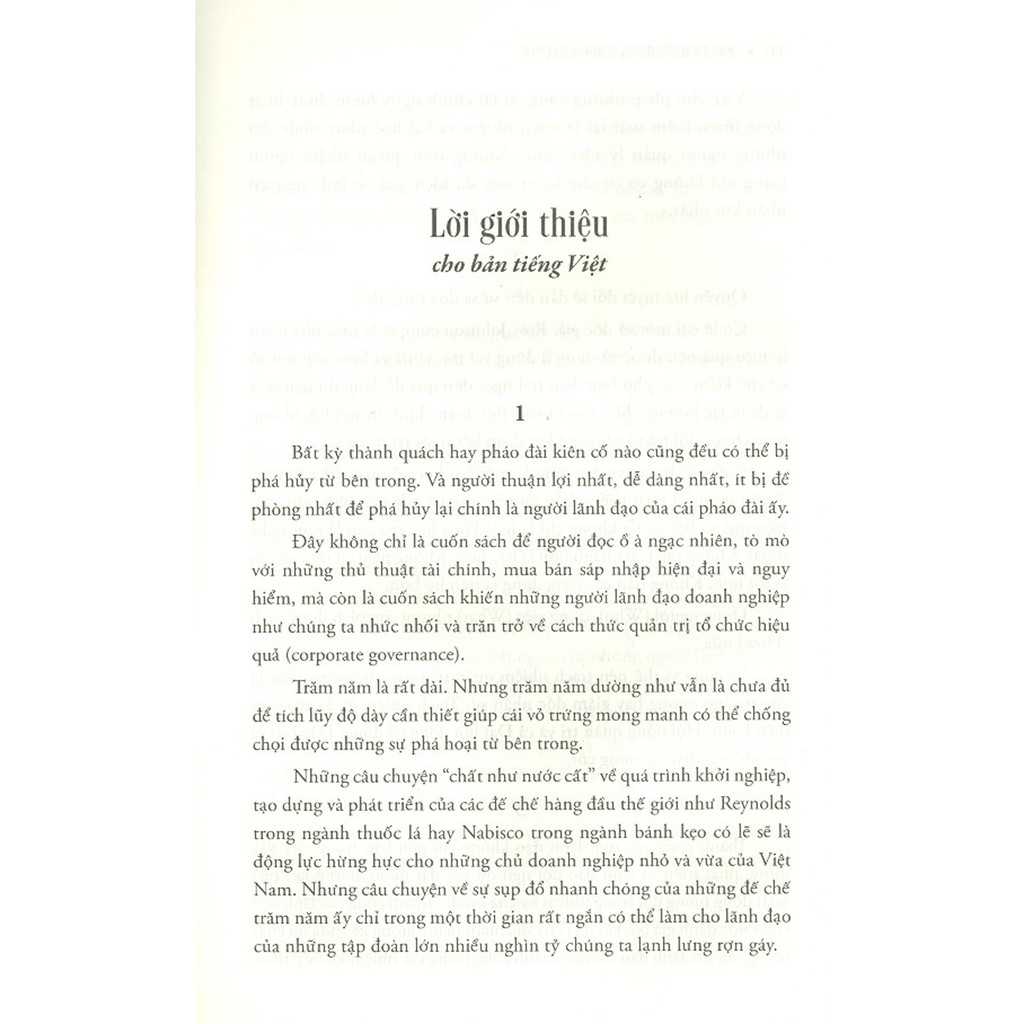 Sách – Barbarians At The Gate – Bọn Rợ Rình Trước Cổng Tác giả Bryan Burrough & John Helyar Nhà xuất bản NXB Công Thương Đơn vị phát hành Công ty Cổ phần Sách Alpha – Alphabooks Ngày xuất bản 11-2020 Số trang 816 Kích thước 16 x 24 cm Loại bìa Bìa cứng Nội dung “Cuốn sách Bọn rợ rình ở cổng là câu chuyện có thật về cuộc chiến giành quyền kiểm soát công ty bánh quy và thuốc lá Mỹ – RJR Nabisco – nhà sản xuất bánh quy Oreo và thuốc lá RJ Reynolds. Nội dung chính nói về việc mua lại có đòn bẩy (LBO) của tập đoàn RJR Nabisco với nhịp độ nhanh chóng và chi tiết, bao gồm cả những cuộc hội thoại riêng cũng như trong phòng họp giữa các CEO của các công ty. Cuốn sách thể hiện lòng tham đáng kinh ngạc của các chủ ngân hàng đầu tư, nhà quản lý công ty, nhà đầu tư cổ phần tư nhân, các cổ đông… Việc mua lại diễn ra được mở đầu bằng một cuộc chiến đấu thầu giữa ban lãnh đạo (do CEO Ross Johnson dẫn đầu), KKR, công ty cổ phần tư nhân lâu đời, và một số người chơi “nhỏ hơn”. Việc mua lại có đòn bẩy thường khiến công ty bị mua lại phải gánh rất nhiều nợ, đòi hỏi các nhà quản lý phải cắt giảm chi phí (thường bao gồm cả nhân sự) – đó là lý do tại sao những điều này không được nhân viên, công chúng và giới báo chí ưa chuộng. Khoản mua lại trị giá 25 tỷ đô la này, mà cuối cùng KKR đã giành được bởi cũng không khác gì, đặc biệt vì đây là LBO lớn nhất tại thời điểm đó. Những người phản đối nỗ lực mua lại công ty của Johnson, Henry Kravis và anh họ của ông ta là George R. Roberts, là những người tiên phong trong việc mua lại có đòn bẩy (LBO). Kravis là người đầu tiên mà Johnson nói chuyện về việc thực hiện LBO và cảm thấy bị phản bội sau khi biết rằng Johnson muốn thực hiện thỏa thuận với một công ty khác, bộ phận Shearson Lehman Hutton trước đây của American Express. Ted Forstmann và công ty mua lại Forstmann Little của ông cũng đóng một vai trò quan trọng. Khi lên nắm quyền điều hành RJR Nabisco và thấy giá cổ phiếu của công ty đang trì trệ, Ross Johnson đã tìm cách để có được giá trị lớn hơn cho các cổ đông của mình và cuối cùng đã được các cố vấn ngân hàng đầu tư (của Lehman Brothers) thuyết phục rằng ông nên thực hiện một vụ mua lại có đòn bẩy. Và ngay sau khi giá thầu được công bố, các nhà thầu cho công ty đã xuất hiện. KKR đã trở thành con mồi đầu tiên của LBO. Hầu như tất cả các ngân hàng đầu tư lớn đều tham gia với tư cách là cố vấn cho thương vụ này. Một số nhân vật quan trọng trong giới tài chính xuất hiện. Bruce Wasserstein, CEO của Lazard đã tham gia, cùng với Joe Perella, Eric Gleacher, Tom Hill. Sau khi Kravis và Johnson không thể dung hòa được sự khác biệt của họ, một cuộc chiến đấu thầu đã diễn ra mà cuối cùng Johnson sẽ thua. Tác dụng phụ đáng tiếc của việc tăng giá mua đối với các cổ đông là tạo ra mức nợ đáng lo ngại cho công ty. Cuốn sách bắt đầu chậm rãi với hơn 300 trang xây dựng bối cảnh cho các nhân vật chính và mô tả lịch sử của RJR Nabisco. Sau đó, nó đẩy nhanh tốc độ và sự kịch tính qua các cuộc hội thoại, thời gian và giọng điệu của nhân vật.”