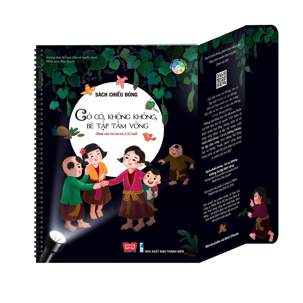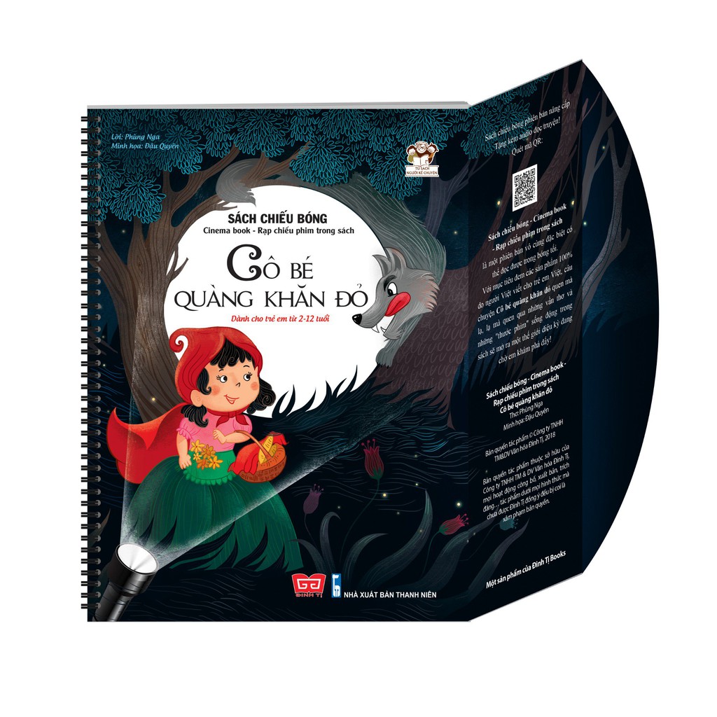 Bộ Sách chiếu bóng – Cinema book – Rạp chiếu phim trong sách Tác giả: Lời Phùng Nga/ Minh họa Đậu Quyên Khác Độ tuổi: 2-12 tuổi Kích thước: 20.5×15.5cm Năm xuất bản: 2018 Số trang: 14 Khối lượng: 200 grams Sách chiếu bóng phiên bản nâng cấp Tặng kèm audio đọc truyện! Quét mã QR: CHÍNH THỨC PHÁT HÀNH: SÁCH CHIẾU BÓNG ĐẦU TIÊN CỦA NGƯỜI VIỆT NAM VIẾT CHO TRẺ EM VIỆT NAM Báo Sài Gòn giải phóng mới đưa tin về một thực trạng “nhập siêu” báo động của văn học Việt Nam. Rằng chúng ta đang thua ngay trên sân nhà, khi số lượng tác phẩm văn học Việt được dịch ra nước ngoài so với số tác phẩm nước ngoài dịch và phát hành tại Việt Nam chỉ như muối bỏ biển. Lĩnh vực sách văn học là vậy, lĩnh vực sách thiếu nhi lại càng vậy. Chúng ta có sẵn những quyển sách thiếu nhi best-seller trên Amazon được chuyển ngữ sang tiếng Việt, nhưng không có sẵn nhiều cuốn sách của tác giả Việt Nam viết cho trẻ em Việt Nam. Đó là trăn trở của Đinh Tị Books – của những người làm sách khi luôn muốn kể lại cho trẻ em mình những truyền thống đẹp, những bông hoa, ngọn cỏ đặc trưng của dải đất chữ S mà không nơi nào trên địa cầu có được. Để dạy trẻ về màu đỏ người Mỹ sẽ nhắc đến quả “cherry”, nhưng chúng tôi lại cứ muốn đưa thêm vào sách những “bông hoa phượng vĩ”. Cùng với tâm thế như vậy, bộ sách Mặt nạ của Đinh Tị, sách Lật mở khám phá, sách 30 ngày cùng con học hiểu về chống xâm hại, sách Chuyển động đếm số,… và nay là bộ SÁCH CHIẾU BÓNG – CINEMA BOOK đã ra đời. Sách chiếu bóng – Cinema book, song ngữ Việt – Anh, có chất liệu sáng tác từ dân gian Việt Nam, với kết cấu cải tiến giúp giải phóng đôi bàn tay để đem lại cho độc giả một trải nghiệm đọc tiện lợi nhất, được lấy cảm hứng từ chính “màn đêm” vẫn luôn ẩn chứa nhiều điều sợ hãi với con trẻ. Bóng tối là 2 chữ ám ảnh tuổi thơ và giấc ngủ của nhiều em bé. “Mẹ ơi, đừng tắt đèn con sợ; mẹ ơi con mơ thấy quái vật ghê lắm; mẹ ơi, đừng bỏ con lại một mình trong phòng… là câu nói chắc hẳn bố mẹ nào cũng quen tai. Thay vì phớt lờ, thay vì cho rằng đó là một nỗi sợ vẩn vơ khi con lớn rồi sẽ hết, chúng ta hãy tranh thủ cơ hội biến nỗi sợ màn đêm thành sự háo hức mỗi tối. Biến bức tường vốn chỉ có màu đen trở thành một màn chiếu phim sống động. Tất cả chỉ với một cuốn sách Chiếu bóng – Cinema book 126k.