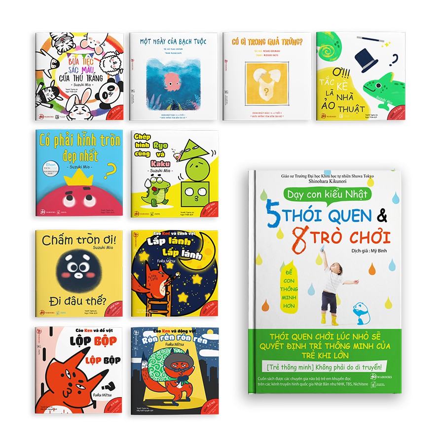 Công ty phát hành: Wabooks Nhà xuất bản: NXB Lao động – Xã hội Loại bìa: Bìa mềm Số trang: 224 trang (Dạy con kiểu Nhật), 24 trang/cuốn (các cuốn còn lại) Năm xuất bản: 2019 Màu sắc Bố sách ehon Màu sắc gồm bốn cuốn: “Ơ!!! Tắc kè là nhà ảo thuật”, “Bữa tiệc màu sắc của thú trắng”, “Có gì trong quả trứng?” và “Một ngày của Bạch Tuộc”, là lựa chọn tuyệt vời cho trẻ từ 0 – 6 tuổi tại Nhật Bản. Mỗi cuốn lại là một câu chuyện nhỏ khác nhau, mang trong mình vai trò phát triển khả năng nhận biết màu sắc của trẻ._x000D_ Sứ mệnh của bộ sách ehon Màu sắc là phát triển chức năng thùy chẩm của trẻ – một bộ phận nằm phía sau của bộ não con người, giúp con nuôi dưỡng năng khiếu nghệ thuật, học tốt các môn học liên quan đến nghệ thuật như văn học, hội họa, âm nhạc… Âm thanh Bộ sách ehon Âm thanh gồm ba cuốn sách là “Cáo Ken và Đồ Vật”, “Cáo Ken và Cảnh Vật”, “Cáo Ken và Động Vật”, tăng cường khả năng ghi nhận, tiếp thu âm thanh, khiến âm thanh trở nên sinh động, hấp dẫn với trẻ hơn bao giờ hết nhé! Câu chuyện Cáo Ken tìm hiểu thế giới âm thanh góp phần giúp bé phát triển phần thùy Thái Dương – phần não bộ có chức năng điều khiển ngôn ngữ nói, nghe, cảm xúc với âm nhạc, âm thanh, ngữ điệu và phát triển cảm xúc. Nuôi dưỡng, phát triển thùy Thái Dương bằng cách cho con đọc ehon sẽ khiến ngôn ngữ của trẻ sẽ trở nên phong phú, đồng thời khả năng ghi nhớ cũng như tăng sự tự tin vào bản thân hơn. Hình khối Bộ sách ehon “Điều kỳ diệu của những hình khối” bao gồm có 3 cuốn: “Chấm tròn ơi đi đâu thế?”, “Có phải hình tròn là đẹp nhất?”, “Ghép hình cùng Ryo và Kaku” đem đến sự lựa chọn hoàn hảo cho bố mẹ khi vừa cho con cơ hội tiếp xúc với sách ngay trong độ tuổi từ 0-6, nội dung chứa đựng câu chuyện về các hình khối để trẻ nhận biết thế giới xung quanh, nhằm phát triển trí thông minh cho trẻ. Bộ sách này đóng vai trò phát triển phần thùy đỉnh của não bộ, xử lý thông tin giác quan từ những phần khác nhau của cơ thể, giúp hình thành khả năng tổng hợp phân tích về giác quan, nhận dạng các vật thể và hình học không gian; phụ trách khả năng toán học và giúp con nhận biết cảm xúc thông qua biểu cảm khuôn mặt. Lớn lên con sẽ có chỉ số EQ cao, thế giới nội tâm phong phú và tư duy thẩm mỹ độc đáo. Dạy con kiểu Nhật – 5 thói quen và 8 trò chơi Cuốn sách Dạy Con Kiểu Nhật – 5 Thói Quen Và 8 Trò Chơi Để Con Thông Minh Hơn sẽ cung cấp cho các cha mẹ phương pháp nuôi dạy con trẻ thông minh, được đúc kết từ các nghiên cứu về sự phát triển não bộ của trẻ nhỏ qua các trắc nghiệm tâm lý lâm sàng. 5 thói quen luyện tập cho sự phát triển não bộ của bé 8 trò chơi hằng ngày giúp bé luyện tư duy cực nhanh #wabooks, #ehon, #sachchocon, #sachtreem #sachthieunhi #sachchobe #dayconkieunhat #sáchchobé #sáchchocon #sáchthiếunhi #sáchtrẻem #sáchnuôidạycon #dạyconkiểunhật #sachnuoidaycon