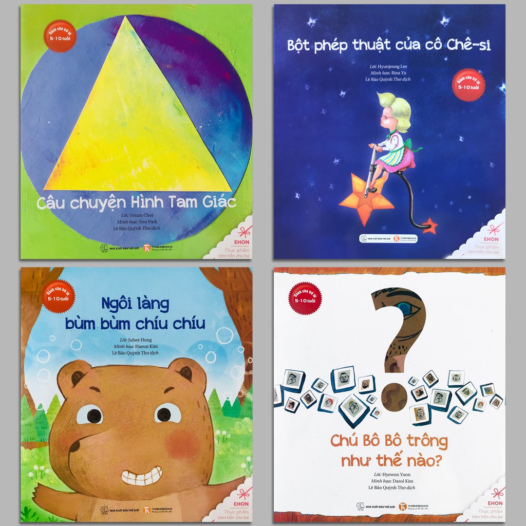 Ehon Thực Phẩm Tâm Hồn Cho Bé (Lẻ tùy chọn) dành cho trẻ từ 5 – 10 tuổi Bộ 4 quyển lẻ bao gồm: 1. Nuôi Dưỡng Ước Mơ Và Tình Yêu Thương Cho Bé – Câu Chuyện Hình Tam Giác 2. Nuôi Dưỡng Ước Mơ Và Tình Yêu Thương Cho Bé – Ngôi Làng Bùm Bùm Chíu Chíu 3. Nuôi Dưỡng Ước Mơ Và Tình Yêu Thương Cho Bé – Bột Phép Thuật Của Cô Chê-Si 4. Nuôi Dưỡng Ước Mơ Và Tình Yêu Thương Cho Bé – Chú Bô Bô Trông Như Thế Nào? Nội dung mỗi cuốn đưa ra một chủ đề và đặt ra những câu hỏi: “Tại sao? Như thế nào? Nếu…thì làm sao? Đã từng…chưa?…” để cho bé suy ngẫm. Việc đặt ra câu hỏi giúp bé kích thích trí tò mò, hình thành thói quen tư duy. ~~~~~ Công ty phát hành: Thái Hà Tác giả: Haeun Kim, Rina Yu, Dasol Kim, Yisu Park Ngày xuất bản: 06.2018 Kích thước: 21×23 cm Nhà xuất bản: NXB Thế Giới Loại bìa: Bìa mềm Số trang: 35 trang/quyển —