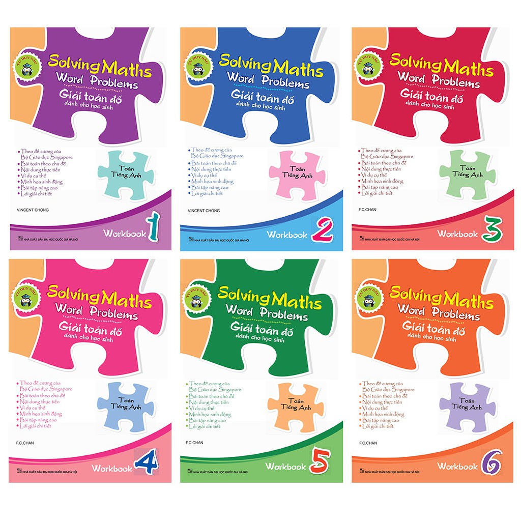 Sách : Solving Maths Word Problems – Giải Toán Đố Dành Cho Học Sinh (Bộ 6 Cuốn Workbook) Bộ sách Solving Maths Word Problems – Giải toán đố dành cho học sinh được biên soạn theo Đề cương của Bộ Giáo dục Singapore, mang lại những kĩ năng tư duy giải toán đố đa dạng và bổ ích, giúp các em tiếp cận với nền giáo dục tiên tiến thế giới, đồng thời phát huy được khả năng Tiếng Anh của bản thân. Các bài toán được nhóm theo chủ đề với ví dụ cụ thể, hình ảnh minh họạ sinh động, lời giải chi tiết mô phỏng từng bước quá trình tư duy. Riêng các cuốn từ tập 3 đến tập 6 có thêm phần Ghi chú (Notes) giải thích ngắn gọn những khái niệm quan trọng. Mỗi cuốn sách cung cấp một lượng kiến thức vừa đủ, nội dung gần gũi với thực tế và cuộc sống hàng ngày. Các bài toán nâng cao đòi hỏi kĩ năng tư duy ở mức độ cao hơn được đánh dấu bằng biểu tượng bánh răng. Phần Ôn tập (Revision) sẽ giúp các em rà soát lại quá trình học của mình. Lời giải chi tiết, mạch lạc, rõ ràng tạo điều kiện thuận lợi cho các em tự học, hiểu và nắm vững được các phương pháp trình bày và tính toán. Bộ sách chắc chắn sẽ là một công cụ tuyệt vời giúp các em tự tin và nâng cao hiệu quả trong việc học Toán và Tiếng Anh. 1. Solving Maths Word Problems – Giải Toán Đố Dành Cho Học Sinh – Workbook 1 2. Solving Maths Word Problems – Giải Toán Đố Dành Cho Học Sinh – Workbook 2 3. Solving Maths Word Problems – Giải Toán Đố Dành Cho Học Sinh – Workbook 3 4. Solving Maths Word Problems – Giải Toán Đố Dành Cho Học Sinh – Workbook 4 5. Solving Maths Word Problems – Giải Toán Đố Dành Cho Học Sinh – Workbook 5 6. Solving Maths Word Problems – Giải Toán Đố Dành Cho Học Sinh – Workbook 6 Thông tin sản phẩm: Tác giả : Vicent Chong Nhà xuất bản: Đại Học Quốc Gia Hà Nội Kích thước : 19 x 26 cm Năm xuất bản : 2018 Khối lượng : 1800 grams Bìa : bìa mềm