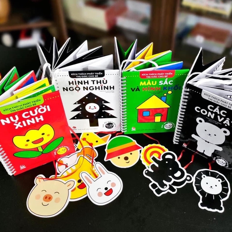 Các bác Kim Đồng suốt ngày khoe sách mới hay ho thế này, em lại không cầm lòng được. Sách dành cho lứa tuổi sơ sinh không nhiều, sách chất lại càng ít, nên bộ sách mở ra như cái đèn lồng, cái để treo nôi này dự là sẽ khiến các mẹ và bé mê tít cho mà xem. Bộ có 4 cuốn, 2 cuốn màu chủ đạo đen trắng, giúp kích thích phát triển thị giác rất rất phù hợp cho các bé mới sinh từ 0-3 tháng, 2 cuốn còn lại, màu sắc tươi vui đáng yêu cực kỳ, cho các bé 3-12 tháng hoặc mẹ cháu chơi cũng hay :)) Mời các mẹ cùng ngắm nhé! À bộ này hợp làm quà tặng khi đi thăm em bé mới sinh lắm luôn các mẹ nhé! Món quà không thể chất hơn ❤ Bộ sách KÍCH THÍCH PHÁT TRIỂN THỊ GIÁC CHO BÉ (4 cuốn) Nụ cười xinh Các con vật Màu sắc và hình khối Hình thù ngộ nghĩnh