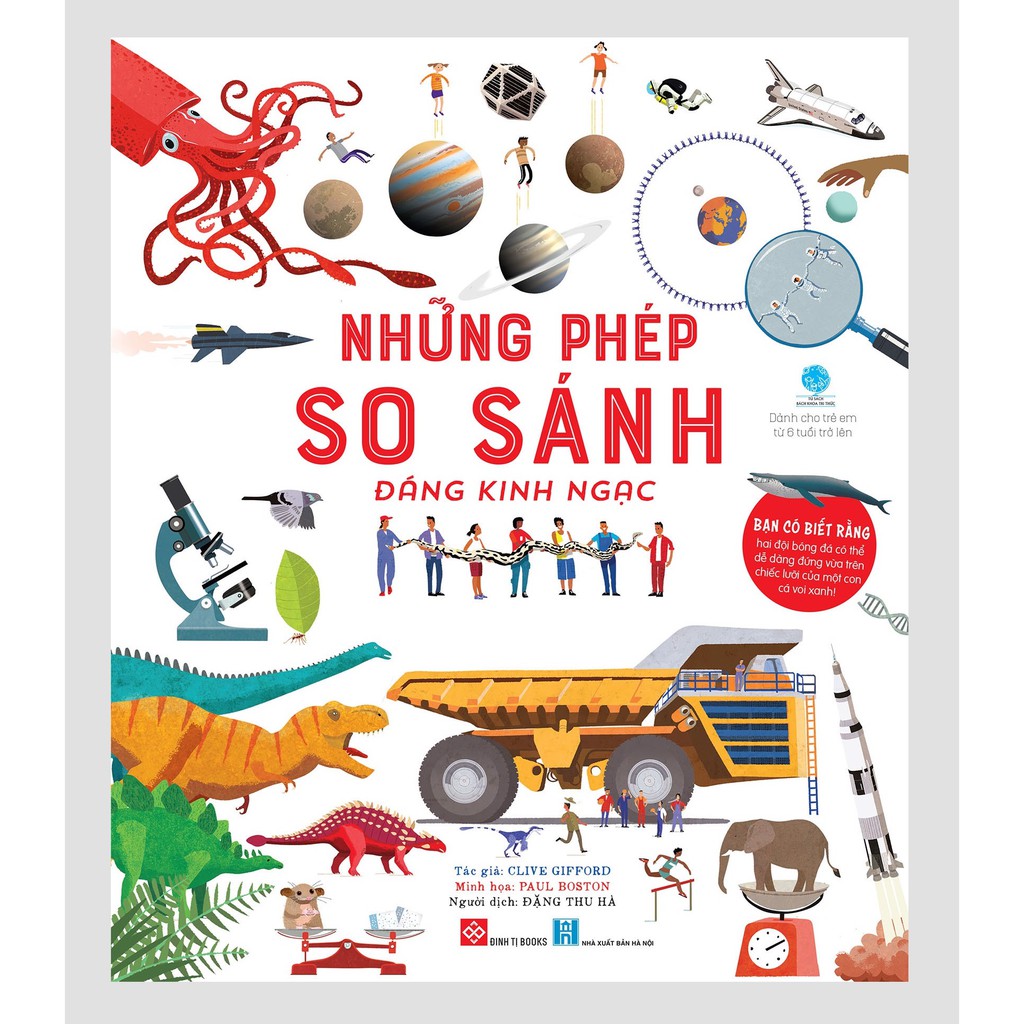 Mỗi ngày, chúng ta nhìn thấy và tiếp nhận vô số những hình ảnh khác nhau. Làm cách nào để não bộ với khả năng ghi nhớ có hạn có thể lưu giữ tất cả những điều đã nhìn thấy? Bí quyết là hãy liên kết sự vật với những hình ảnh quen thuộc. Ví dụ, bạn hoàn toàn có thể so sánh chiều dài của một con cá voi xanh với chiều dài của một căn nhà di động, hay trái tim của một con cá voi xanh trưởng thành với kích thước của một chiếc xe ô tô nhỏ. Rất nhiều nghiên cứu đã chỉ ra rằng, con người thường có trí nhớ về hình ảnh tốt hơn so với trí nhớ từ ngữ, logic hoặc vận động. Đó cũng chính là cách mà cuốn sách “Những phép so sánh đáng kinh ngạc” giúp bạn ghi nhớ kích thước của vô số những con vật, đồ vật… trên hành tinh này và thậm chí cả trong vũ trụ. Bằng cách so sánh mọi thứ với những hình ảnh quen thuộc, gần gũi với con người, cuốn sách mở ra cách tư duy mới lạ, độc đáo, giúp thông tin đi vào não bộ vô cùng tự nhiên và nhanh chóng. Từ những thứ khổng lồ như các hành tinh, đến những sinh vật nhỏ bé mà bạn phải nhìn bằng kính hiển vi mới thấy được. Việc so sánh không chỉ giúp bạn nhớ nhanh, mà còn nhớ rất lâu về sau. Cùng những hình ảnh minh họa tuyệt đẹp, sinh động, màu sắc bắt mắt, “Những phép so sánh đáng kinh ngạc” là một cuốn sách thú vị, bổ ích không chỉ với trẻ em mà còn với cả người lớn. Hãy cùng tìm hiểu cách tư duy mới lạ giúp trẻ ghi nhớ thông tin dễ dàng qua cuốn sách này Tác giả: Clive Gifford ; Minh họa: Paul Boston Dịch giả: Đặng Thu Hà NXB Hà Nội Độ tuổi: 6 tuổi trở lên Kích thước: 25×29.6cm Năm xuất bản: 2020 Số trang: 96 trang ruột + 8 trang gác Cảm ơn bạn đã ghé qua tiệm sách Minh Vân. Chúc một ngày tốt lành! #nhungphepsosanhdangkinhngac #sachthieunhi