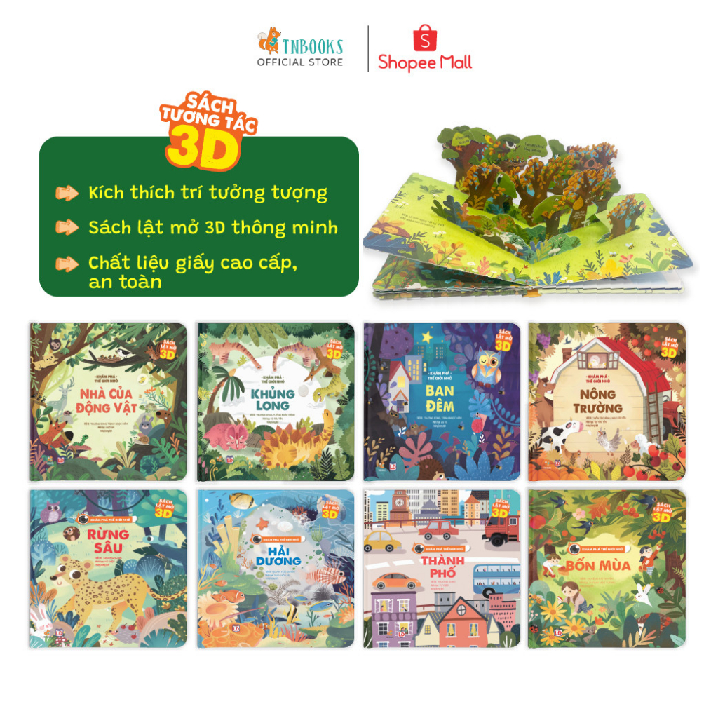 Bộ sách Tương Tác – Lật mở cho bé – Khám Phá Thế Giới Nhỏ Tác giả : Nhiều tác giả Dịch: Hoàng Dương NXB Lao động Nhà phát hành : TNBOOKS Kích thước: 18×16 cm Năm xuất bản: 2021 Số trang: 16 trang/cuốn Bộ sách sách tương tác gồm 8 cuốn : Khám Phá Thế Giới Nhỏ Ban đêm Khám Phá Thế Giới Nhỏ Khủng long Khám Phá Thế Giới Nhỏ Nông trường Khám Phá Thế Giới Nhỏ Nhà của động vật Khám Phá Thế Giới Nhỏ Rừng sâu Khám Phá Thế Giới Nhỏ Bốn mùa Khám Phá Thế Giới Nhỏ Hải dương Khám Phá Thế Giới Nhỏ Thành phố Ba mẹ có thể lựa chọn theo chủ đề cho bé: Chủ đề 1(TN0009.5) – Khám phá thế giới động vật ( gồm 4 cuốn: Nhà của động vật, Rừng sâu, Hải dương, Khủng long) Dành cho các bạn nhỏ yêu thích các loài động vật, thích tìm hiểu về cuộc sống, đặc điểm của các con vật trên cạn và dưới nước, quan sát tập tính và thói quen của chúng để thêm hiểu và nuôi dưỡng tình yêu với thế giới các loài vật, từ đó con học được cách yêu thương và nâng cao ý thức bảo vệ động vật, bảo vệ môi trường sống. Chủ đề 2(TN0009.6) – Khám phá cuộc sống ( gồm 4 cuốn : Bốn mùa, Ban đêm, Thành Phố, Nông trường ) Bộ sách thiết kế lật mở, hình ảnh mô hình 3D nổi, giúp con có cái nhìn thực tế hơn về thế giới xung quanh, con sẽ biết được 1 năm có 4 mùa, mùa xuân cây đơm hoa kết trái, thành phố có rất nhiều xe cộ, hay ở nông trường trồng những loại rau, củ quả nào, các bác nông dân thu hoạch lúa gạo thế nào nhỉ,… Thông qua từng trang sách lật mở, bộ sách tranh nhận biết “Khám phá thế giới nhỏ” đã đem cả thế giới rộng lớn bày ra trước mắt các em nhỏ. Xây một cây cầu giữa trẻ và tự nhiên, thỏa mãn trí tò mò vô tận của trẻ. Ngoài ra, ba mẹ có thể lựa chọn theo Combo cho bé: Combo 1(TN0009) gồm 4 cuốn: Khủng Long, Nông trường, Nhà của động vật, Ban Đêm Combo 2(TN0008) gồm 4 cuốn: Hải dương, Rừng Sâu, Thành phố, Bốn mùa Những trang sách với màu sắc đẹp mắt, hình ảnh minh họa sinh động, kích thích sự tương tác, chạm, lật mở, khám phá của trẻ. Thế giới rộng lớn được thu nhỏ qua lăng kính trẻ thơ, đúc kết những kiến thức chọn lọc vào từng miếng lật mở nhỏ xinh, độc đáo. Nào chúng mình cùng khám phá thế giới đẹp tươi qua từng trang sách độc đáo này nhé! #sachthieunhi #sachtuongtac #sachchobe #sachtuongtacchobe #sachchuyendong #sachtuongtacchobe #sachtruyenthieunhi
