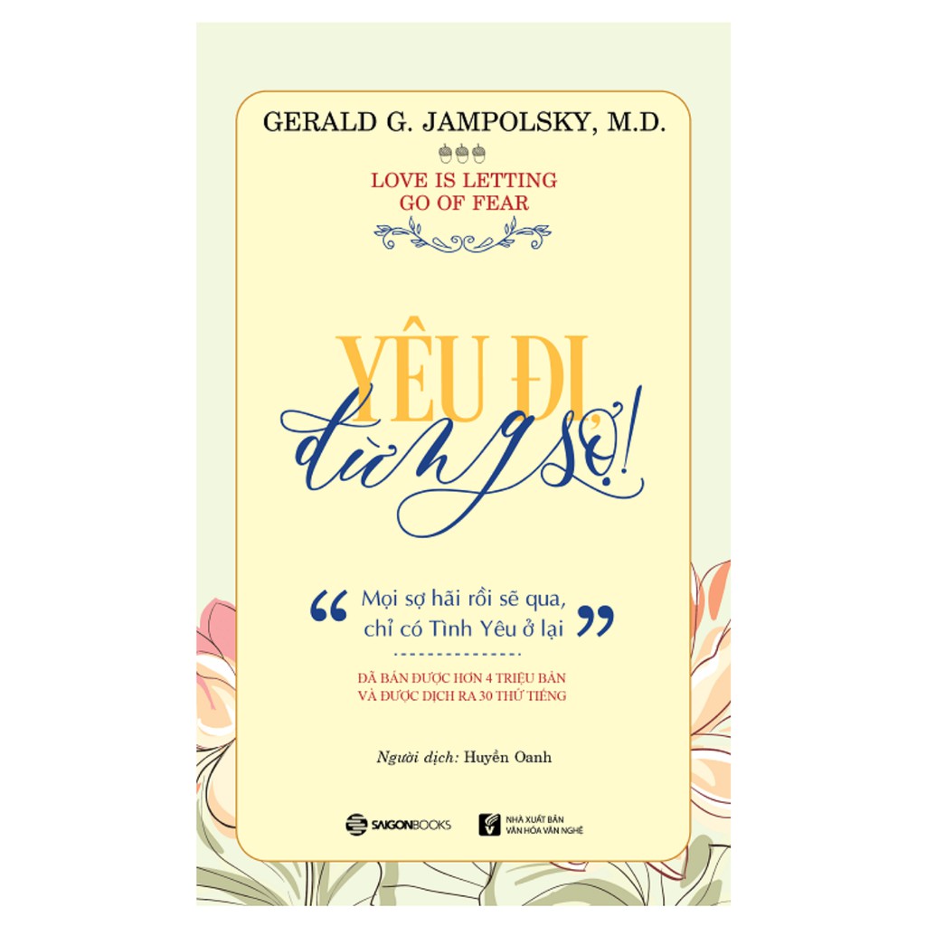 Nhà Phát Hành Saigon Books Tác giả Gerald G. Jampolsky, M.D NXB NXB Văn hóa Văn nghệ Năm XB 2018 Số trang 204 Quyển sách này được viết cho những ai muốn trải nghiệm sự chuyển hóa nhân cách, hướng tới cuộc sống tràn ngập ân sủng của Tạo Hóa và Tình Yêu, dẫn dắt chúng ta từng bước trải nghiệm những phép màu trong cuộc đời mình. “Yêu đi, đừng sợ! đã gieo vào lòng tôi những giai điệu chữa lành ngọt ngào và dịu dàng nhất. Những nguyên tắc nó nêu ra đã gây những ảnh hưởng sâu sắc lên tôi, làm cho tôi nhận ra mình nên làm sao để có thể nhìn nhận và yêu thương bản thân, cũng như bằng cách nào tôi có thể nâng niu những mối quan hệ giữa tôi và mọi người xung quanh, với toàn thể thế gian này. Quyển sách đã giúp tôi tìm thấy ý nghĩa thực sự của sự bình an nội tâm, của niềm vui và hạnh phúc… cùng những điều phước lành ẩn giấu sau mọi trải nghiệm tôi từng kinh qua trong đời, thậm chí là trong từng ý nghĩ tôi bắt lấy được vào những khoảnh khắc lạc quan, yêu đời. Quyển sách tuyệt vời này xuất bản lầu đầu vào năm 1979. Từ đó đến nay, nó vẫn phụng sự độc giả đúng với chức mệnh của nó: giúp đỡ hàng triệu bạn đọc trên khắp thế giới phát triển bản thân. Nó là liều thuốc bổ tâm hồn cho chúng ta vào những giai đoạn khó khăn và phức tạp trong đời. Tôi yêu sự rõ ràng, rành mạch và súc tích trong những bài học và nguyên tắc rèn luyện Tình Yêu và lòng khoan dung mà quyển sách nêu ra. Tôi cũng yêu cả những bức minh họa sinh động vì đã khiến tôi lắng lòng lại sau từng chặng đọc và phải suy ngẫm thật sâu để thấu cảm mọi lời khuyên dặn về Tình Yêu vượt lên nỗi sợ hãi.