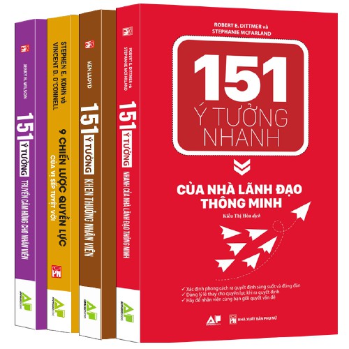 Công ty phát hành: An Phước Books Việt Nam Nhà xuất bản: NXB Phụ Nữ Tác giả: Nhiều tác giả Loại bìa: Bìa mềm Số trang: 320 Kích Thước: 13 x 20,5 Năm xuất bản: 2020 ……………………………………………………………….. GIỚI THIỆU SÁCH BỘ SÁCH NÂNG TẦM LÃNH ĐẠO Một người có tài lãnh đạo sẽ có tầm nhìn xa, khả năng dự đoán được những thay đổi trong tương lai một cách chính xác từ đó có thể đưa ra những chiến lược “đánh đâu thắng đó”. Tài lãnh đạo của một người bên cạnh được thiên phú còn đòi hỏi một quá trình học hỏi, tích lũy kinh nghiệm và dám đương đầu với khó khăn, thách thức. Bộ sách “Nâng tầm lãnh đạo” là những kiến thức quý báu mà các tác giả đúc kết từ kinh nghiệm chính của bản thân. Đây là bộ sách giúp các nhà lãnh đạo trau dồi và rèn luyện kỹ năng để trở thành nhà lãnh đạo tài ba. 1.151 Ý Tưởng Nhanh Của Nhà Lãnh Đạo Thông Minh 2..151 Ý Tưởng Khen Thưởng Nhân Viên 3.9 Chiến Lược Quyền Lực Cho Một Vị Sếp Tuyệt Vời 4.151 Ý Tưởng Truyền Cảm Hứng Cho Nhân Viên CHÚC CÁC BẠN ĐỌC SÁCH VUI VẺ!