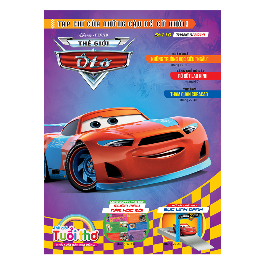Tạp Chí Thế Giới Tuổi Thơ – Thế Giới Ô tô phát hành định kì hằng tháng dành cho các bạn nam độ tuổi Tiểu học, với phần hình ảnh được mua bản quyền từ Disney, cùng nhiều nội dung khoa học, nghệ thuật, thể thao, giải trí, kĩ năng sống, tin tức học đường… giúp bạn đọc nhỏ tuổi vừa học vừa chơi. Số 110 phát hành tháng 9/2019 có 52 trang nội dung với các tin bài nổi bật như: – VÒNG QUANH THẾ GIỚI: Những cách đón mừng năm học mới thú vị khắp thế giới. – SÁNG CHẾ ĐÓ ĐÂY: Bình hoa chữa cháy, Rô bốt lau kính… – GẶP GỠ NHÂN VẬT PHIM CARS: Ryan Laney của đội Blinkr – KHÁM PHÁ: Những không gian trường học cực ngầu và sáng tạo như trường học hình mèo, lớp học trong máy bay… – TRUYỆN TRANH: Gặp gỡ McQueen Hăng Hái – THƯ VIỆN: ĐỌC SÁCH TRÔNG TRĂNG – Những cuốn sách hay dịp Trung Thu. – THẺ BAY: Khám phá quốc đảo Curacao. – XƯỞNG SÁNG TẠO: Đề thi vẽ sáng tạo hình bí ngô. – TRỔ TÀI CHẾ TẠO: Bục vinh danh. – Phát động thi vẽ THÀNH PHỐ XANH TƯƠNG LAI cho các bạn học sinh Tiểu học ở Hà Nội. – Trò chơi, hướng dẫn thủ công, poster về các nhân vật hoạt hình trong phim Cars.