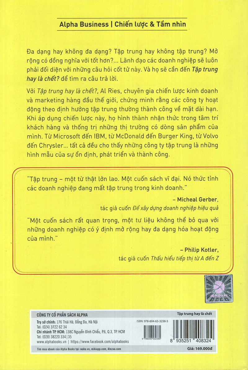 Tập Trung Hay Là Chết? (Tái Bản) Với Tập trung hay là chết?, Al Ries, chuyên gia chiến lược kinh doanh và marketing hàng đầu thế giới, chứng minh rằng các công ty hoạt động theo định hướng tập trung thường thành công về mặt dài hạn. Khi áp dụng chiến lược này, họ hình thành nhận thức trong tâm trí khách hàng và thống trị những thị trường có dòng sản phẩm của mình. Từ Microsoft đến IBM, từ McDonald đến Burger King, từ Volvo đến Cất cả đều cho thấy những công ty tập trung là những hình mẫu của sự ổn định, phát triển và thành công. Trên con đường phát triển của mình, một lúc nào đó doanh nghiệp sẽ đứng trước hai lựa chọn: phát triển theo chiều dọc, tức là tập trung vào dòng sản phẩm chính, đồng thời mở rộng nguồn cung cấp và kênh phân phối; hay theo chiều ngang, bằng cách đa dạng hóa mặt hàng đang sản xuất hoặc, thậm chí, mở thêm những ngành nghề mới không liên quan nhiều đến lĩnh vực kinh doanh ban đầu. Đâu là lựa chọn tối ưu cho doanh nghiệp? Đa dạng hay không đa dạng? Tập trung hay không tập trung? Mở rộng có đồng nghĩa với tốt hơn ? Lãnh đạo các doanh nghiệp sẽ luôn phải đối diện với những câu hỏi cốt tử này. Và họ sẽ cần đến Tập trung hay là chết để tìm ra câu trả lời.