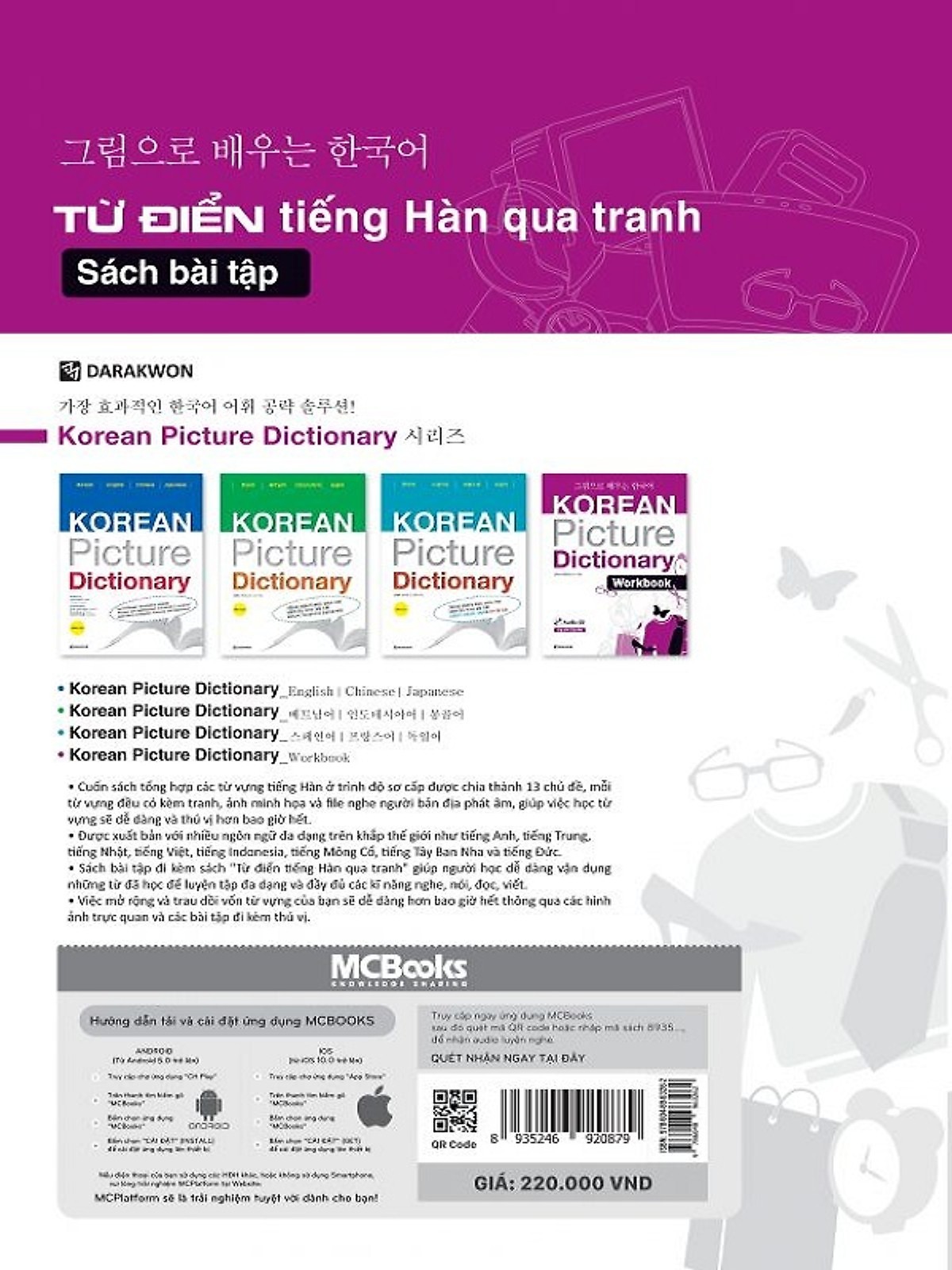 Với bất kỳ một ngôn ngữ nào, việc sử dụng từ điển trong quá trình học tập là không thể thiếu. Từ điển giúp người học có thể dễ dàng tra cứu từ vựng khi cần thiết. Tuy nhiên, những cuốn từ điển khô khan và chỉ bao gồm chữ sẽ khiến người học ít có hứng thú học hơn trong quá trình học từ vựng của mình. Những lý do điển hình khiến bạn gặp khó khăn trong quá trình học từ vựng: Khối lượng từ vựng đa dạng đồ sộ khiến bạn loay hoay trong việc ghi nhớ hết chúng Bạn gặp khó khăn trong việc học cách ghi nhớ từ vựng Những cuốn từ điển dày cộp chỉ có chữ và chữ khiến bạn phát ngán Học từ vựng theo cách cổ điển gần như không mang lại hiệu quả cao với bạn Nhằm đáp ứng nhu cầu trở thành cuốn từ điển học từ vựng hữu ích nhưng không gây khô khan như những cuốn từ điển thông thường, cuốn Từ điển tiếng Hàn qua tranh ra đời giúp bạn định hướng vốn từ vựng trong giao tiếp và gợi nguồn cảm hứng trong quá trình học. Lợi ích từ cuốn sách Từ điển tiếng Hàn qua tranh – Phương pháp học từ vựng theo chủ đề Cuốn Từ điển tiếng Hàn qua tranh – sách bài tập bao gồm 13 chủ đề lớn, mỗi chủ đề được thành 95 phần theo các phạm trù nhỏ hơn bám sát nhu cầu học từ vựng đa dạng nhiều chủ đề của người học trong thời gian gần đây. – Ba giai đoạn trong tiến trình học từ vựng Khác với những cuốn Từ điển khô khan thông thường, cuốn sách bài tập Từ điển tiếng Hàn qua tranh mang đến cho bạn một chu trình học tập. Cụ thể, ở mỗi bài đều được chia thành các giai đoạn: nhận biết, kiểm tra và nâng cao, vận dụng. Giai đoạn nhận biết: người học xem tranh và hiểu nghĩa của từ. Đây là giai đoạn kiểm chứng liệu người học có nhận biết được nghĩa của từ đã học hay không. Tham khảo sách Từ điển tiếng Hàn qua tranh, kết hợp với sách bài tập và luyện tập nhiều lần giúp bạn ghi nhớ nghĩa của từ hiệu quả. Giai đoạn kiểm tra và nâng cao: người đọc hiểu nghĩa và cách dùng của từ trong các ngữ cảnh khác nhau bằng cách luyện tập cùng các tài liệu thực tế như sự vật, mẩu quảng cáo,… và những từ vựng liên quan chúng. Việc luyện tập nhiều lần giúp người đọc có thể nâng cao và mở rộng vốn từ vựng và ghi nhớ lâu dài. Giai đoạn vận dụng: nâng cao năng lực sử dụng từ trong các tình huống giao tiếp. Cuốn sách cung cấp những cơ hội sử dụng từ vựng đã học thông qua các hoạt động nghe, nói, đọc, viết. Học cách sử dụng từ trong mạch văn thực tế có tác dụng giúp nâng cao khả năng sử dụng từ. – Tranh minh họa được thiết kế đa dạng, màu sắc ôn hòa, tạo cảm giác thoải mái và phản ánh đúng theo thực tế cuộc sống hàng ngày. Phương pháp học từ vựng qua tranh là phương pháp tối ưu hóa thời gian và tinh thần được ứng dụng phổ biến trong học ngôn ngữ hiện nay. Sử dụng tranh minh họa không chỉ giúp người học ghi nhớ từ vựng dễ dàng mà còn giúp mở rộng vốn từ vựng qua thông qua những liên tưởng bằng hình vẽ. Hy vọng, cuốn sách sẽ là lựa chọn tuyệt vời cho bạn đọc muốn chinh phục vốn từ vựng tiếng Hàn phong phú và mở rộng sự hiểu biết của mình về ngôn ngữ Hàn Quốc.