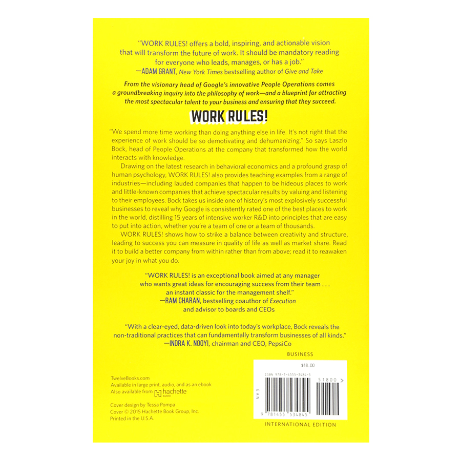 A New York Times and Wall Street Journal Bestseller Daily Telegraph, Huffington Post & Business Insider Top Business Book to Read ‘Every year, 2 million people apply for a job at Google – so what’s the secret?’ Guardian A compelling manifesto with the potential to change how we work and live, Work Rules! offers both a philosophy of the new world of work and a blueprint for attracting the most spectacular talent and ensuring the brightest and best prosper. The way we work is changing – are you? .